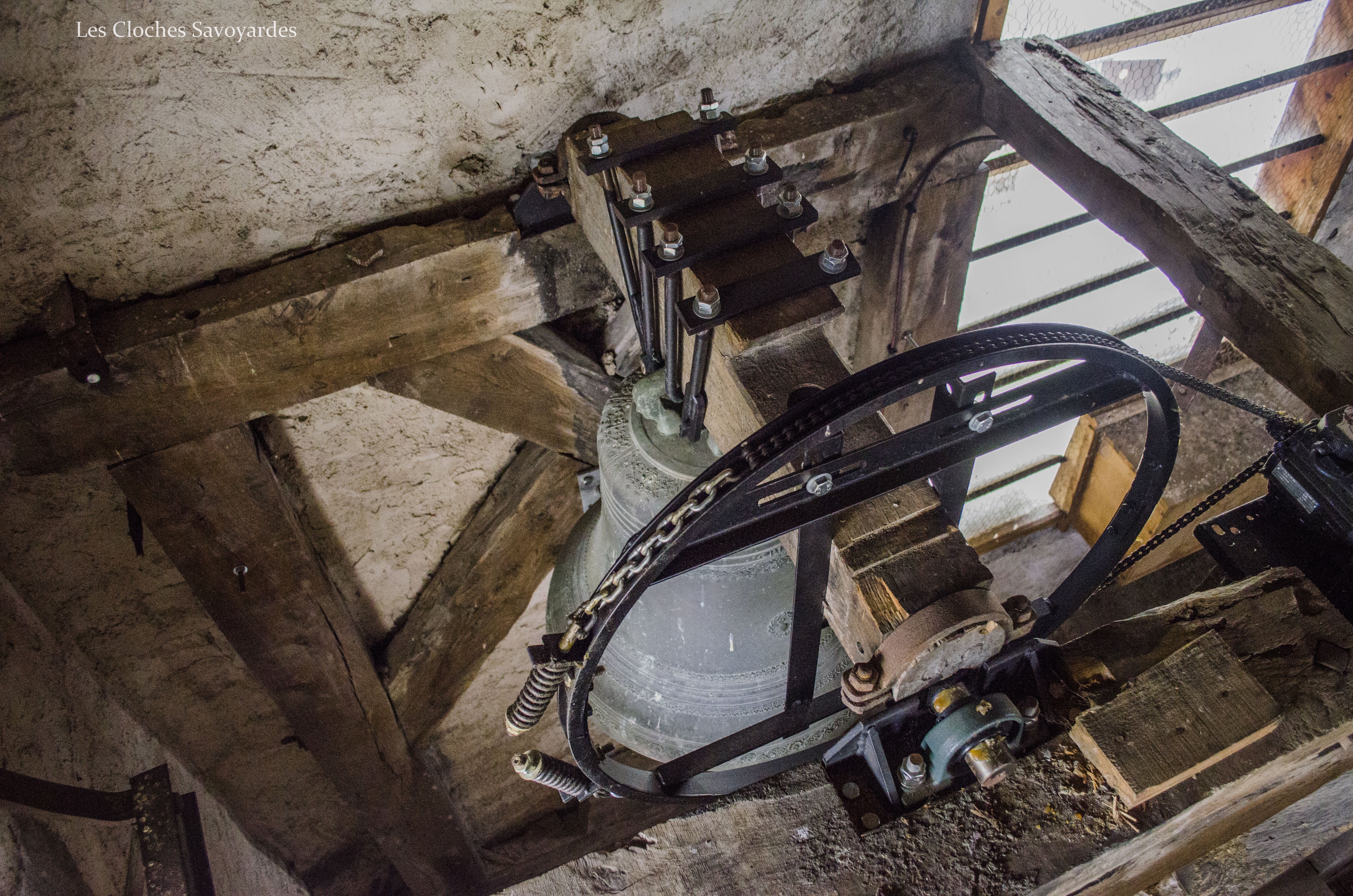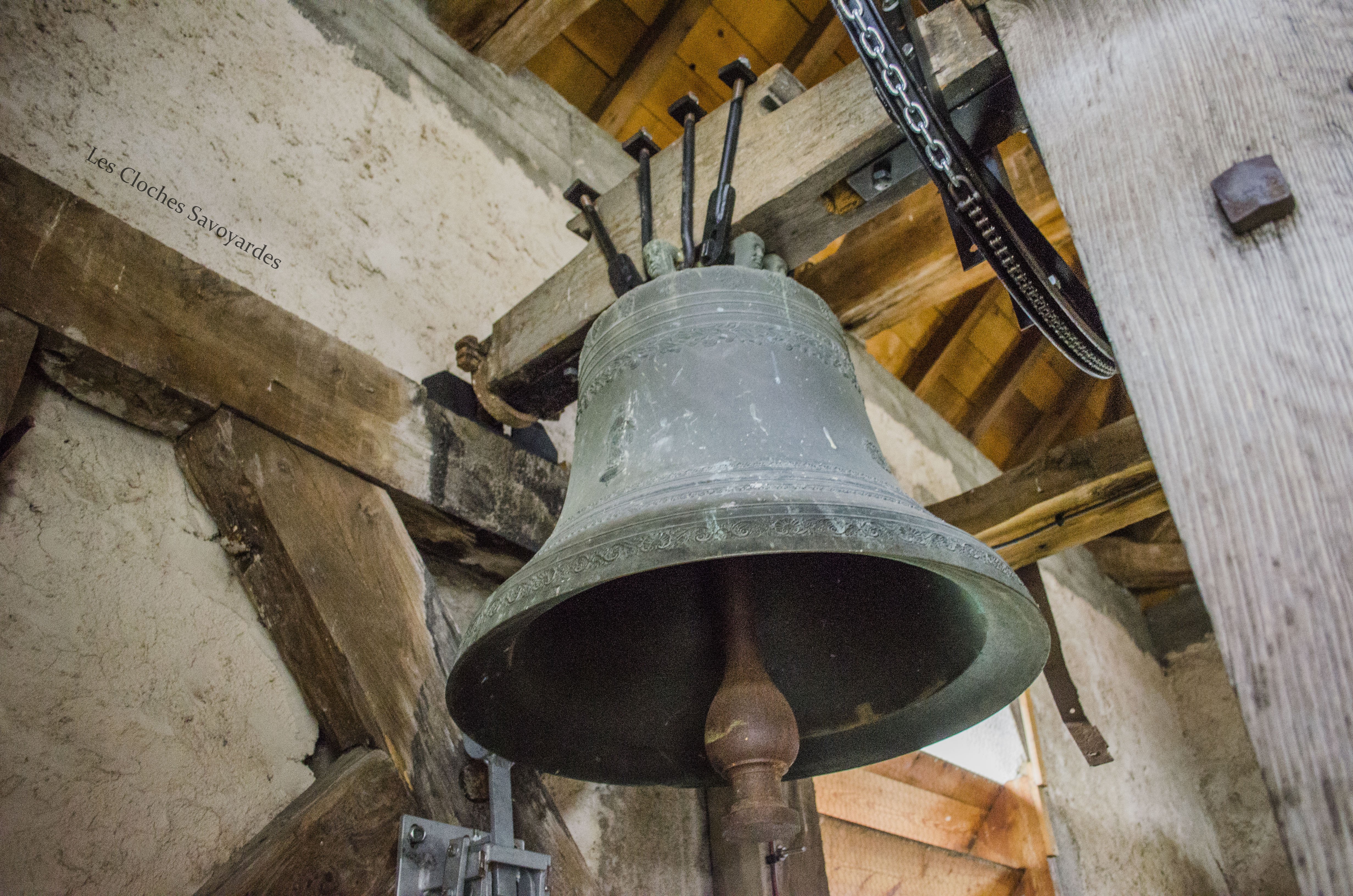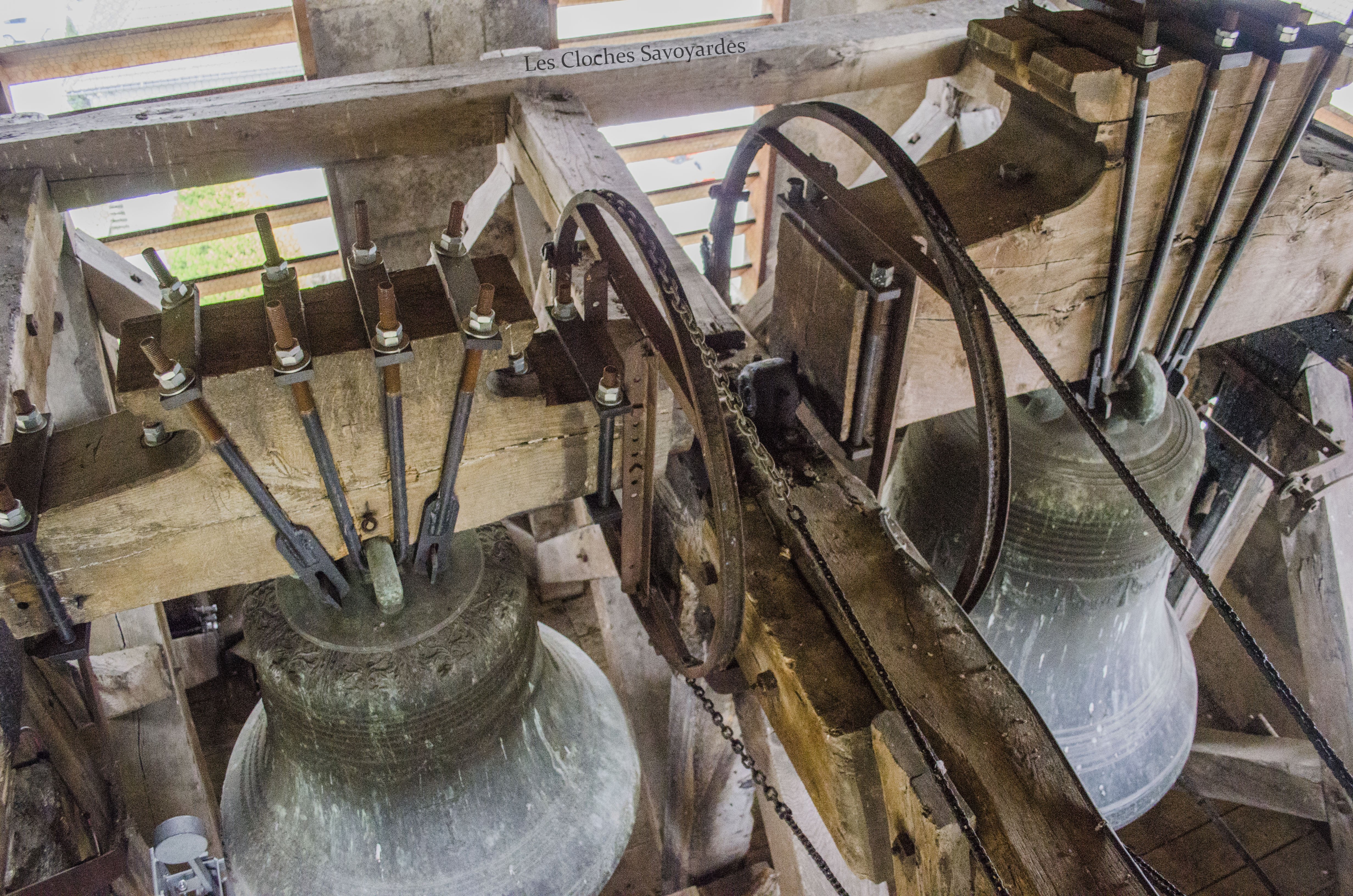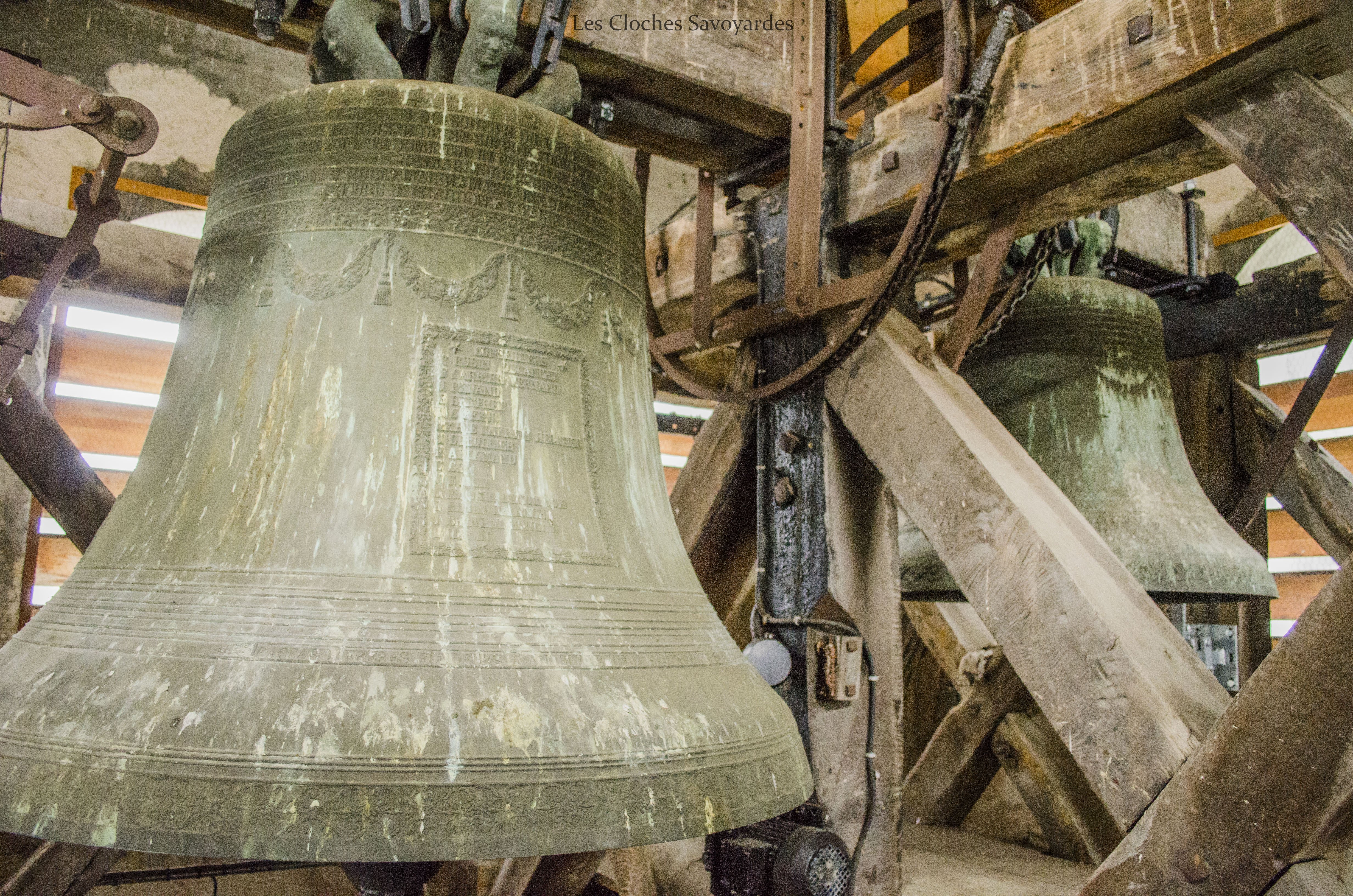 La tour clocher abrite trois cloches, toutes trois du XIXe siècle. Il est naturellement fort probable qu’elles se contentent de remplacer d’autres cloches, antérieures à la Révolution mais aussi du début du siècle industriel. Les archives pourraient certainement nous en apprendre d’avantage que les cloches qui ne mentionnent rien sur leurs ancêtres. La plus grande est aussi la plus ancienne. Datée de 1870, elle arbore fièrement le nom de « Marie Joséphine Pie ». On peut -entre autres- lire que la cloche a été fondue l’an du Concile Vatican I pour la paroisse Saint Sulpice et qu’elle avait pour parrain le maire de l’époque, J. Rubin. Les noms des conseillers de l’époque sont gravés. On peut entre autres voir les noms de « Joseph Déllulier », homonyme d’un paroissien présent lors de mes ascensions au clocher et « J. Mauris Demorioux », un parent de M. le Maire. Les deux plus petites cloches ont été ajoutées en 1894. La plus grande des deux porte le nom de « Josepha Sulpicia » et invoque Saint Sulpice, patron de la paroisse. La curiosité réside dans la plus petite « Leandra Mauritia » car elle invoque Saint Maurice, alors futur saint-patron de Marignier. Cette cloche était jadis muette car elle n’a pas été électrifiée comme ses grandes sœurs en 1935. En 2016, la commune de Marignier a investi pour mettre en sécurité son installation et équiper la cloche de moteurs afin qu’elle puisse accompagner ses grandes sœurs comme auparavant !