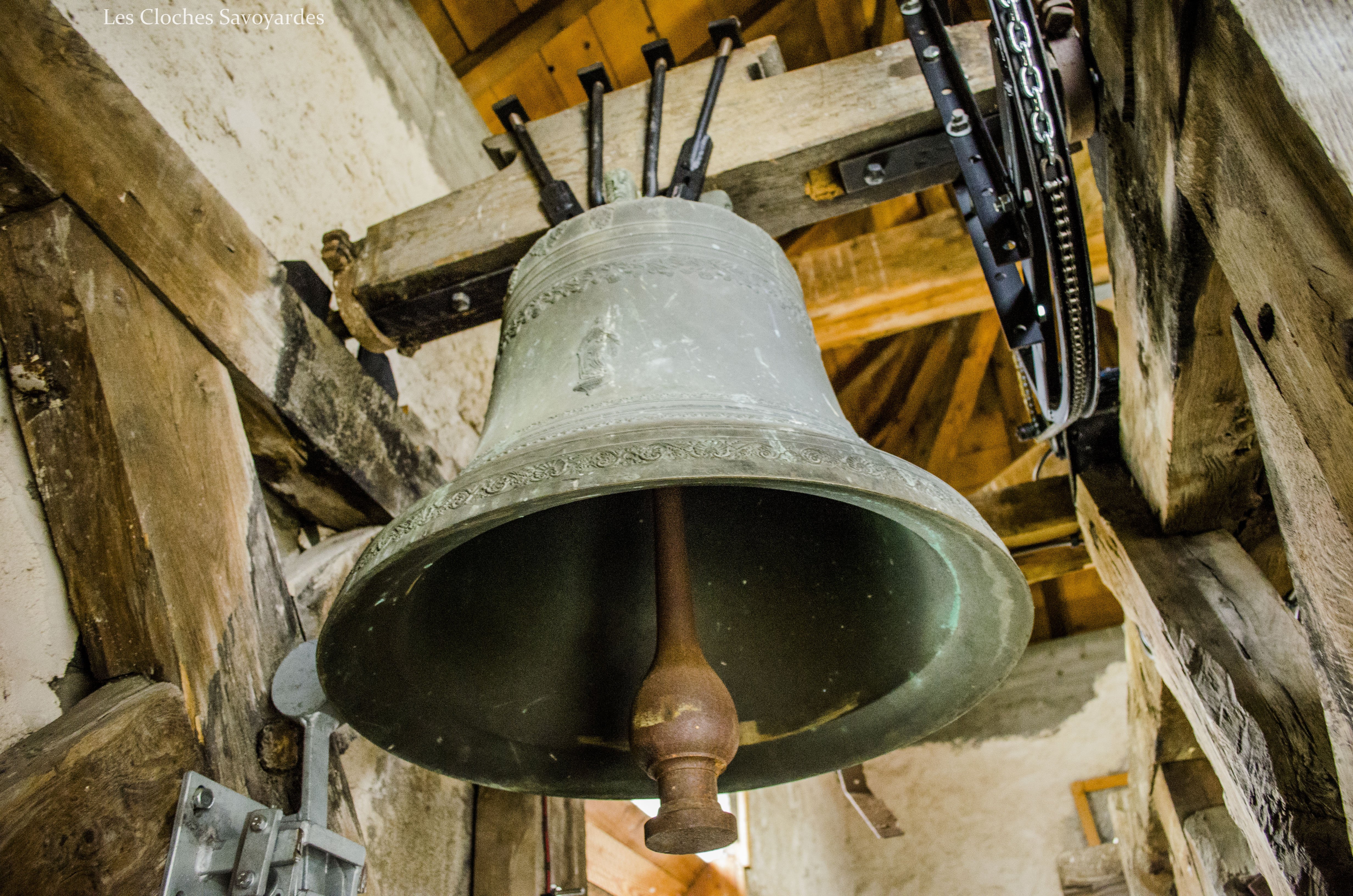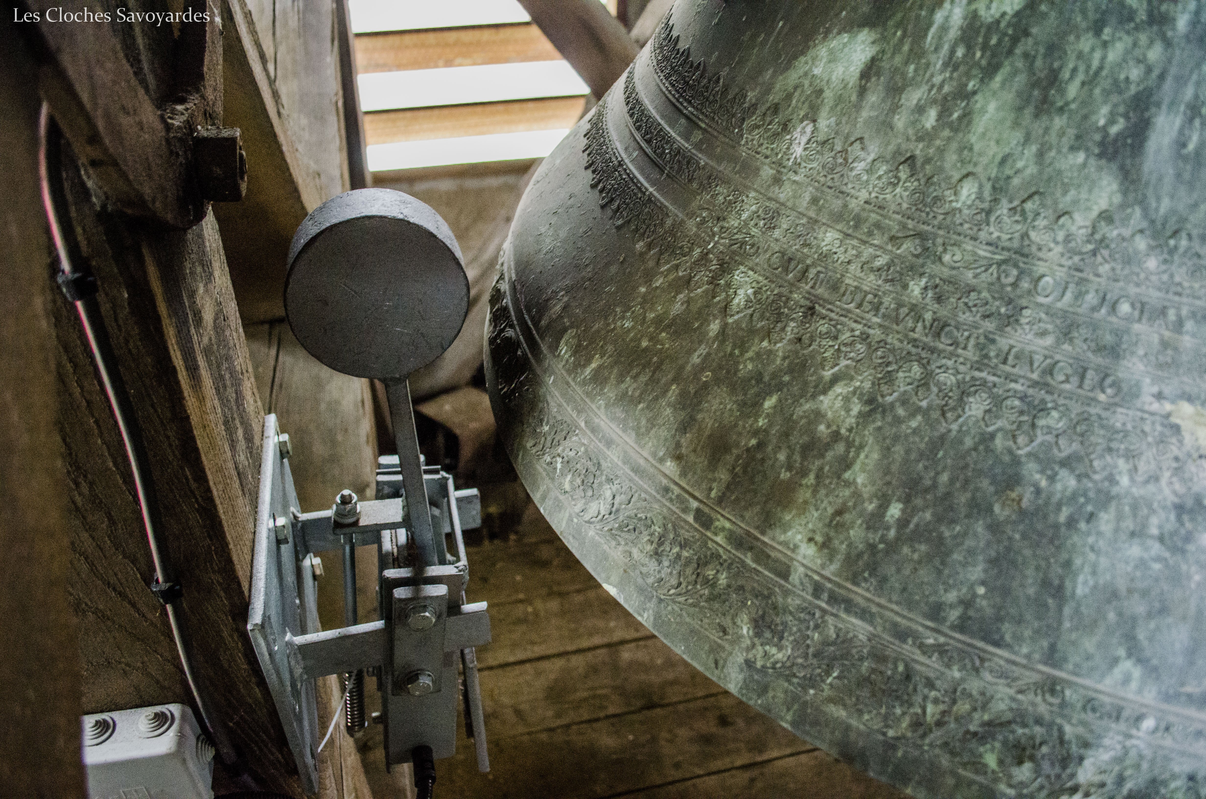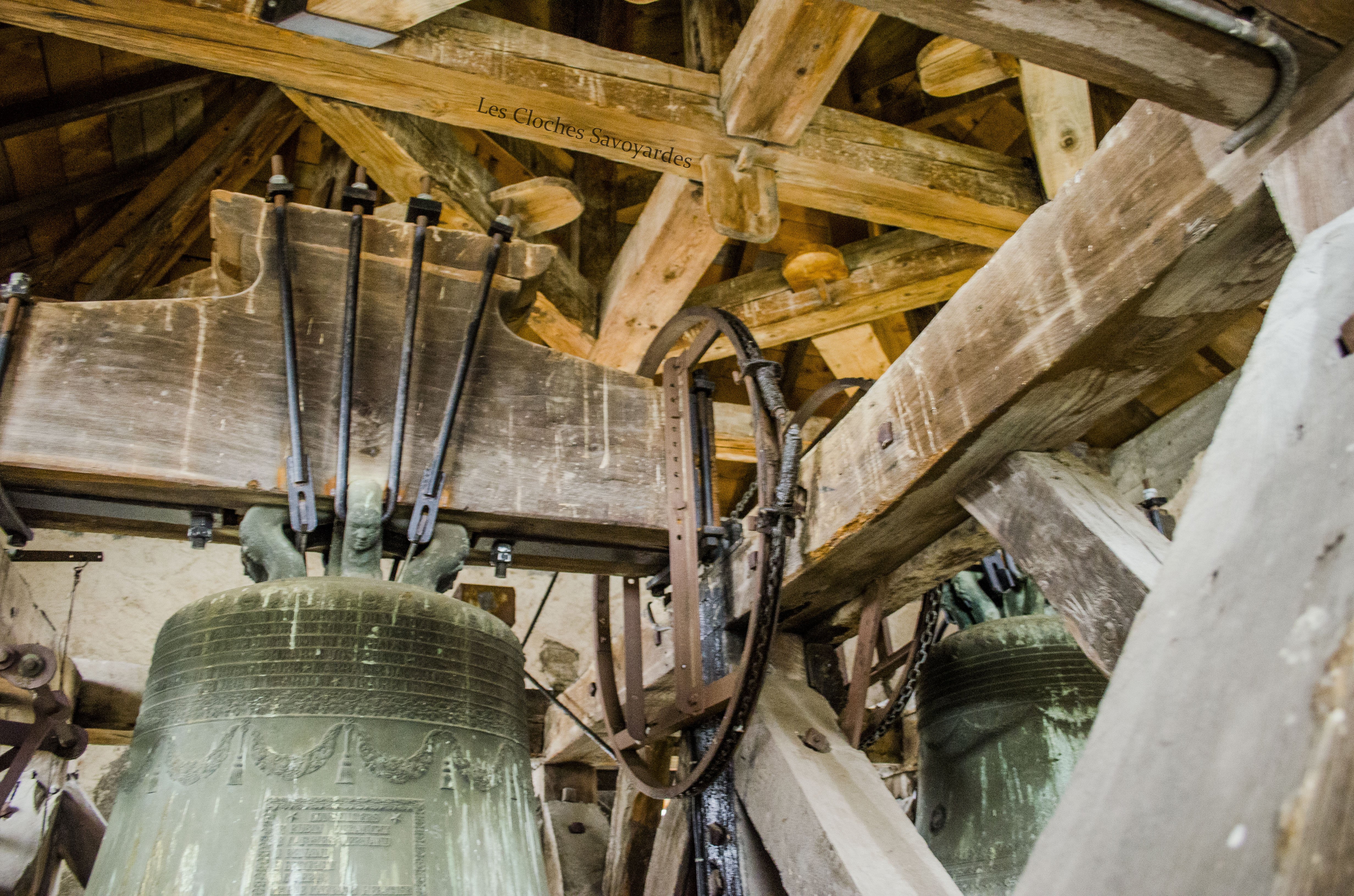La tour clocher abrite trois cloches, toutes trois du XIXe siècle. Il est naturellement fort probable qu’elles se contentent de remplacer d’autres cloches, antérieures à la Révolution mais aussi du début du siècle industriel. Les archives pourraient certainement nous en apprendre d’avantage que les cloches qui ne mentionnent rien sur leurs ancêtres. La plus grande est aussi la plus ancienne. Datée de 1870, elle arbore fièrement le nom de « Marie Joséphine Pie ». On peut -entre autres- lire que la cloche a été fondue l’an du Concile Vatican I pour la paroisse Saint Sulpice et qu’elle avait pour parrain le maire de l’époque, J. Rubin. Les noms des conseillers de l’époque sont gravés. On peut entre autres voir les noms de « Joseph Déllulier », homonyme d’un paroissien présent lors de mes ascensions au clocher et « J. Mauris Demorioux », un parent de M. le Maire. Les deux plus petites cloches ont été ajoutées en 1894. La plus grande des deux porte le nom de « Josepha Sulpicia » et invoque Saint Sulpice, patron de la paroisse. La curiosité réside dans la plus petite « Leandra Mauritia » car elle invoque Saint Maurice, alors futur saint-patron de Marignier. Cette cloche était jadis muette car elle n’a pas été électrifiée comme ses grandes sœurs en 1935. En 2016, la commune de Marignier a investi pour mettre en sécurité son installation et équiper la cloche de moteurs afin qu’elle puisse accompagner ses grandes sœurs comme auparavant !