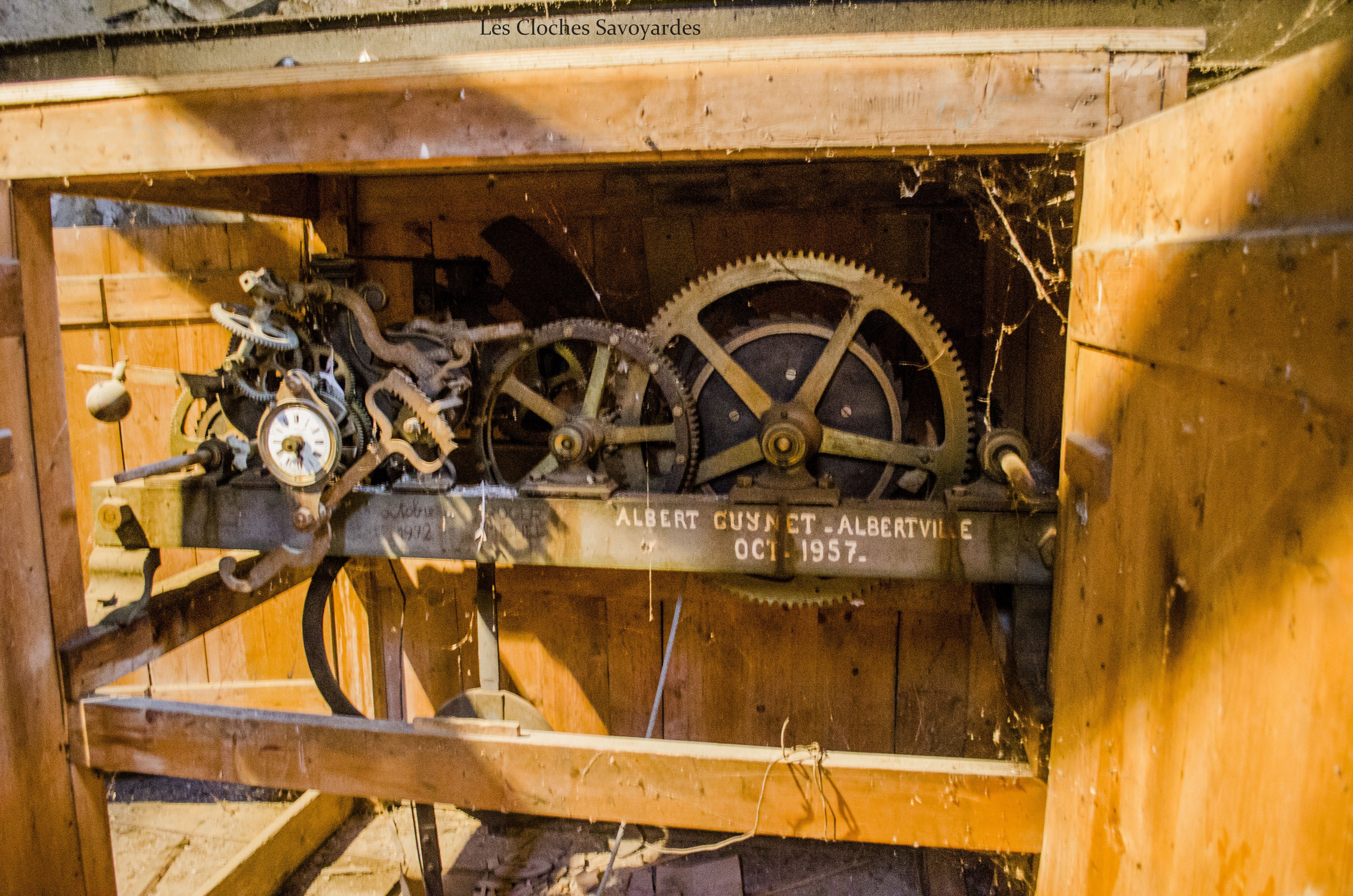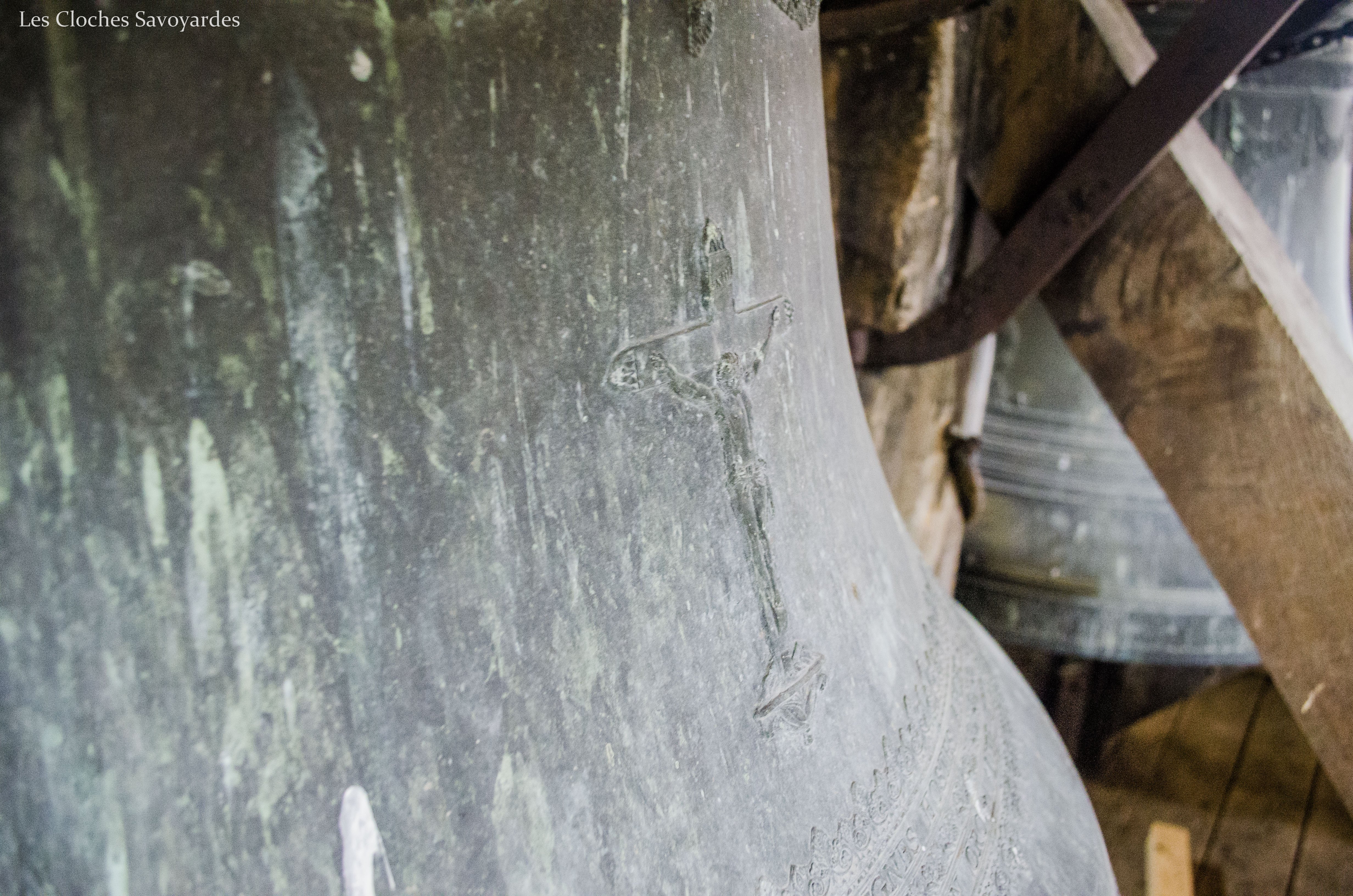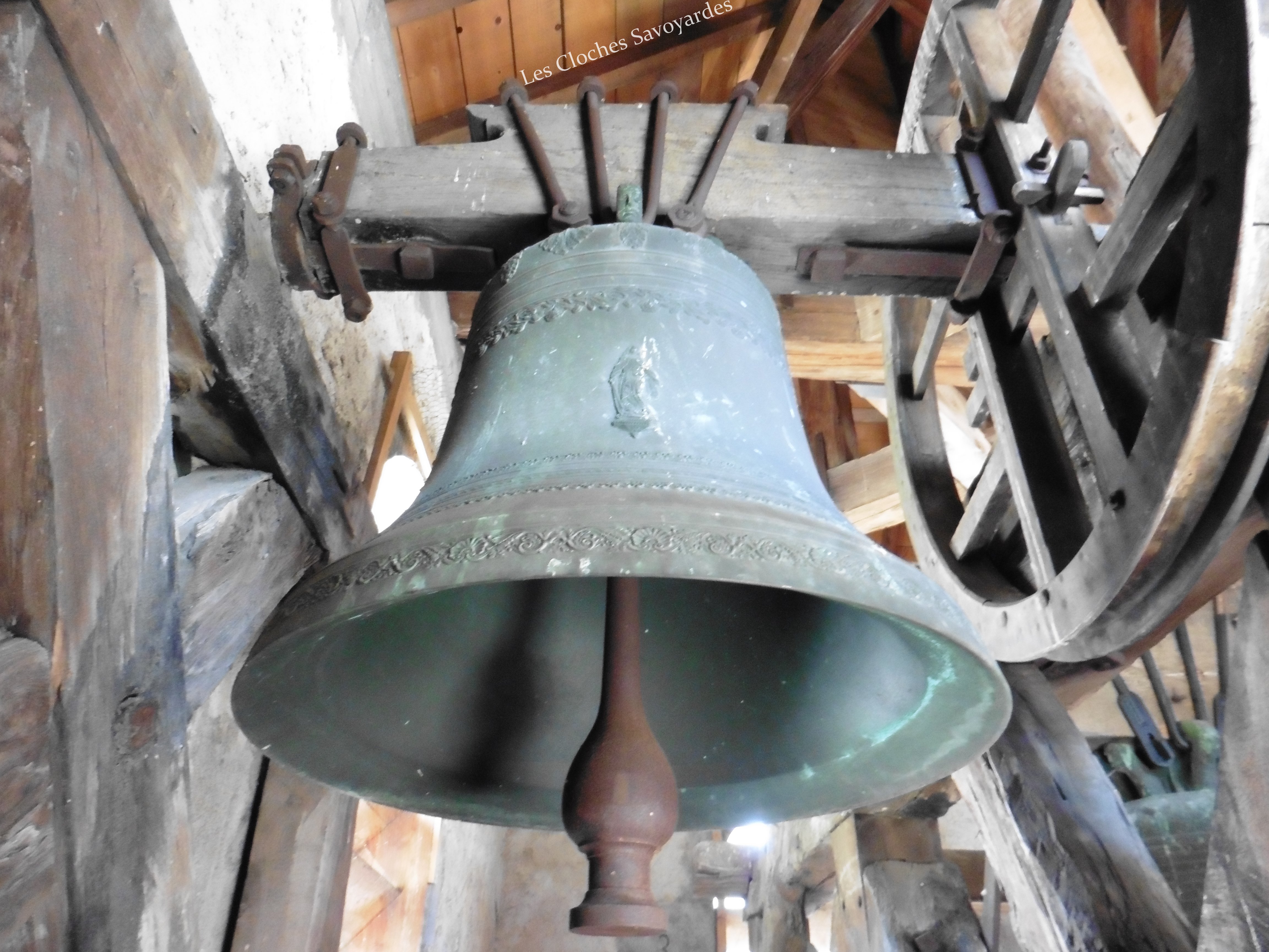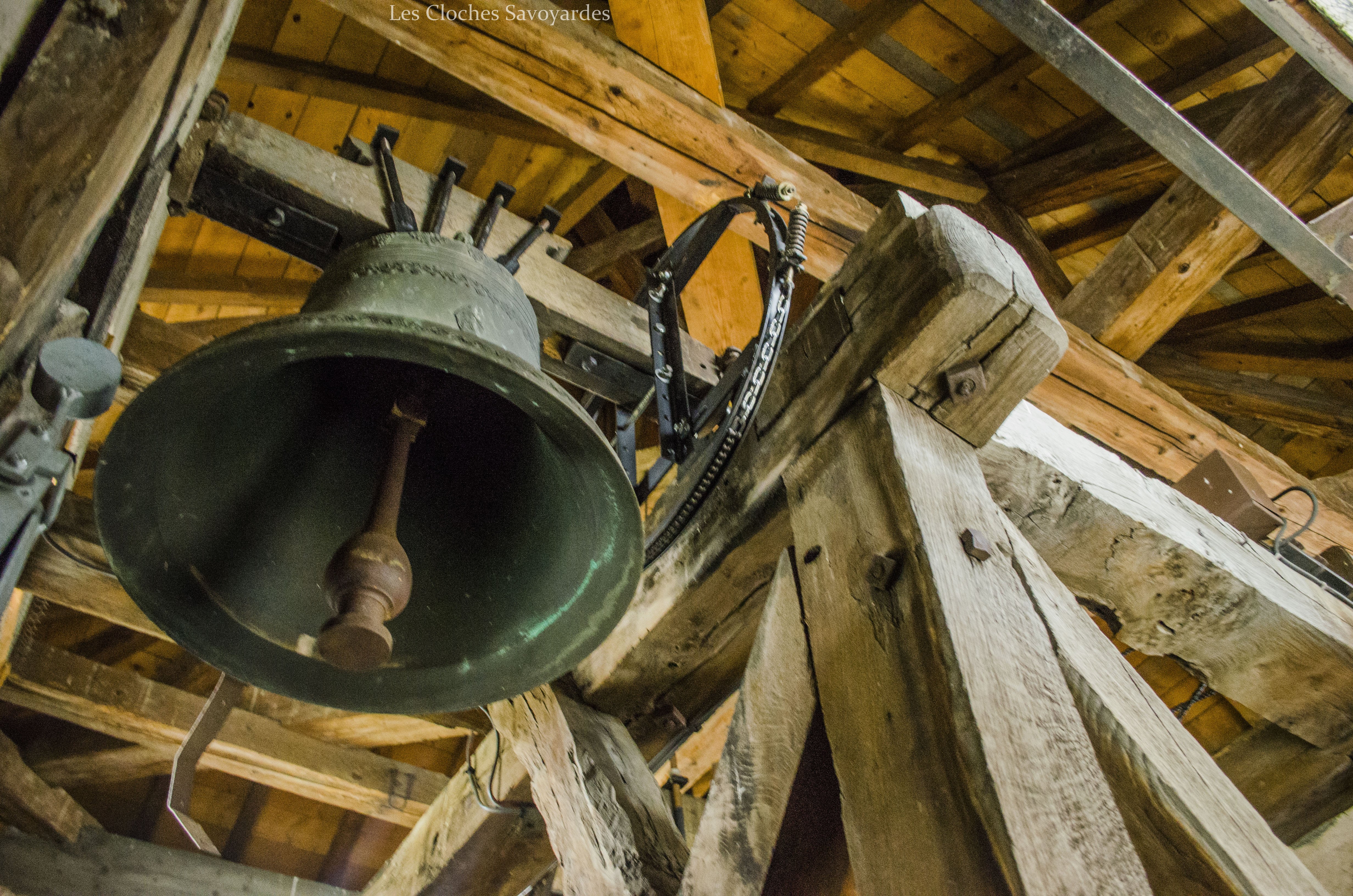 La tour clocher abrite trois cloches, toutes trois du XIXe siècle. Il est naturellement fort probable qu’elles se contentent de remplacer d’autres cloches, antérieures à la Révolution mais aussi du début du siècle industriel. Les archives pourraient certainement nous en apprendre d’avantage que les cloches qui ne mentionnent rien sur leurs ancêtres. La plus grande est aussi la plus ancienne. Datée de 1870, elle arbore fièrement le nom de « Marie Joséphine Pie ». On peut -entre autres- lire que la cloche a été fondue l’an du Concile Vatican I pour la paroisse Saint Sulpice et qu’elle avait pour parrain le maire de l’époque, J. Rubin. Les noms des conseillers de l’époque sont gravés. On peut entre autres voir les noms de « Joseph Déllulier », homonyme d’un paroissien présent lors de mes ascensions au clocher et « J. Mauris Demorioux », un parent de M. le Maire. Les deux plus petites cloches ont été ajoutées en 1894. La plus grande des deux porte le nom de « Josepha Sulpicia » et invoque Saint Sulpice, patron de la paroisse. La curiosité réside dans la plus petite « Leandra Mauritia » car elle invoque Saint Maurice, alors futur saint-patron de Marignier. Cette cloche était jadis muette car elle n’a pas été électrifiée comme ses grandes sœurs en 1935. En 2016, la commune de Marignier a investi pour mettre en sécurité son installation et équiper la cloche de moteurs afin qu’elle puisse accompagner ses grandes sœurs comme auparavant !