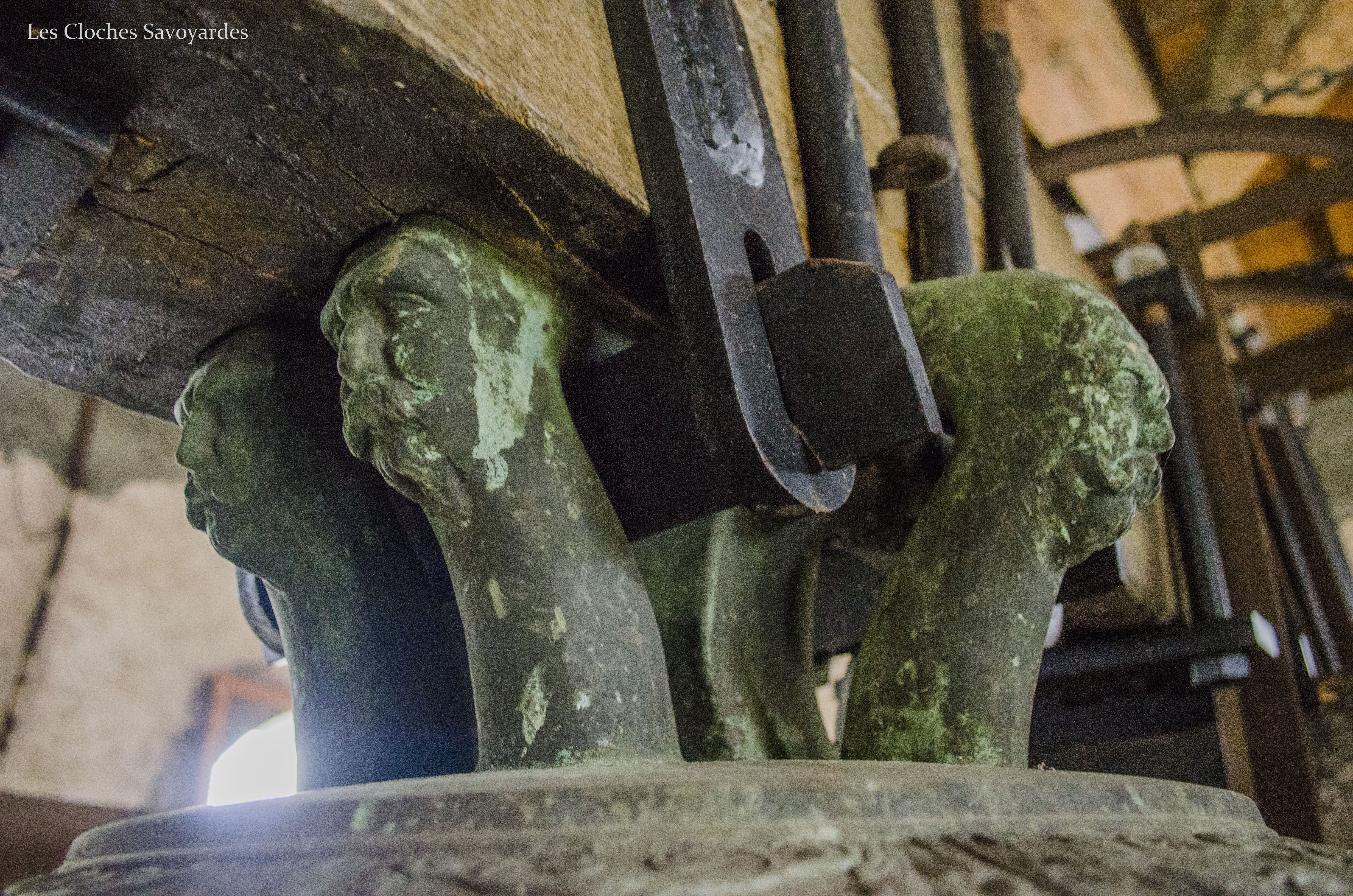 Après avoir pu admirer chaque cloches et leurs détails, je vous propose maintenant de vous rapprocher de la petite cloche avec deux photos (l’une de juillet 2015, l’autre de décembre 2016) montrant les équipements de la petite cloche avant et après l’électrification. On notera le changement des ferrures et des paliers, et l’installation de deux moteurs (volée et tintement). Plus bas, l’ancien volant en bois permettant la sonnerie manuelle, désolé pas très loin.