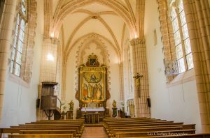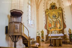 Si l’église primitive était sous le vocable de sainte Marie, Mère de Dieu, les moines se la sont appropriés selon les normes en vigueur : elle était devenue à l’usage exclusif de la communauté et les paroissiens ne pouvaient pas s’y recueillir. Alors, comme ailleurs, il fallait prévoir un second sanctuaire. Celui-ci allait être attenant au premier… avec une seule nef ! Un jubé allait séparer deux lieux dédiées à deux saintes : sainte Marie pour les religieux, et sainte Foy pour les paroissiens. Ce dernier sanctuaire sera desservi par un clergé séculier, distinct à la communauté régulière. Cet édifice, dont les restes actuels sont encore debout, sont signés maître Jacques de Saint-Georges. Les plans établis, la construction pourra commencer en 1295 pour se terminer 21 ans plus tard. Les deux églises (paroissiale et conventuelle), le cloître et les bâtiments conventuels sortent donc de terre. Cet architecte à laissé là une église unique, par sa forme et surtout par ses ouvertures : rectangulaires ! Si vous voulez voir les mêmes fenêtres, vous devrez vous rendre… au Pays de Galles ! En 1589, les Bernois ne manqueront pas de saccager sanctuaire et bâtiments conventuels. En réalité, il ne demeure que l’équivalent de l’église conventuelle. Le reste a été tout simplement détruit car jamais relevé. Les décors intérieurs datent de 1625/1635. Ils ont été découverts lors de la restauration de 1994-1995. Le retable présent dans le chœur a été commandé entre 1607 et 1635, probablement à l’arrivée des barnabites. Il représente entre autres quatre saints majeurs : saint François de Sales, sainte Foy, Bienheureux Ponce, saint Antoine-Marie Zaccaria. La personne principale est bien-sûr la Vierge à l’Enfant, le jour de son Assomption.