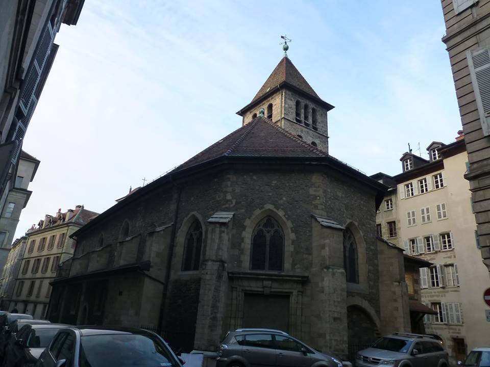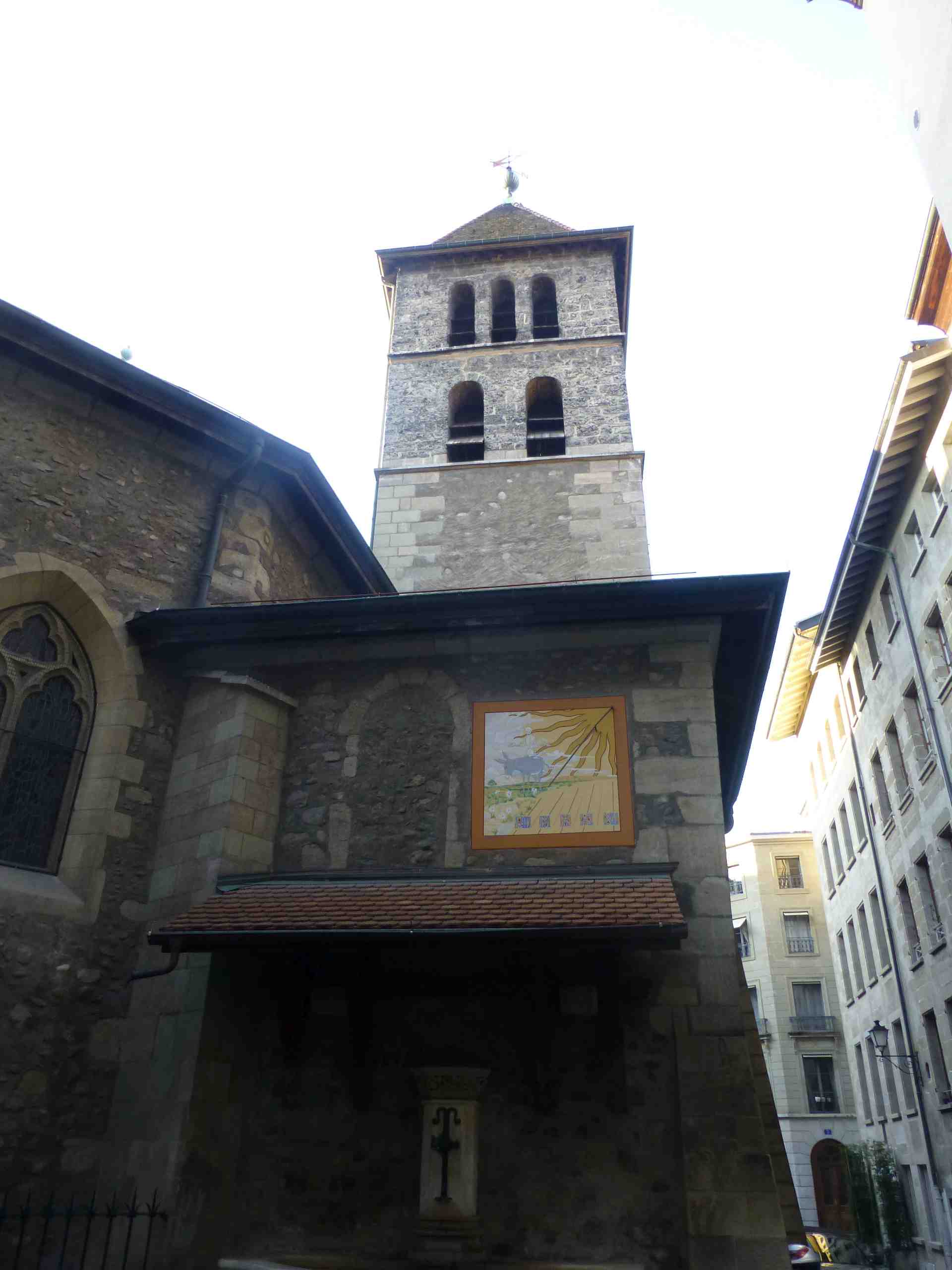 Se dressant avec la cathédrale réformée Saint Pierre au sommet de la cité genevoise, l’église Saint Germain est un témoin clé de l’histoire genevoise, et demeure l’un des lieux de cultes les plus anciens de Genève. De style gothique tardif, le bâtiment date du XVe siècle. Après la Réforme son affectation fut profane, et ne servit qu’en commerce. Au début du XIXe siècle elle a été protestante et remplaça la cathédrale quelques années, avant de retourner entre les mains des catholiques. Le clocher en pierre massif reste sobre. Il est percé par des baies munies d’abats-son aux deux derniers étages, et couronné d’un fier toit à quatre pans. Au début du XXe siècle le clocher est victime d’un incendie, en 1908 l’église rouvre ses portes après restauration.
