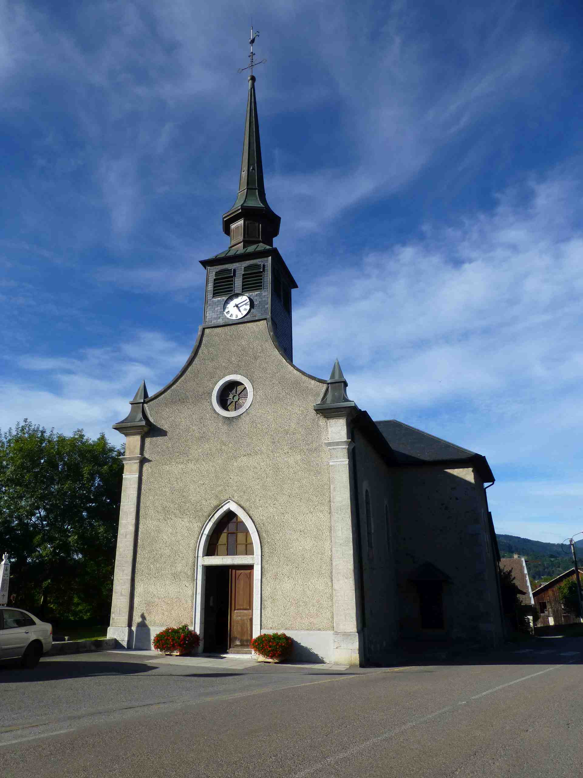 Deux Marcellaz, deux églises Saint Maurice, ce n’est pas dans l’originalité que ces deux commune se protègent au moyen de Saints Patrons. A Marcellaz, dans la province du Faucigny, c’est une charmante petite église qui nous ouvre ses portes. Construite entre 1851 et 1854, elle remplace une église plus petite, donc la sacristie actuelle devrait correspondre au chœur de celle-ci, selon la mappe sarde (plan de la commune).