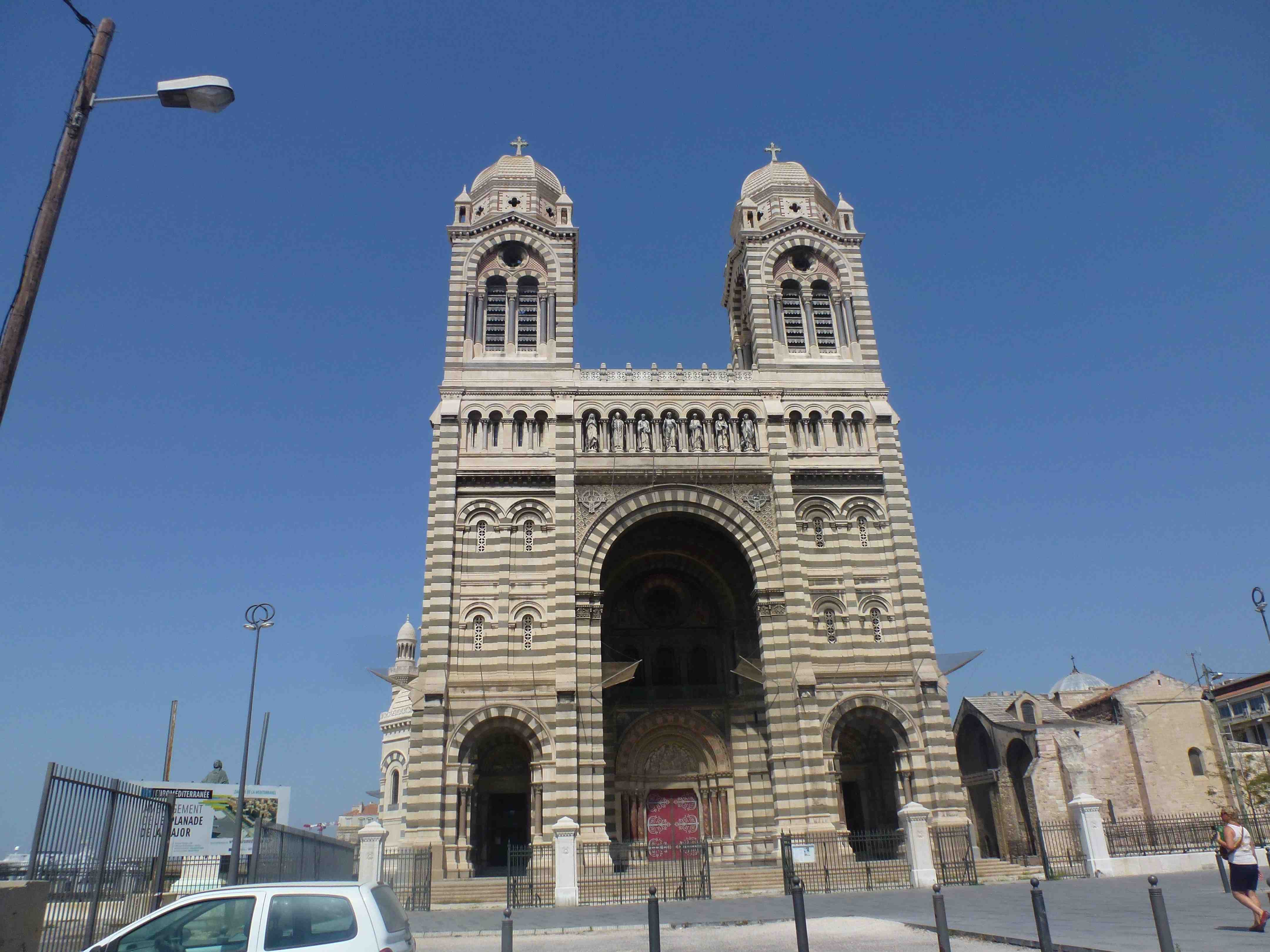 Construite entre 1852 et 1893, sur les plans de Léon Vaudoyer, la cathédrale de Marseille déploie, comme sa sœur [Notre Dame de la Garde] un style néo-romano-byzantin. Bien qu’en façade, on admire 2 tours identiques, une grande coupole haute de 70m attire le regard. A côté de ce nouvel édifice, nous pouvons encore contempler les restes de la cathédrale »mineure » détruite par un incendie début XIXème. Elle abrite en crypte les tombeaux des évêques (dont 1 Savoyard) et en particulier celui de Mgr. De Mazenod.