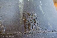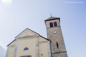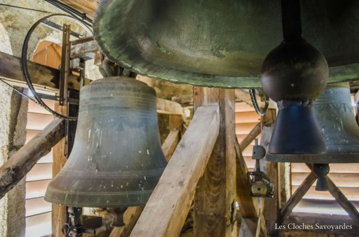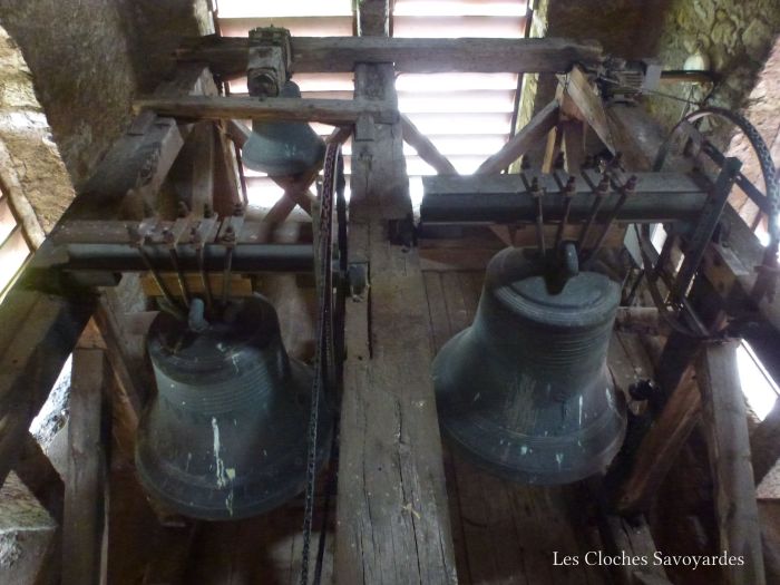 Le beffroi en bois du clocher abrite trois cloches. Les deux grandes portent la signature des frères Beauquis de Quintal, maintes fois présentés ici, et la plus petite, de fondeur inconnu, va attirer dans les prochaines lignes toute mon attention. Les deux premières cloches, respectivement « Marie-Louise » et « Françoise-Caroline » portent fièrement les dates de 1870 et 1879, c’est à dire juste avant et après la reconstruction de la tour qui les abrite. La première cloche, lourde de près d’une tonne, annonce qu’elle « marque les heures (de la vie), chante les jours et pleure les douleurs ». Elle cite le maire, Ruffet Claude, le curé, Rd Jacquier, et le président du conseil de fabrique, M. Bourgeois. Le Rd Favre, alors curé de Praz-sur-Arly est parrain, et Melle Verboud la marraine. Sa petite soeur, audible pour l’angélus, possède une décoration très soignée. Moins bavarde, elle décline cependant le nom du curé et du président de la fabrique, toujours en fonctions, et du nouveau maire, M. Alexis Vuattoux. Le Rd et Melle Chavanne l’ont parrainé.