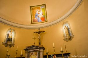L’intérieur de l’église est sobre. Les couleurs sont cependant plutôt vives et chaleureuses. Les vitraux proviennent de l’église voisine de Perrignier. Sa décoration intérieure est de la même époque que la construction. Le seul ajout effectué l’autel en bois, permettant la messe face à l’assemblée.