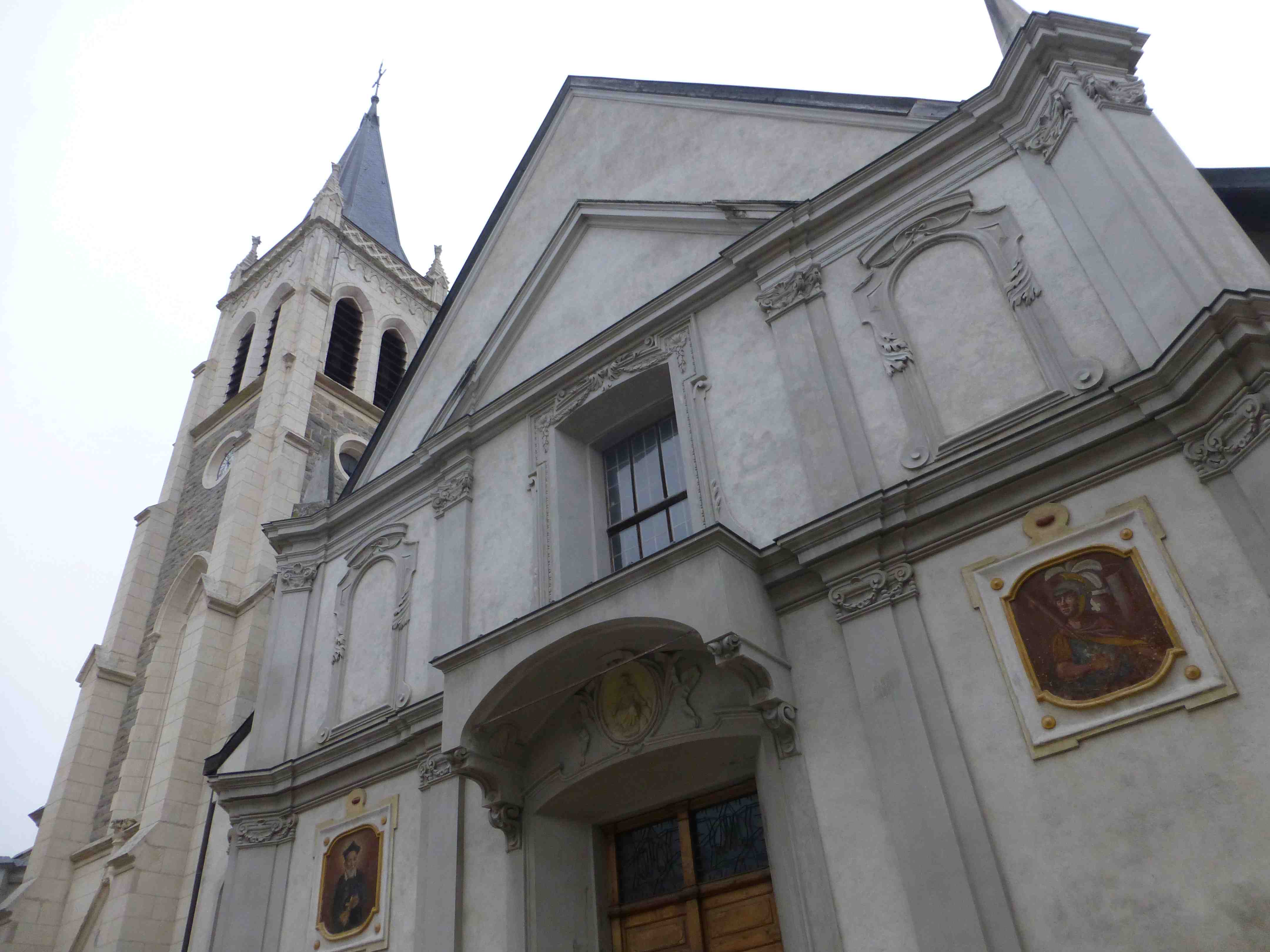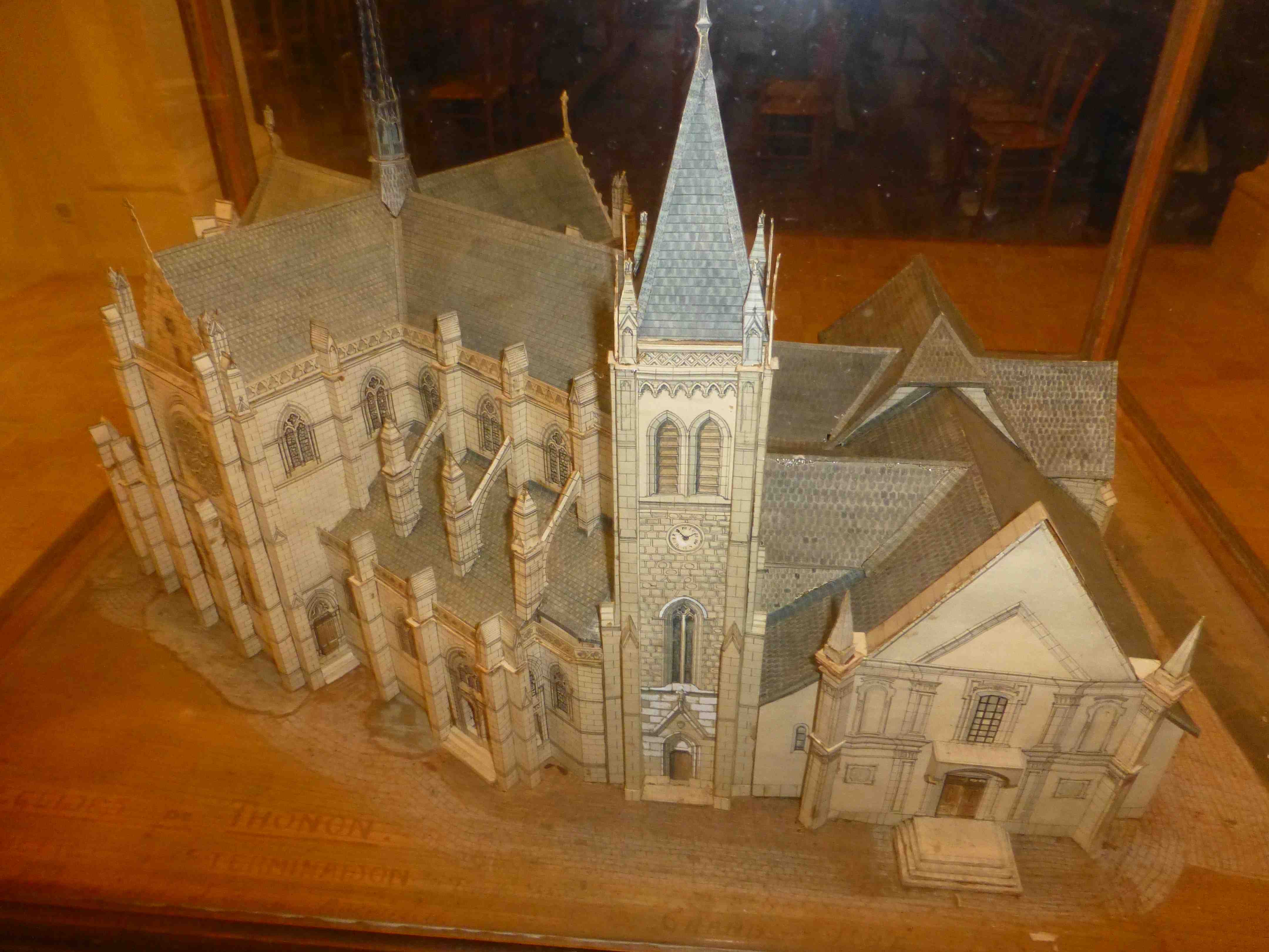La première église dédiée à Saint Hippolyte, construite sur l’emplacement de l’église primitive, remonte au XIVè siècle. Elle devient chapelle papale sous le règne d’Amédée VIII, lorsque celui-ci est nommé Pape par le concile de Bâle. Elle est rebatisée « Temple de la Raison » lors de la Révolution, avant d’être rendue au culte catholique peu après. Dans la seconde moitiée du XIXe siècle, un projet de cathédrale néogothique à deux tours voit le jour. Le projet incluant la destruction de l’église Saint Hyppolyte, les habitants, qui y étaient très attachés, se dépêchent de la faire classer monument historique en 1909. Au final, seul le presbytère aura été sacrifié pour des raisons financières. L’église sert d’entrepôt lors de la Première Guerre. Le curé Chaumontet remet ensuite au goût du jour la transformation de l’édifice, qui se voit consacré et élevé au rang de basilique en 1930 par Mgr De La Villerabel, évêque d’Annecy. Comme on peut le voir sur la maquette ci-dessous, nous sommes aujourd’hui en présence de deux édifices accolés, non alignés, munis d’une unique tour.
