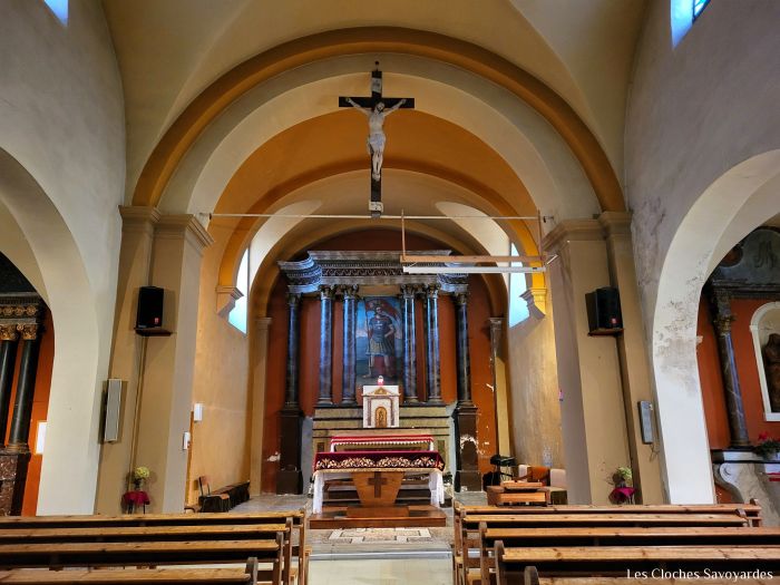 Le clocher flèche est reconstruit en 1835. Jadis au nord de l’édifice, il fut déplacé au sud du chœur. Pour l’occasion, la sonnerie est elle aussi intégralement refaite. Elle fut confiée à François Bulliod qui venait de reprendre les fours de son mentor, Jean-Baptiste Pitton. C’est ainsi que les deux cloches sont hissées au clocher, datées très précisément du 23 avril 1835. Le nom du curé figure sur les deux cloches : Maurice Peccoux. Sur la première, les noms de Antoine-François Gay, notaire, et de Rose Duc son épouse y figurent comme parrain et marraine. Sur la plus petite, figurait les noms de Jean-Gaspard Gay, curé de Bossey et Madeleine Bussat, sa mère. Figurait… car la cloche est déclarée fêlée en 1938 après un siècle de bons et loyaux services. En 1939, « Marthe-Bernardine » la remplace, avec un poids équivalent. Sur cette cloche, on a pris soin de faire mémoire de la pauvre cloche cassée, de lui donner une inscription religieuse latine lui demandant de « louer le Seigneur, inviter les vivants et pleurer les morts ». Elle cite aussi le curé, le Rd François Dunoyer, puis ses parrain et marraine, Georges et Marthe Gay. Elle cite aussi les maires des trois communes membres de la paroisse : Auguste Rossiaud, maire de Vulbens, Jean Marmilloud, maire de Chevrier et René Vincent, maire de Dingy-en-Vuache. Trouver ces trois édiles n’est pas étonnant quand on sait que les trois municipalités contribuent financièrement à l’entretien de l’édifice. On peut citer par exemple des travaux sur les clocher en 1885, payés par les trois communes : 52% par Vulbens, 25% par Chevrier et 23% par Dingy. D’élégantes effigies trônent sur la cloche de 1939 : un beau crucifix, la Vierge et saint Maurice auxquelles s’ajoutent des armoiries : celles de l’évêque d’Annecy, Mgr du Bois de la Villerabel, ainsi que celles de la fonderie Paccard. Ses décors tranchent avec la sa grande sœur, qui ne compte qu’un modeste crucifix et le discret cartouche de son fondeur. Installées côte à côte, elles sont électrifiées depuis 1953 et disposées sur un beffroi en bois refait en 2010 par Stéphane Cuzin, charpentier de Chevrier, l’ancien menaçant ruines. Ces deux cloches restent muettes en dehors des angélus et célébrations religieuses, la cloche de la mairie étant utilisée pour les sonneries civiles.