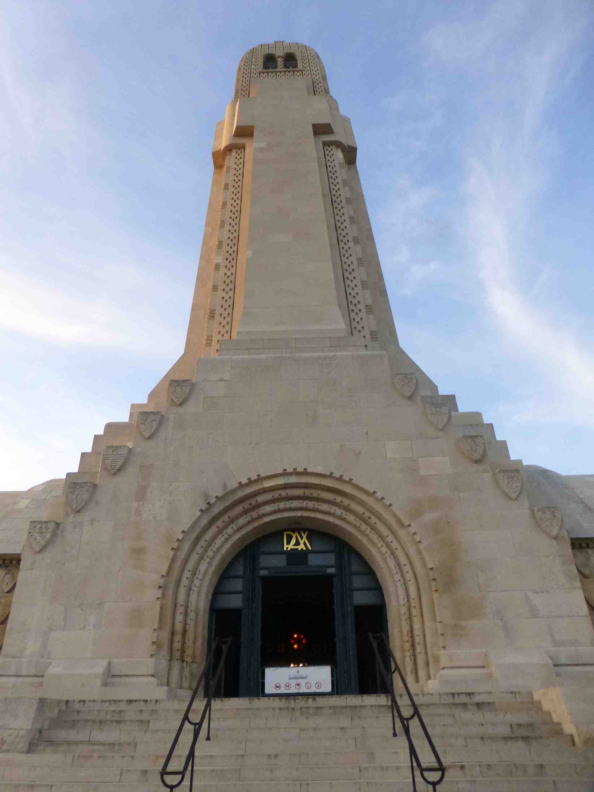 La tour, au centre de l’édifice mesure 46 mètres. Elle abrite le phare « lanterne des morts » qui brille chaque nuit à l’horizon et le « bourdon de la Victoire » qui sonne l’Angelus matin midi et soir en mémoire des morts, le dimanche matin a 10h15 et qui ponctue chaque cérémonie. Fondu en 1927 par Blanchet et Bollée, il mesure 148cm et pèse 2’042 kilos et sonne le Do Dièse 3. Il porte les prénoms de « Louise Anne Charlotte« . Pour les 100 ans de la déclaration de cette terrible guerre, Dominique Bollée a proposé la fonte de 100 répliques « et pas une de plus » a-t-il précisé pour un poids de 20 kilos et 33 centimètres de diamètre. Quelques unes sont exposées dans la chapelle, afin de profiter, en plus petit, des décors somptueux qui composent ce bourdon.