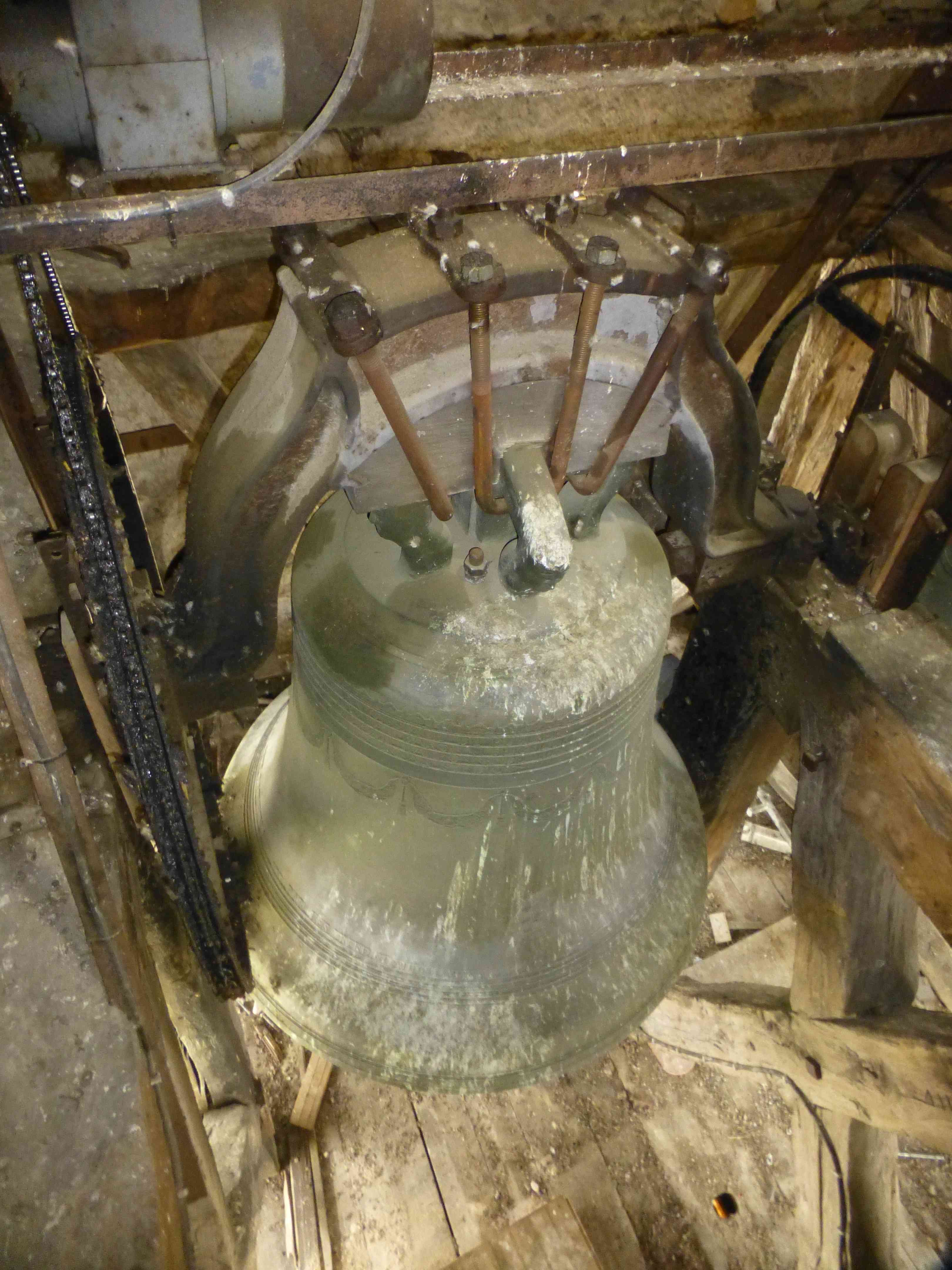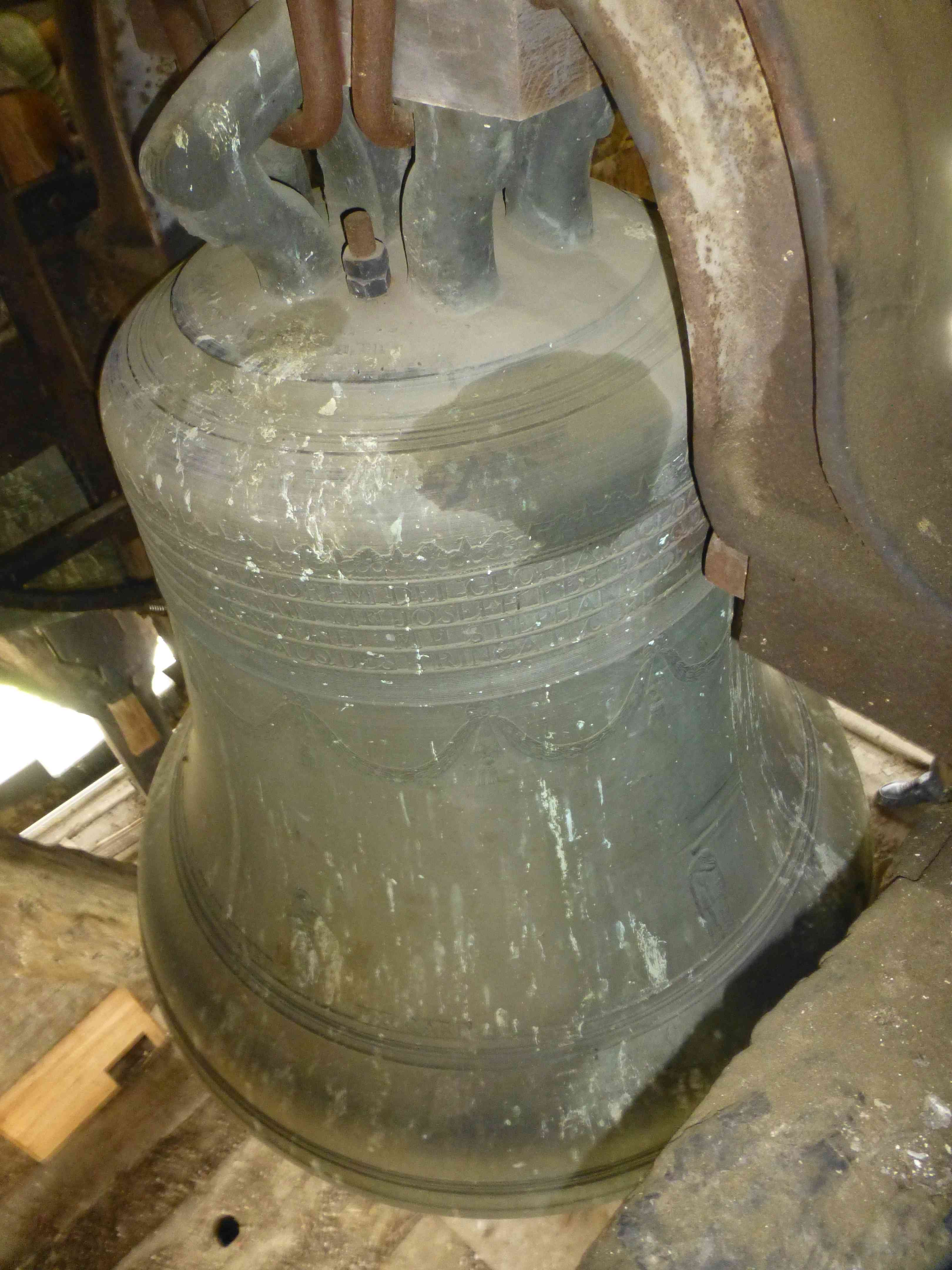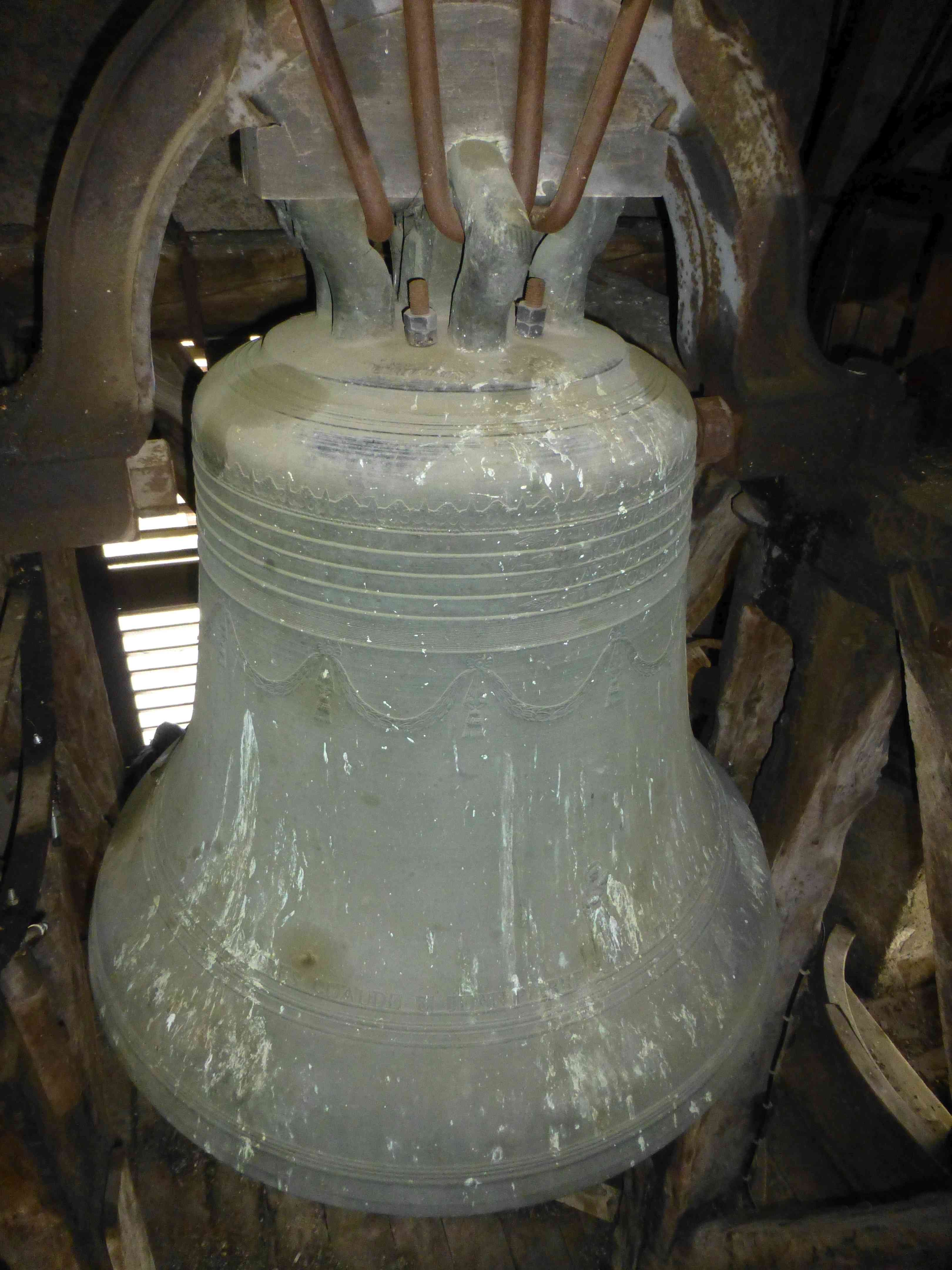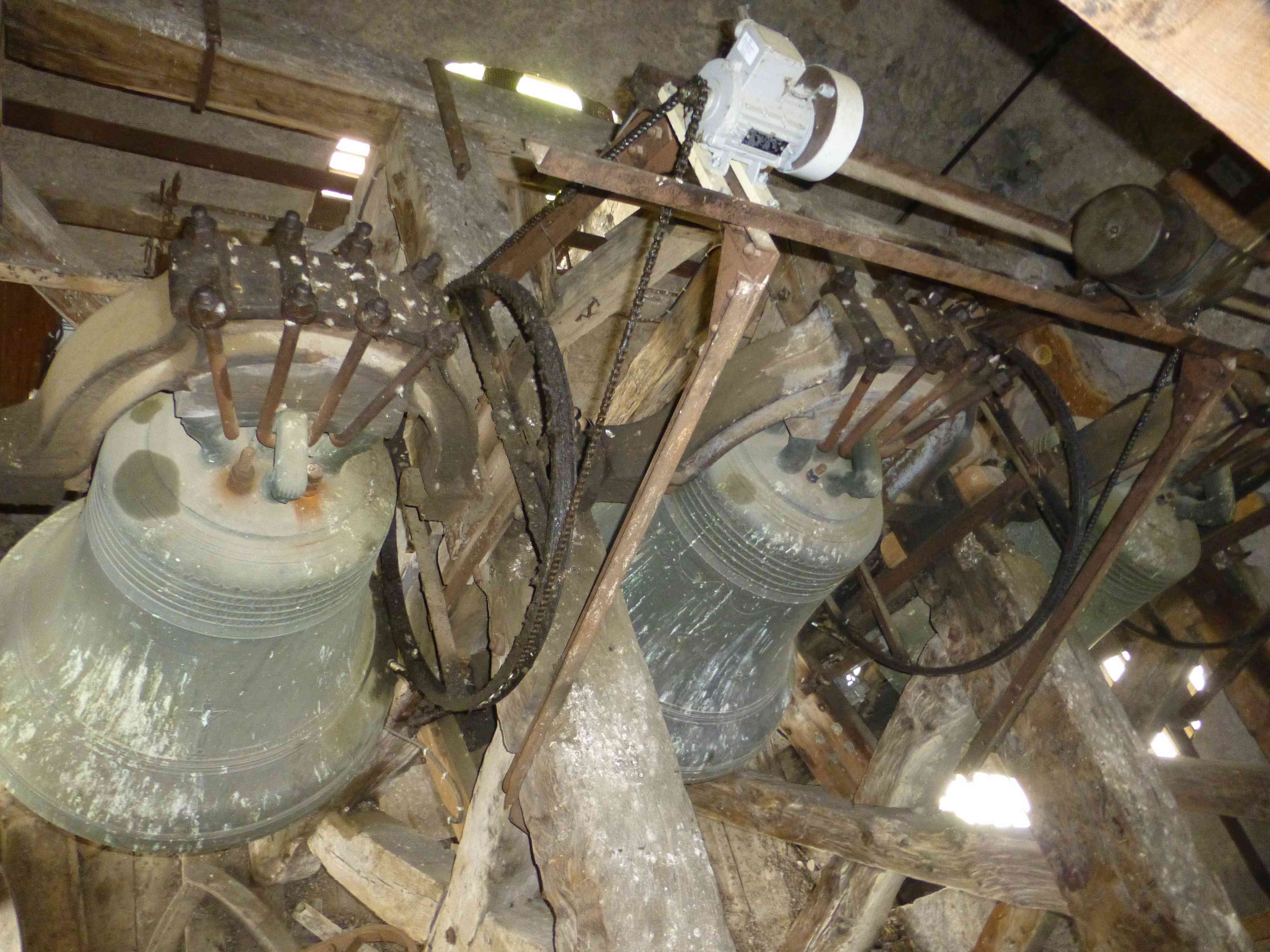 Les trois cloches, installées depuis 1834 sur leur beffroi en bois.