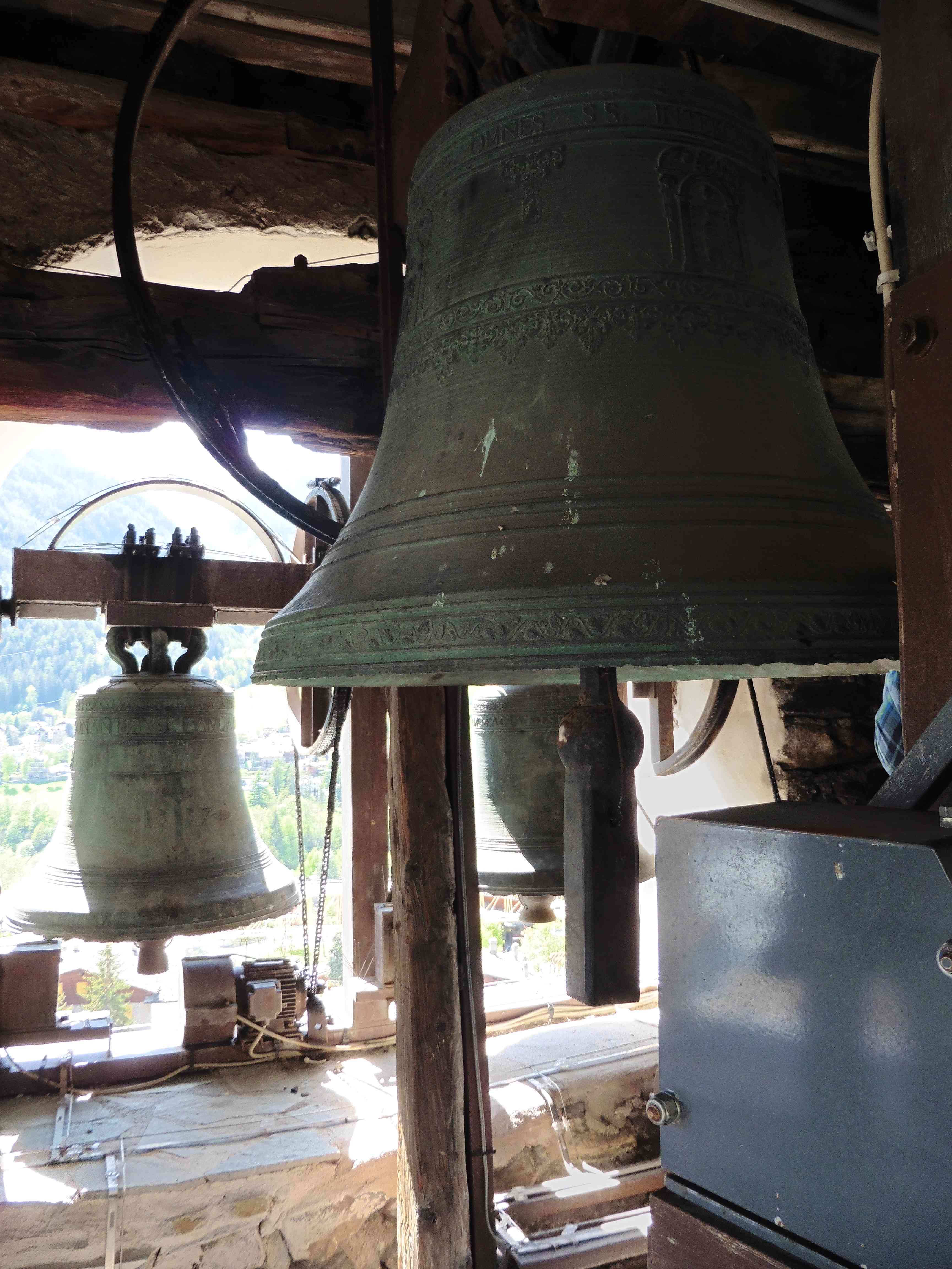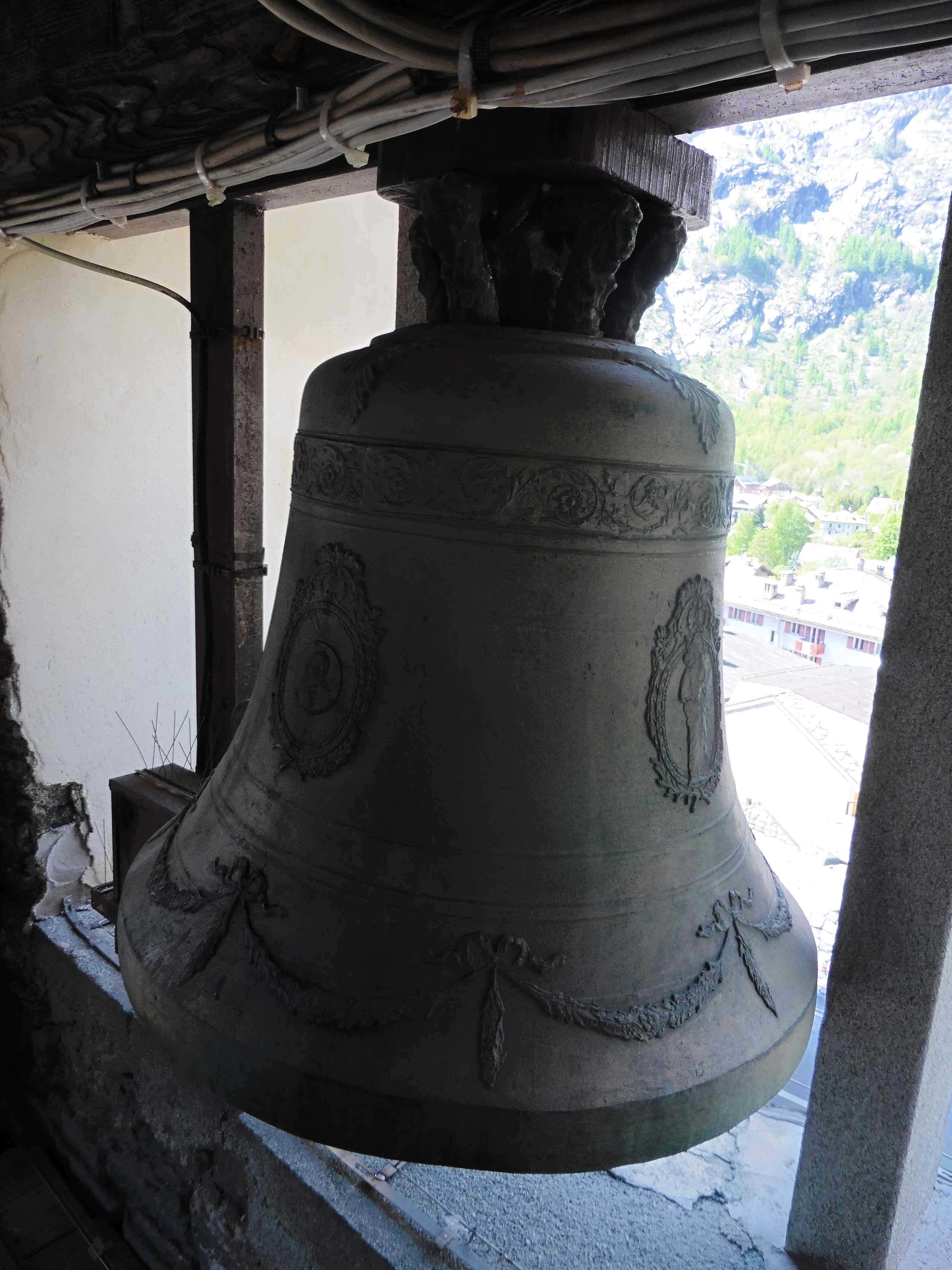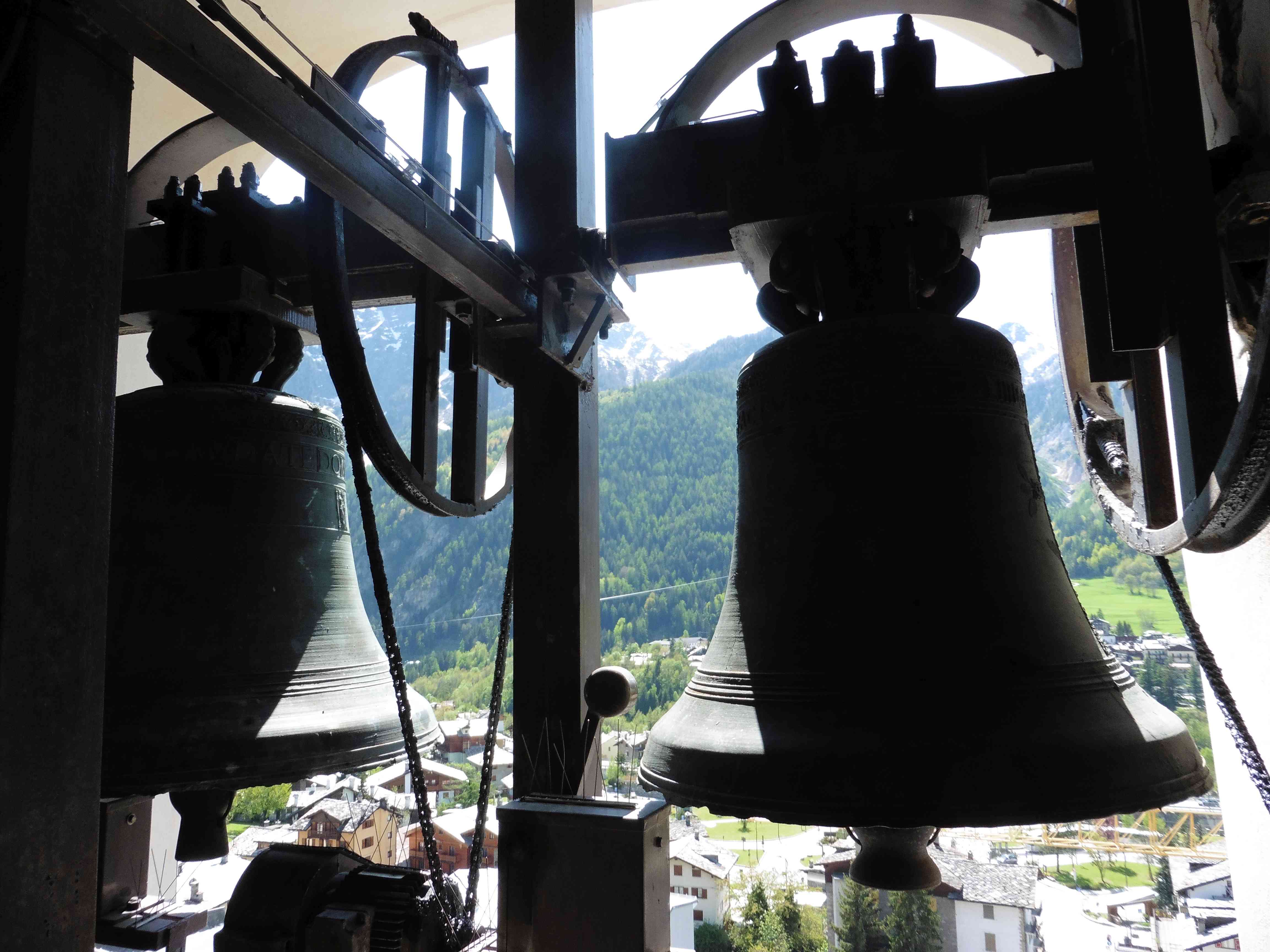 L’église de Courmayeur ne compte pas moins de huit cloches. Cinq d’entre elles peuvent sonner à la volée et les sept plus grandes sont munies de marteaux pour carillonner. Ce sont ces mêmes cloches qui sont installées dans la tour-clocher. La plus petite cloche se situe dans un discret clocher mur au dessus de la sacristie. C’est une sonnerie historique qui a véritablement été constituée au XVIIe siècle. Les autres cloches datent quant à elles du XVIe, XIXe et XXe siècle. Ces deux dernières ont été coulées en 1967 par la fonderie Achille Mazzola, qui a fermé en 2003, mais qui a commencé ses activités au XVe siècle!