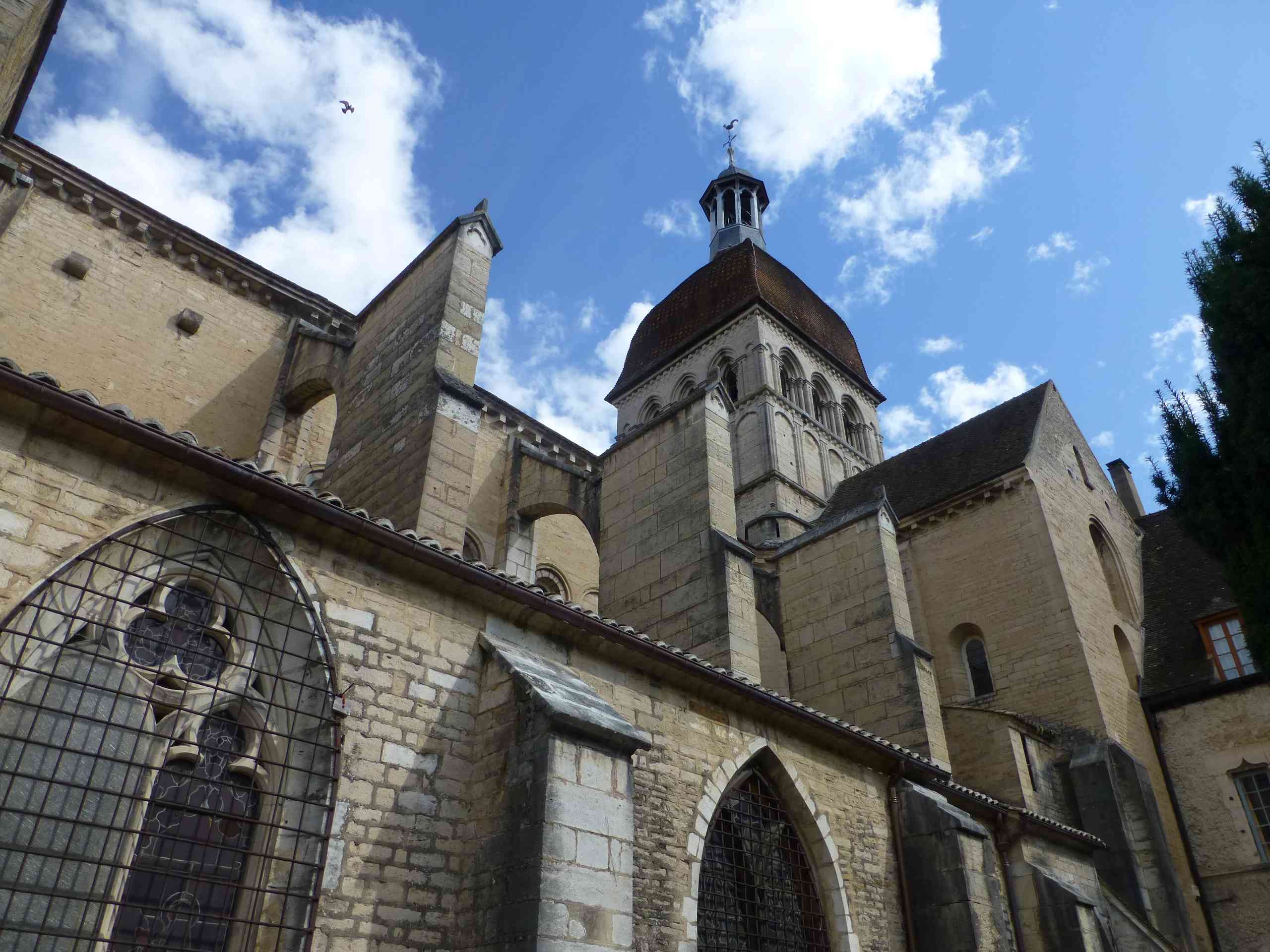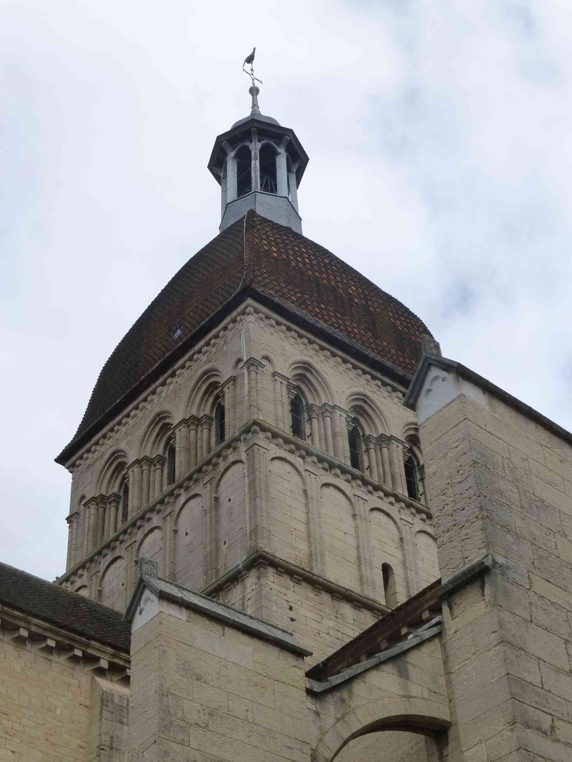 Le clocher, à la croisée du transept est de plusieurs époques. Sa « base » est du XIIe siècle. L’étage des cloches date du XIIIe siècle. Son dôme, enfin, a été reconstruit après un incendie dans les années 1580.