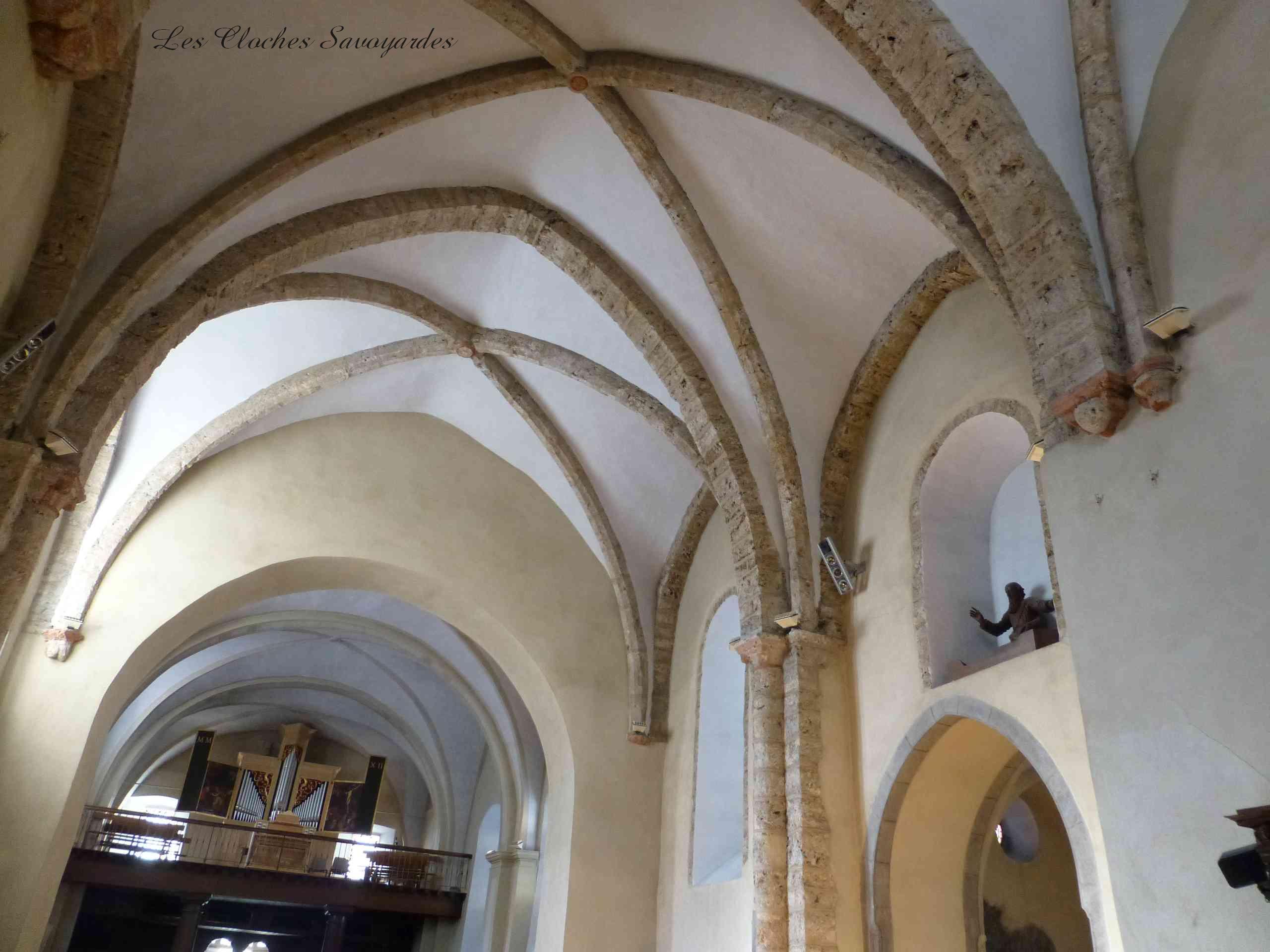 Blottie contre la montagne, l’abbatiale Sainte Marie-Madeleine ne livre ses secrets qu’aux plus curieux. Pour pouvoir la contempler, il faut soit quitter les grandes routes ou alors revenir du « Bout du Monde ». Si aujourd’hui l’église possède un seul vocable, elle fut, jusqu’à la Révolution, scindée en deux. Le chœur et le transept actuel appartenaient à l’église abbatiale dédiée à l’Annonciation, et le reste de la nef représentait l’église paroissiale déjà dédiée à Sainte Marie-Madeleine. Un jubé séparait jadis ces deux parties. L’église abbatiale a été bâtie au XIIe siècle. L’église paroissiale, quant à elle, date du XIIIe siècle. A l’origine romanes, ces deux églises ont été la proie des flammes en 1680. Sept ans plus tard, les chanoines pansent comme ils peuvent ces douloureuses blessures. C’est probablement de cette époque que date la voûte gothique. Après la Révolution Française, l’église, mise à mal, est profondément remaniée. Le jubé disparaît. Deux chapelles viendront créer un transept : la première, dédiée à Saint Ponce, sous le clocher, à l’emplacement du passage reliant l’église aux bâtiments conventuels ; l’autre, bâtie en 1836, est dédiée à Sainte Marie. En 1838, la nef de l’église paroissiale est agrandie dans un style néoclassique. Depuis cet agrandissement, peu de choses ont évolué. En 1912, les stalles sont classées. A leurs côtés trône depuis un retable néo-gothique succédant à un retable baroque. L’édifice arbore donc fièrement un style éclectique constitué d’un chœur roman, d’une voûte gothique, d’un nef partiellement néoclassique et d’un mobilier partiellement néo-gothique. De l’époque baroque ne subsiste que le bulbe du clocher refait après la Révolution.