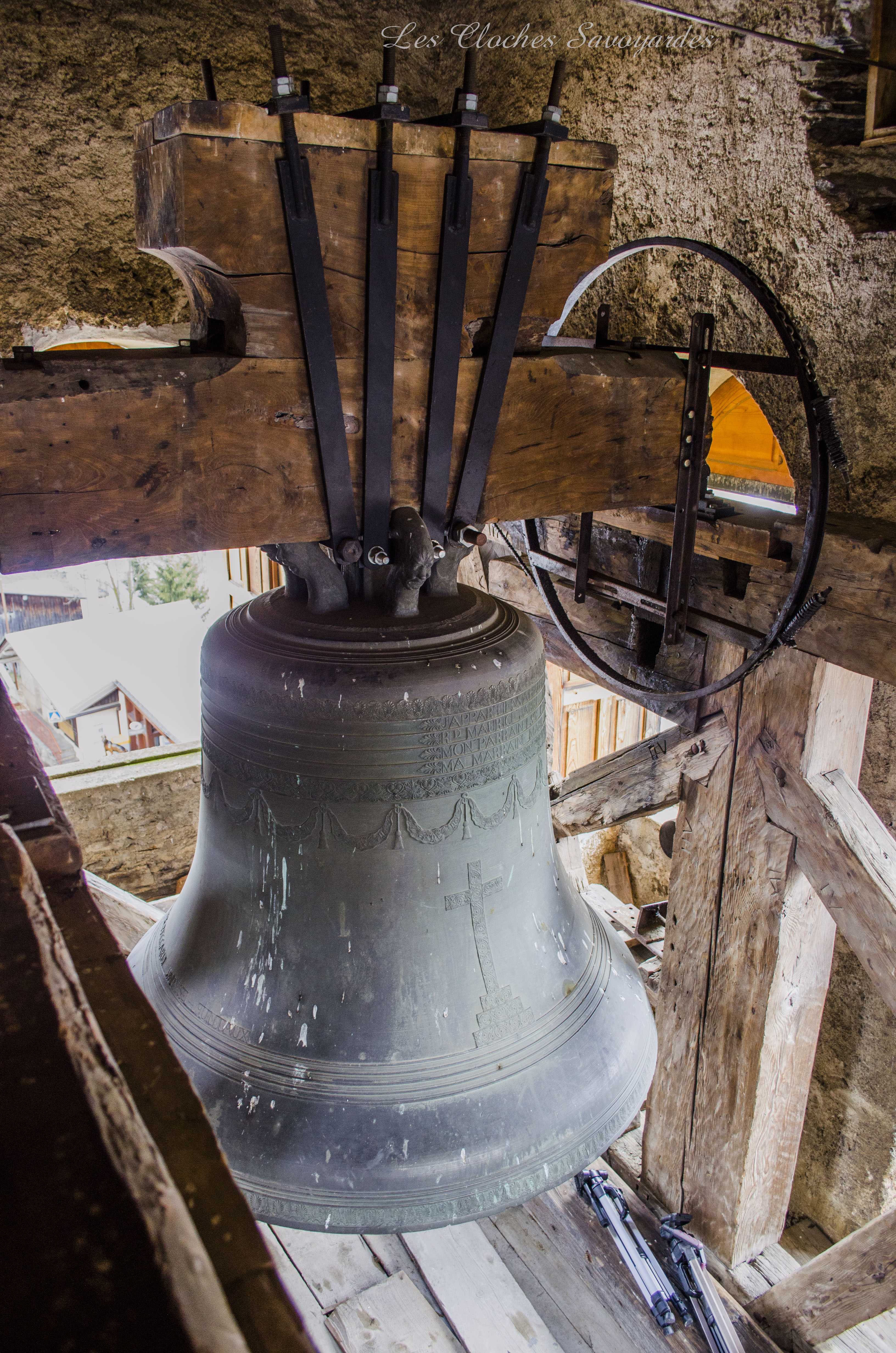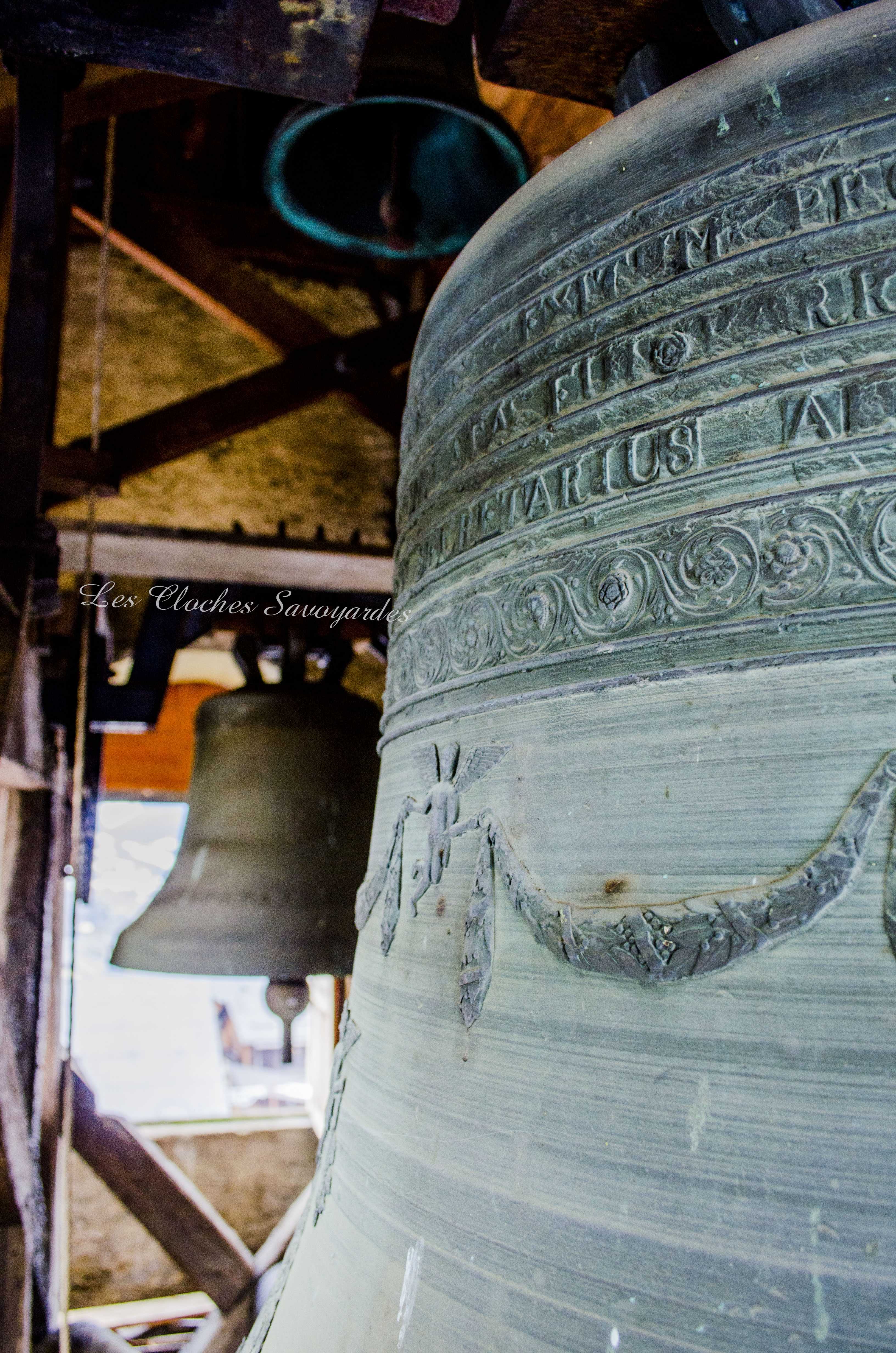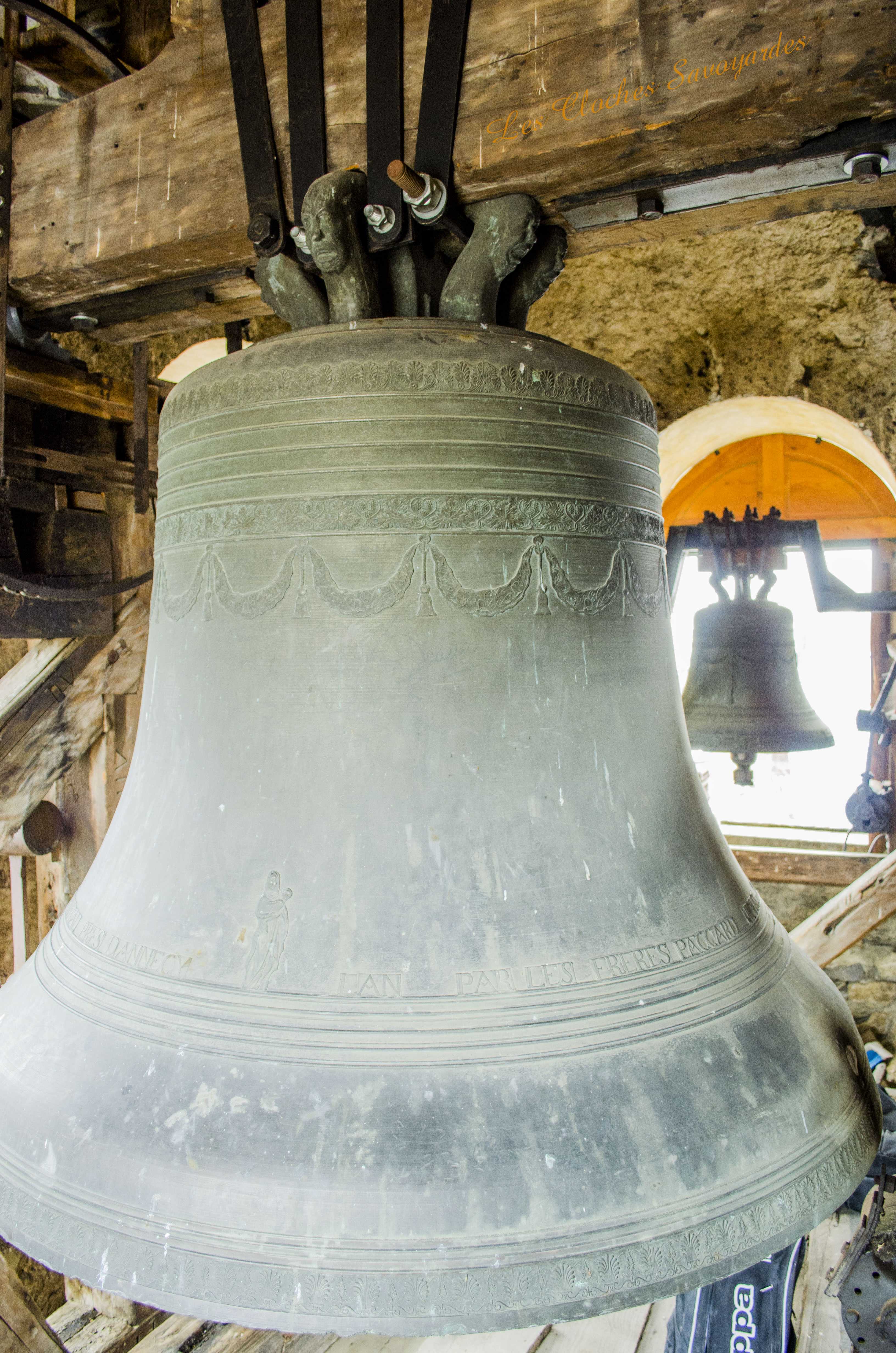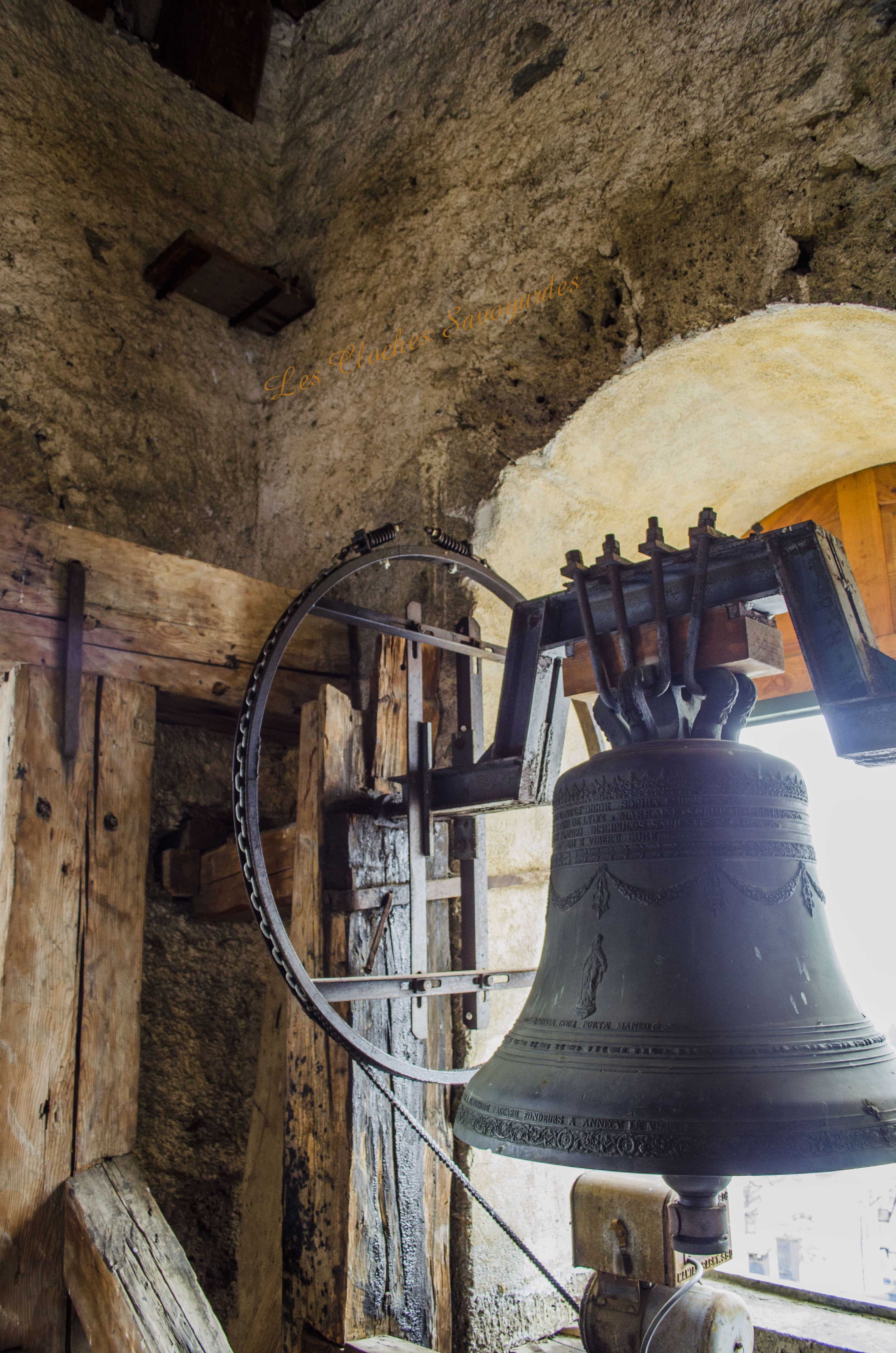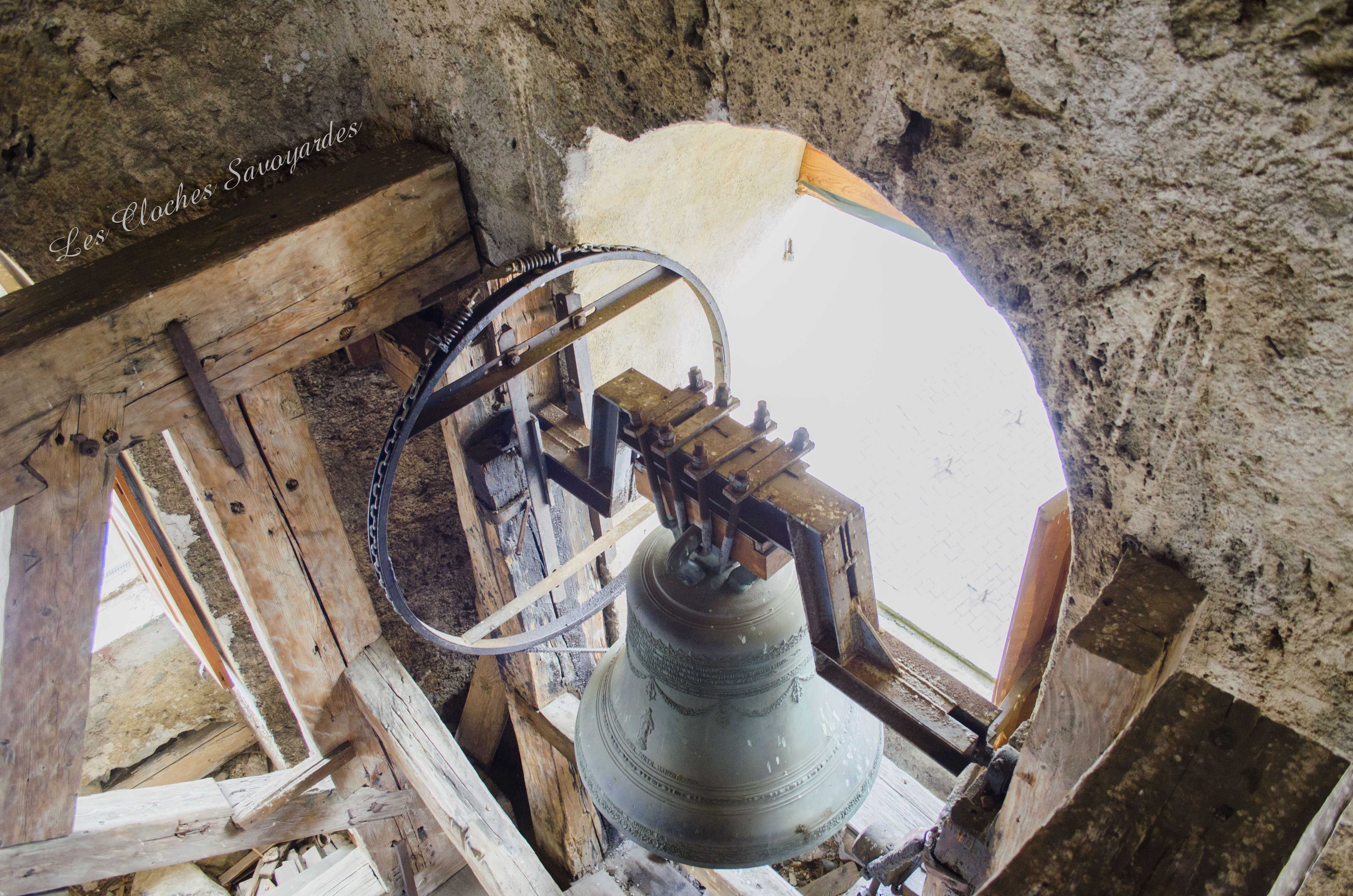 Le clocher -parlons en- a été reconstruit entre 1820 et 1825 ! Lors de cette reconstruction, on installa une première cloche, toujours en place. Elle a été fondue par les fondeurs Vallier & Gautier en 1824, un temps établis à Albertville. Louis Gautier a fondu la même année une des cloches de Queige. Il est difficile de dire si elle en remplace d’autres et si elle tenait compagnie à d’autres vases sonores. Cette cloche est aujourd’hui accompagnée par quatre Paccard livrées par trois générations différentes. La troisième cloche, nommée « Honorine », a été fondue en 1973. Elle est affectueusement surnommée « cloche du midi ». La quatrième porte la date de 1884 et les noms de Georges & Francisque Paccard, illustres représentants de la troisième génération des maîtres-fondeurs. La génération précédente a eu le soin de réaliser deux cloches : Claude Paccard a réalisé en 1851 la plus petite, encore actionnée à la corde, alors que Claude & Jean-Pierre Paccard ont coulé le « bourdon » nommé « Marie-Hélène » à une date inconnue, car non mentionnée. Ses différents motifs et son lieu de fonte nous permettent d’affirmer qu’elle a été fondue entre 1830 et 1857. Il se peut que les archives soient plus bavardes sur son sujet, et j’espère que ce mystère sera résolu un jour! Si cette grosse cloche égrène chaque heure qui passe et ce depuis l’installation d’une horloge mécanique puis électrique en 1914, elle était lancée en volée avec ses sœurs selon un code précis : l’angélus était sonné par la troisième cloche dite « du midi ». Elle sonnait en volée 60 coups. Suivaient les traditionnels 3*3 coups de l’angélus. Cet angélus dit « inversé » était jadis particulièrement prisé par les paroisses de montagne. Les habitants du lieu étaient conviés à l’office divin par une volée de la grosse cloche. Ses 22 quintaux nécessitaient pas moins de trois sonneurs, souvent usés à la fin de la volée. Avant l’électrification en 1949, tout un code prenait place pour annoncer les décès : le curé faisait d’abord quelques coups pour convoquer une dizaine de sonneurs au clocher (au moins huit). Si la personne décédée était mariée, la seconde cloche ouvrait le bal. La troisième cloche était lancée en premier pour un homme célibataire, et la quatrième pour une femme célibataire. Enfin, la plus petite avait préséance pour les plus jeunes. Les cloches étaient lancées pour trois « moeudes » (3* 10 minutes) et si la personne vivait dans un hameau, elles n’en sonnait que deux, car la chapelle aussi sonnait deux « moeudes ». Les membres des confréries avaient eux aussi droit à des sonneries particulières, mais plus aucune archive ne nous les décrit. Lors des fêtes religieuses, des mariages et des baptêmes, le carillon jouait un mélodie joyeuse. Il pouvait aussi résonner lors des sépultures d’enfants en bas âge car ceux ci étaient considérés comme des anges qui montaient directement au ciel. Le soir de Toussaint, les cloches sonnaient un autre glas : elles tintaient l’une après l’autre, jusqu’à minuit. Encore aujourd’hui, elles font partie intégrante du paysage sonore de la commune.