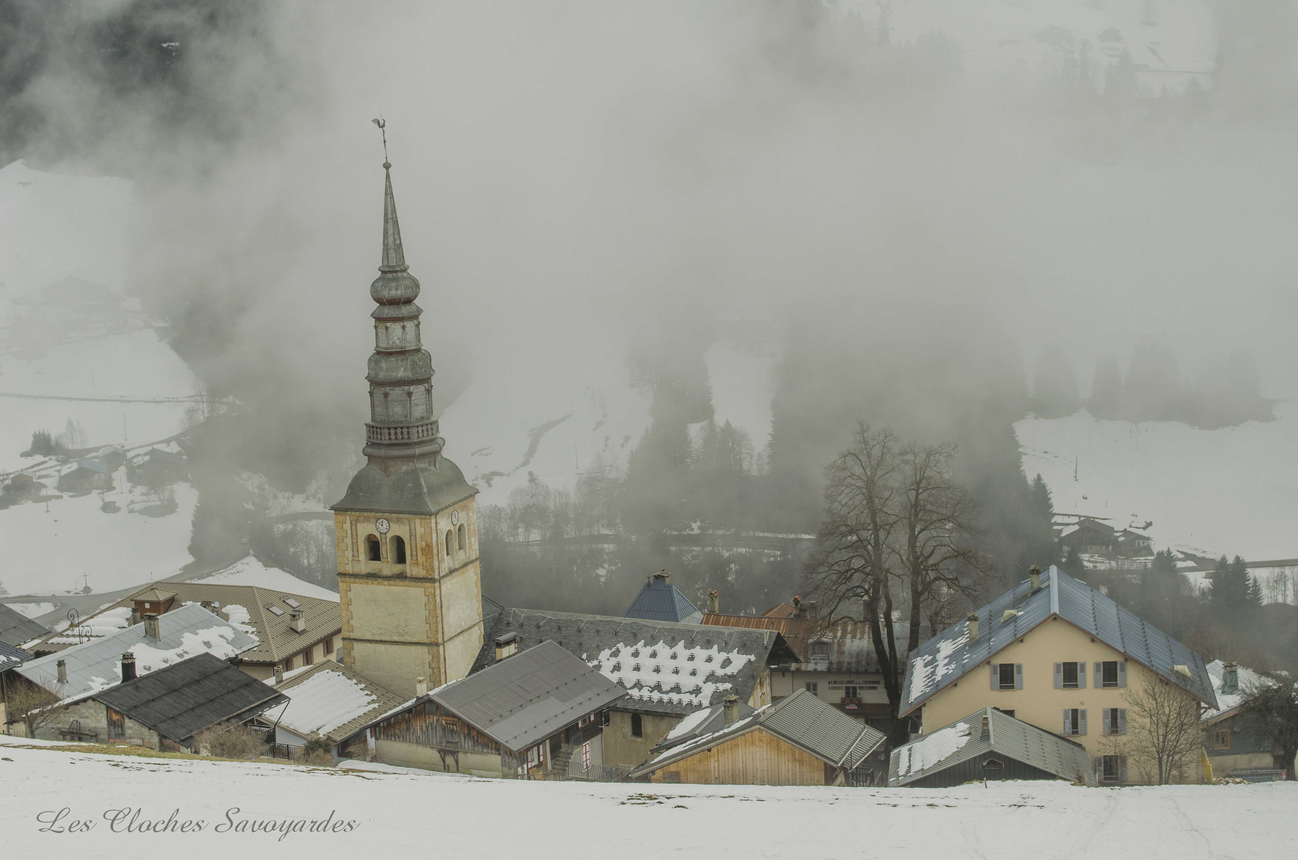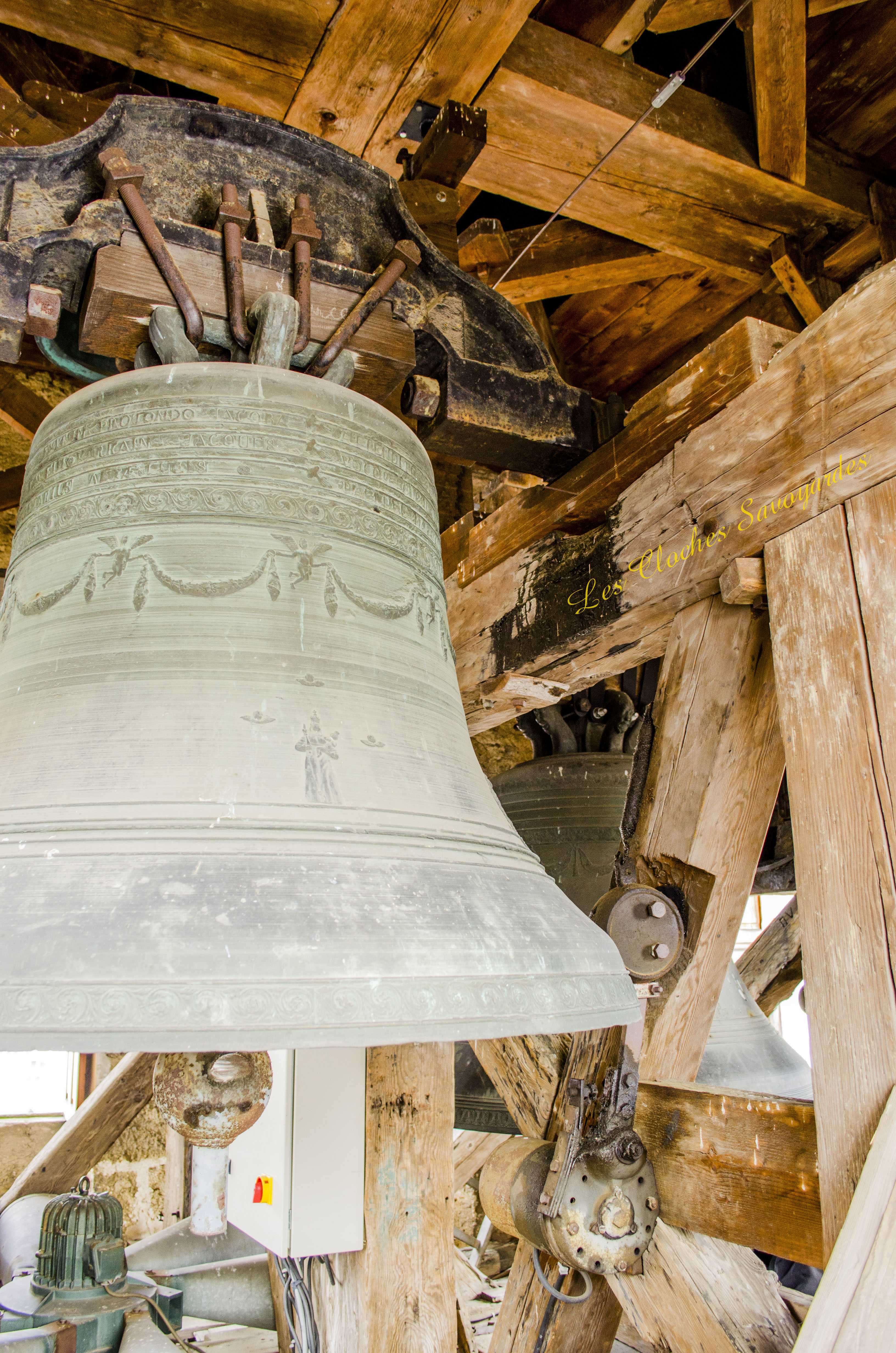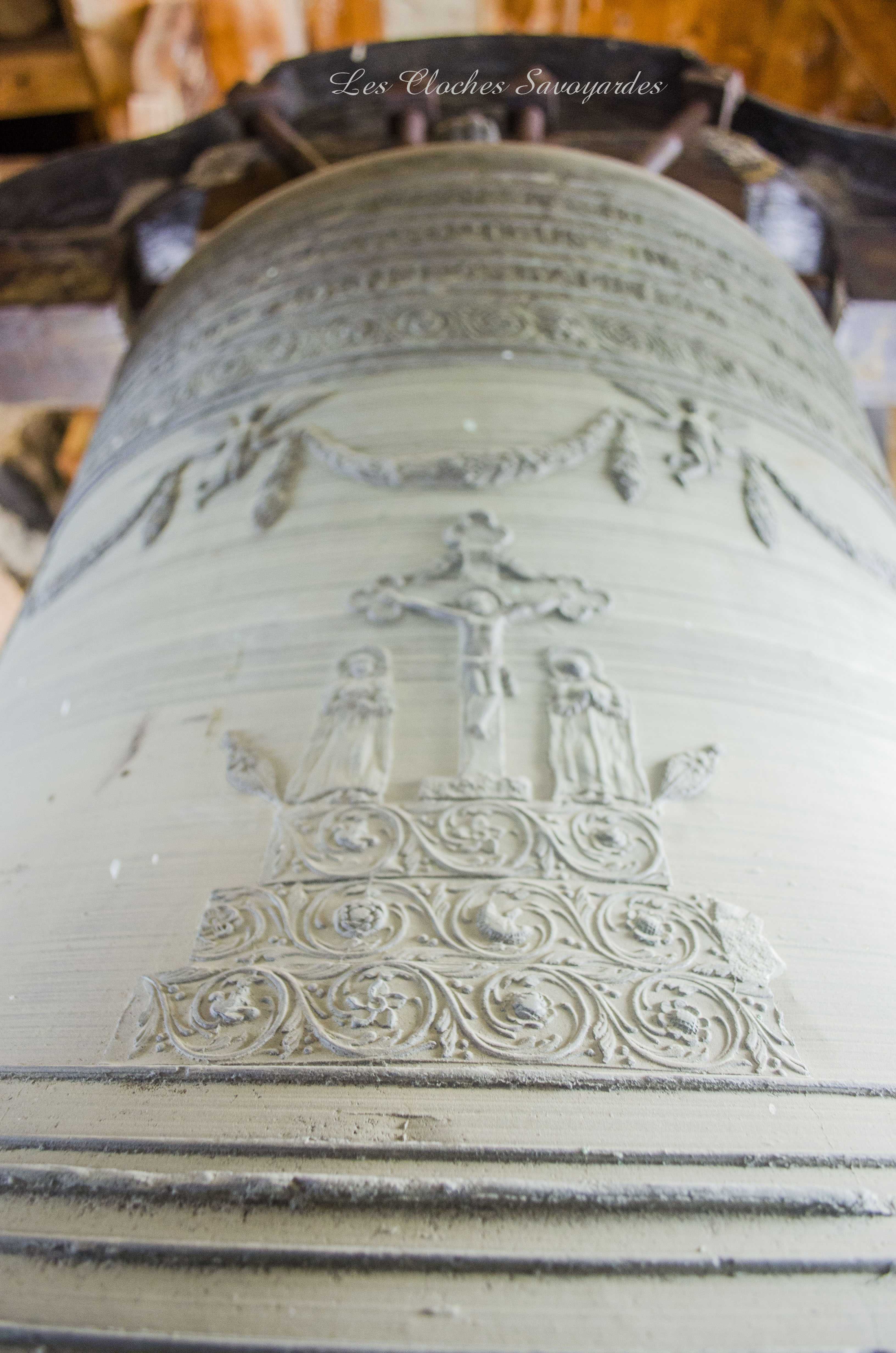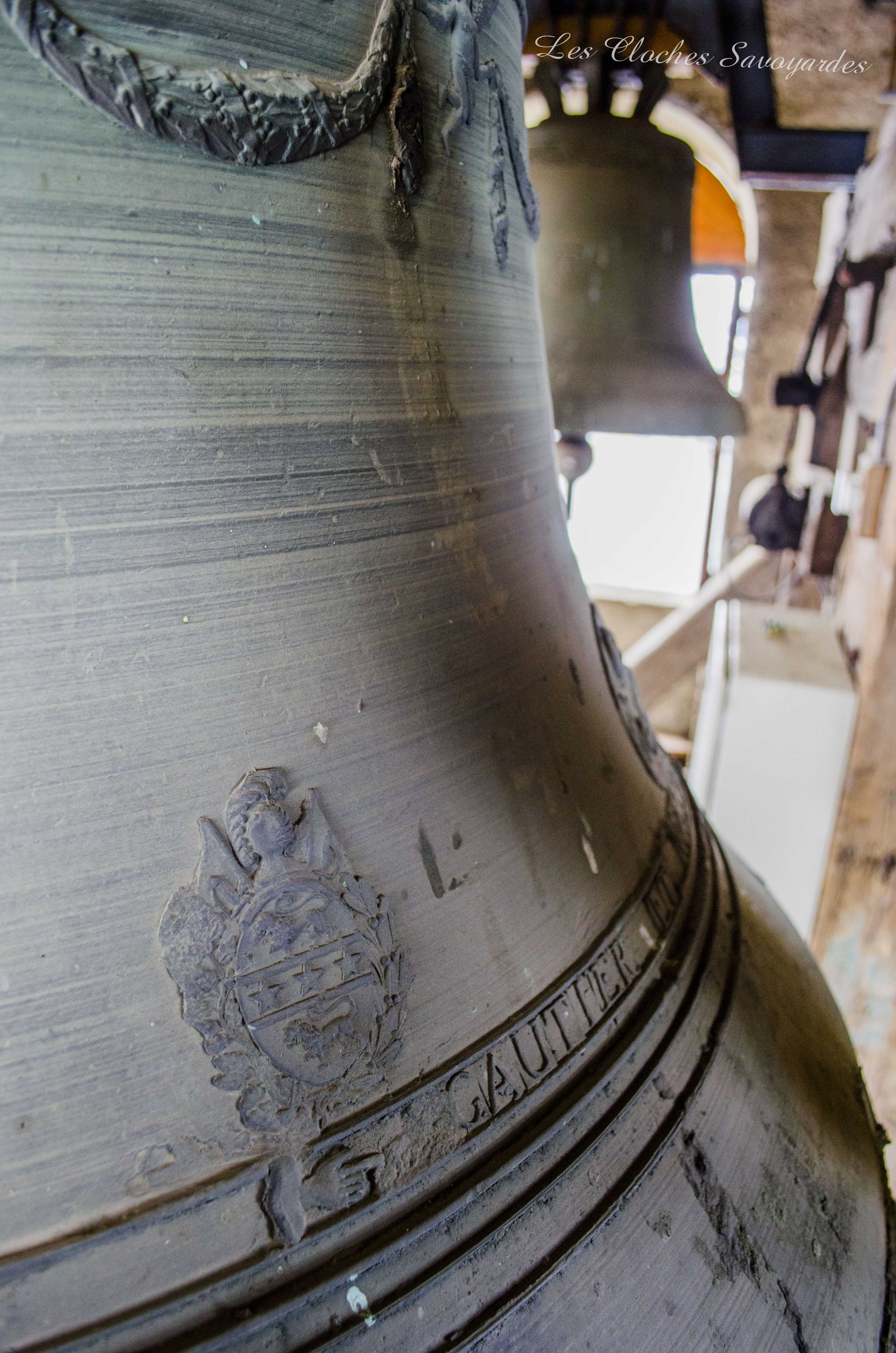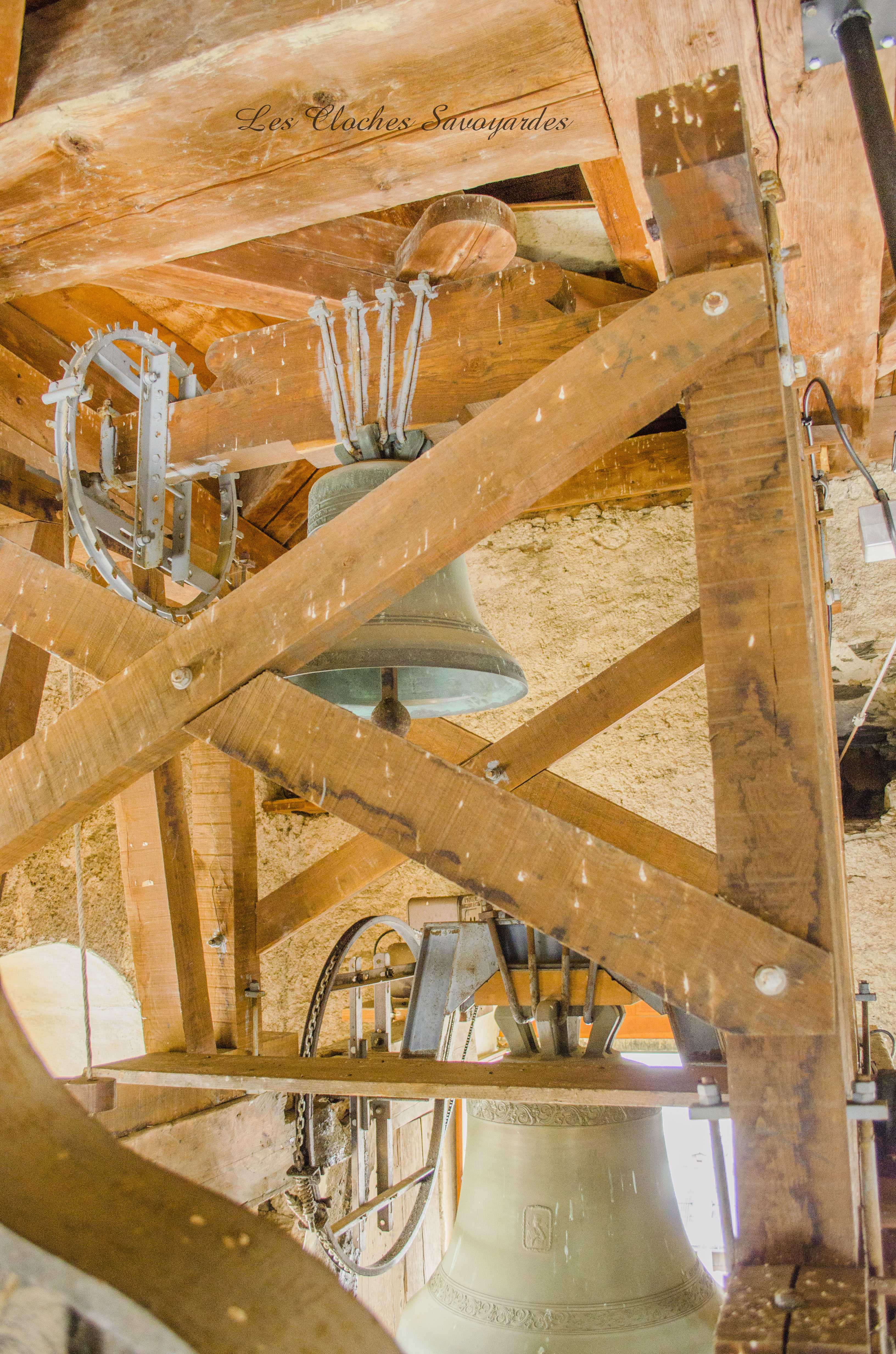 Le clocher -parlons en- a été reconstruit entre 1820 et 1825 ! Lors de cette reconstruction, on installa une première cloche, toujours en place. Elle a été fondue par les fondeurs Vallier & Gautier en 1824, un temps établis à Albertville. Louis Gautier a fondu la même année une des cloches de Queige. Il est difficile de dire si elle en remplace d’autres et si elle tenait compagnie à d’autres vases sonores. Cette cloche est aujourd’hui accompagnée par quatre Paccard livrées par trois générations différentes. La troisième cloche, nommée « Honorine », a été fondue en 1973. Elle est affectueusement surnommée « cloche du midi ». La quatrième porte la date de 1884 et les noms de Georges & Francisque Paccard, illustres représentants de la troisième génération des maîtres-fondeurs. La génération précédente a eu le soin de réaliser deux cloches : Claude Paccard a réalisé en 1851 la plus petite, encore actionnée à la corde, alors que Claude & Jean-Pierre Paccard ont coulé le « bourdon » nommé « Marie-Hélène » à une date inconnue, car non mentionnée. Ses différents motifs et son lieu de fonte nous permettent d’affirmer qu’elle a été fondue entre 1830 et 1857. Il se peut que les archives soient plus bavardes sur son sujet, et j’espère que ce mystère sera résolu un jour! Si cette grosse cloche égrène chaque heure qui passe et ce depuis l’installation d’une horloge mécanique puis électrique en 1914, elle était lancée en volée avec ses sœurs selon un code précis : l’angélus était sonné par la troisième cloche dite « du midi ». Elle sonnait en volée 60 coups. Suivaient les traditionnels 3*3 coups de l’angélus. Cet angélus dit « inversé » était jadis particulièrement prisé par les paroisses de montagne. Les habitants du lieu étaient conviés à l’office divin par une volée de la grosse cloche. Ses 22 quintaux nécessitaient pas moins de trois sonneurs, souvent usés à la fin de la volée. Avant l’électrification en 1949, tout un code prenait place pour annoncer les décès : le curé faisait d’abord quelques coups pour convoquer une dizaine de sonneurs au clocher (au moins huit). Si la personne décédée était mariée, la seconde cloche ouvrait le bal. La troisième cloche était lancée en premier pour un homme célibataire, et la quatrième pour une femme célibataire. Enfin, la plus petite avait préséance pour les plus jeunes. Les cloches étaient lancées pour trois « moeudes » (3* 10 minutes) et si la personne vivait dans un hameau, elles n’en sonnait que deux, car la chapelle aussi sonnait deux « moeudes ». Les membres des confréries avaient eux aussi droit à des sonneries particulières, mais plus aucune archive ne nous les décrit. Lors des fêtes religieuses, des mariages et des baptêmes, le carillon jouait un mélodie joyeuse. Il pouvait aussi résonner lors des sépultures d’enfants en bas âge car ceux ci étaient considérés comme des anges qui montaient directement au ciel. Le soir de Toussaint, les cloches sonnaient un autre glas : elles tintaient l’une après l’autre, jusqu’à minuit. Encore aujourd’hui, elles font partie intégrante du paysage sonore de la commune.