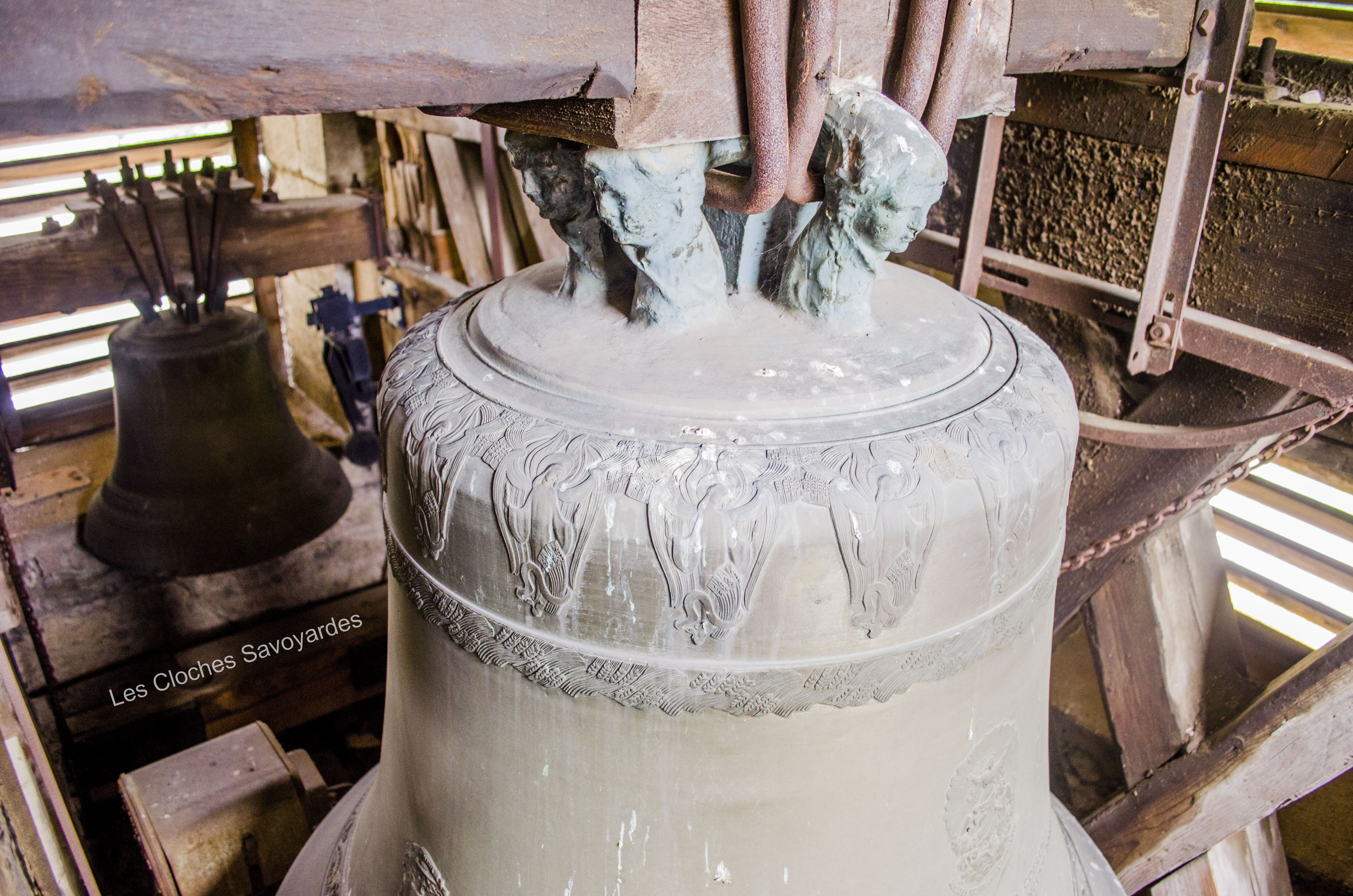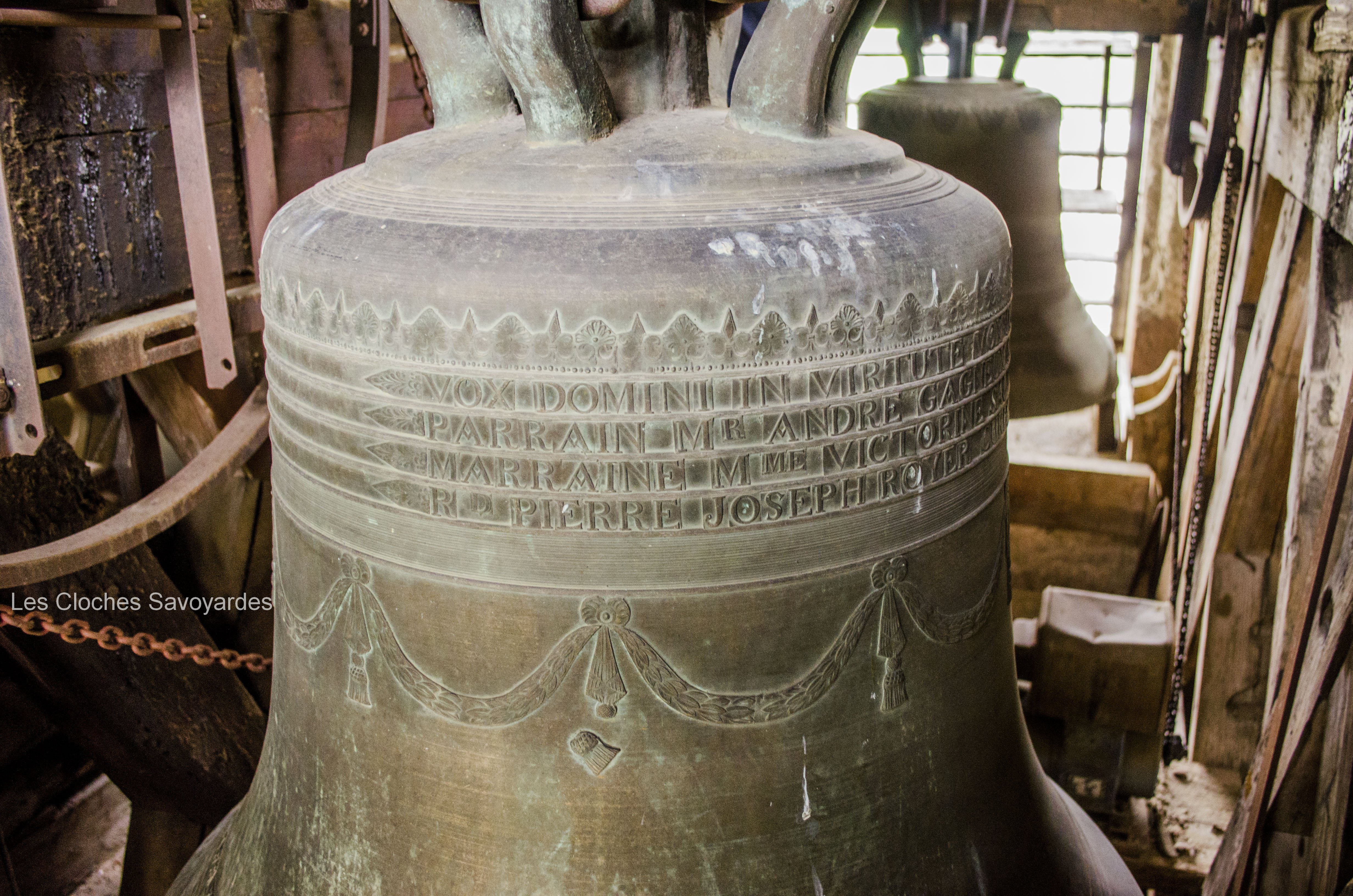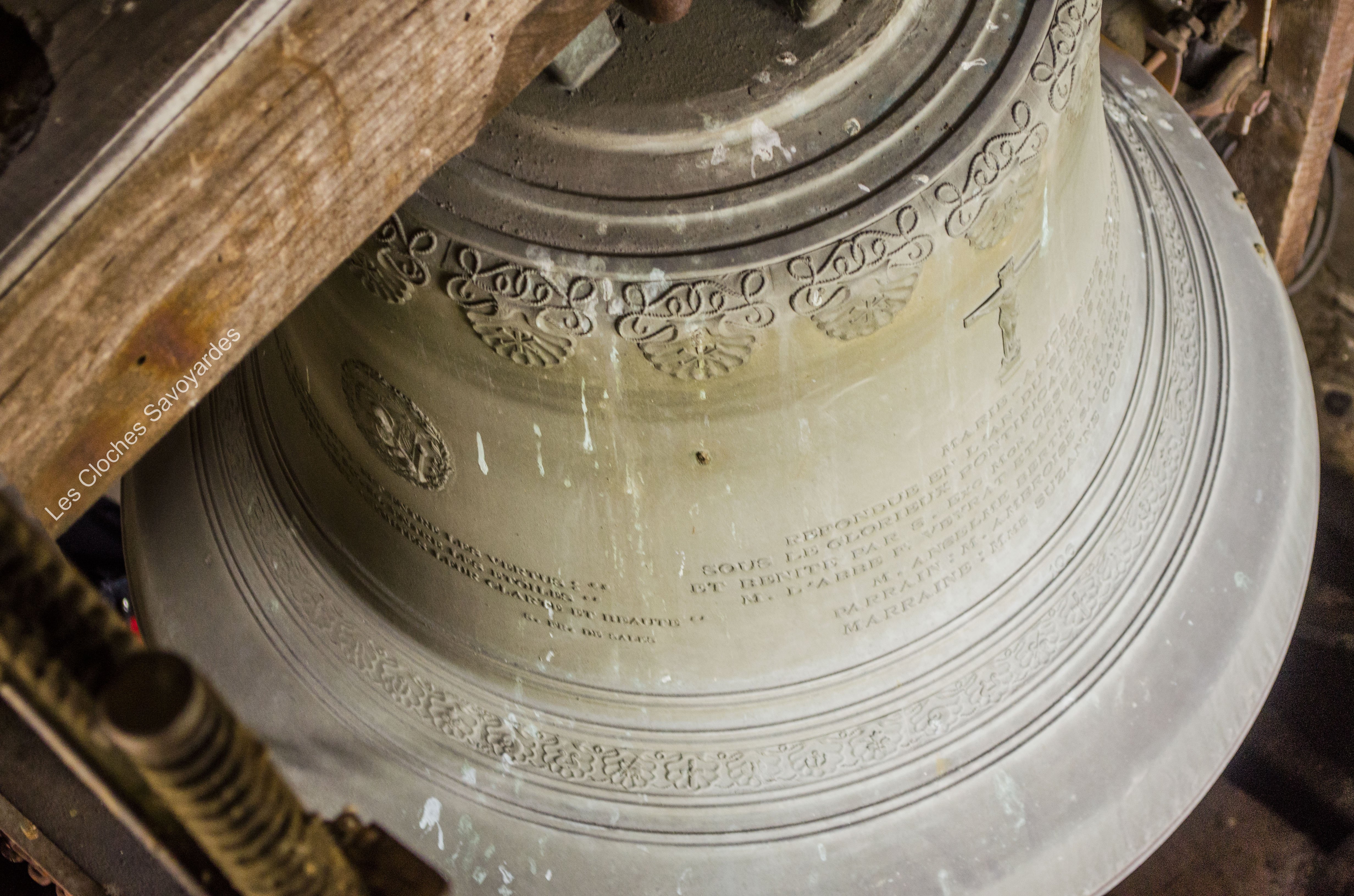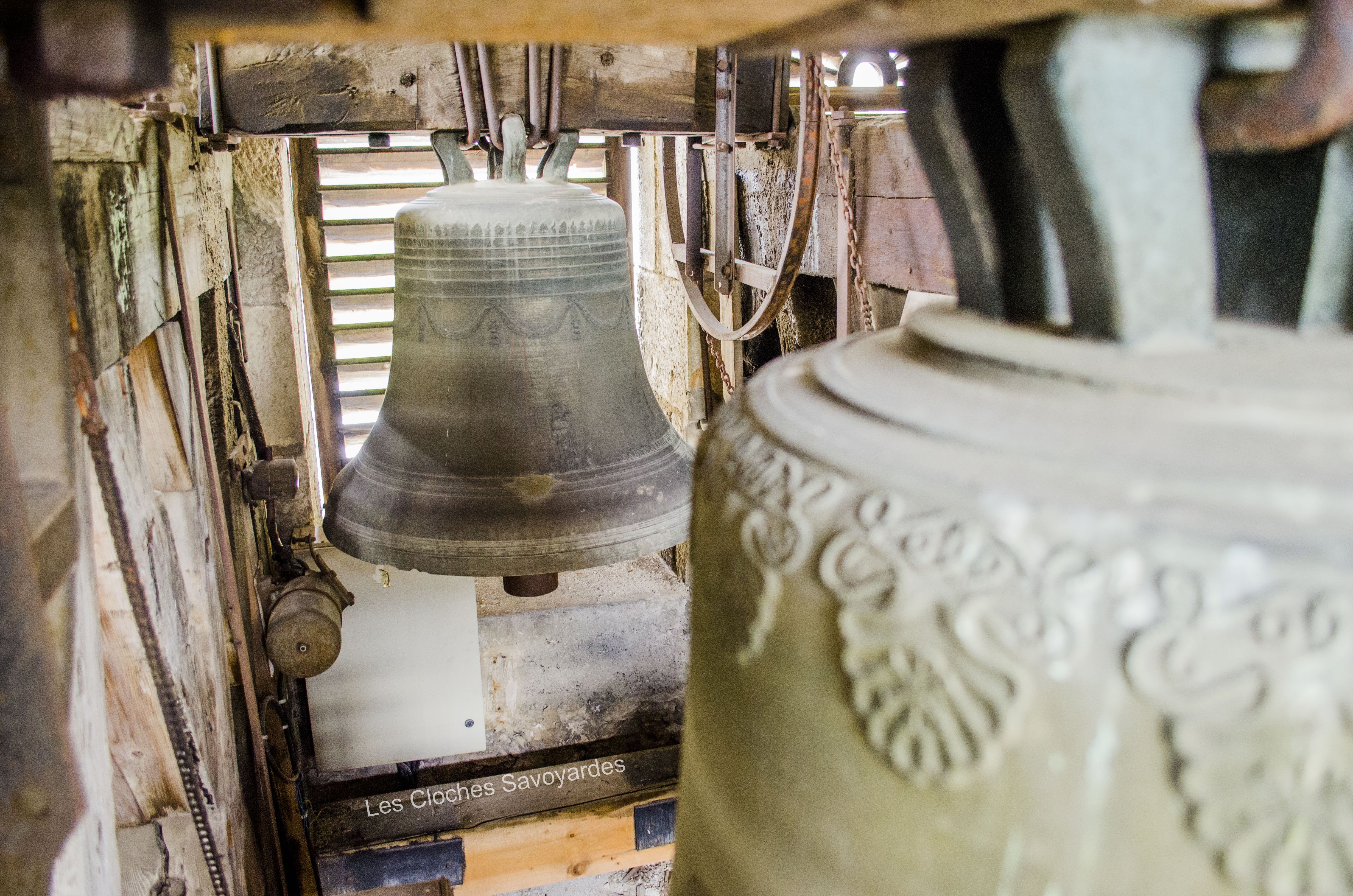 De la période sarde ne subsiste que la seconde cloche, fondue en 1840. Surnommée « Victorine » -du nom de sa marraine-, elle fut fondue sous le mandat du syndic (maire) -son parrain- M. André Gagneux. Le curé de l’époque était le Rd Pierre-Joseph Royer. Si cette cloche a pu survivre au remaniement de la sonnerie de 1952, contrairement à ses trois sœurs -dont nous ne savons rien-, elle n’a cependant pas été épargnée. Elle a été réaccordée afin de convenir aux exigences musicales de l’époque. A son retour, elle a été suivie par « Marie-Roberte », « Marie-Alice » et « Marie-Jeanne-Thérèse-Clothilde ». Ces trois cloches, qui portent la mention « refondue en 1952 », ont été bénies sous le pontificat de S.S. le Pape Pie XII, l’épiscopat de Mgr Auguste Cesbron, le mandat de l’Abbé François Veyrat, curé, et du maire Anselme Berthet, parrain de la grosse cloche. Les connaisseurs remarqueront que contrairement aux usages de l’époque, le beffroi et les jougs en bois n’ont pas été troqués contre de vulgaires poutrelles en acier. La fonderie Paccard, en charge de la restauration de l’ensemble campanaire, a même eu la délicatesse de réemployer les montures des anciennes cloches en adaptant les assises des anses. La décoration des nouvelles messagères est aussi de toute beauté. Si la doyenne possède un Crucifix et une Vierge à l’Enfant -typiques des cloches savoyardes de l’époque- les autres cloches arborent de multitudes de symboles chrétiens comme le Panis Angelicus ou l’Agneau Pascal. Elles citent également de nombreuses paroles de saints. Je me permets de notifier l’une d’entre elles, signée saint François de Sales « La charité est entre les vertus comme le soleil est entre les étoiles, elle leur distribue toute leur clarté et beauté ».