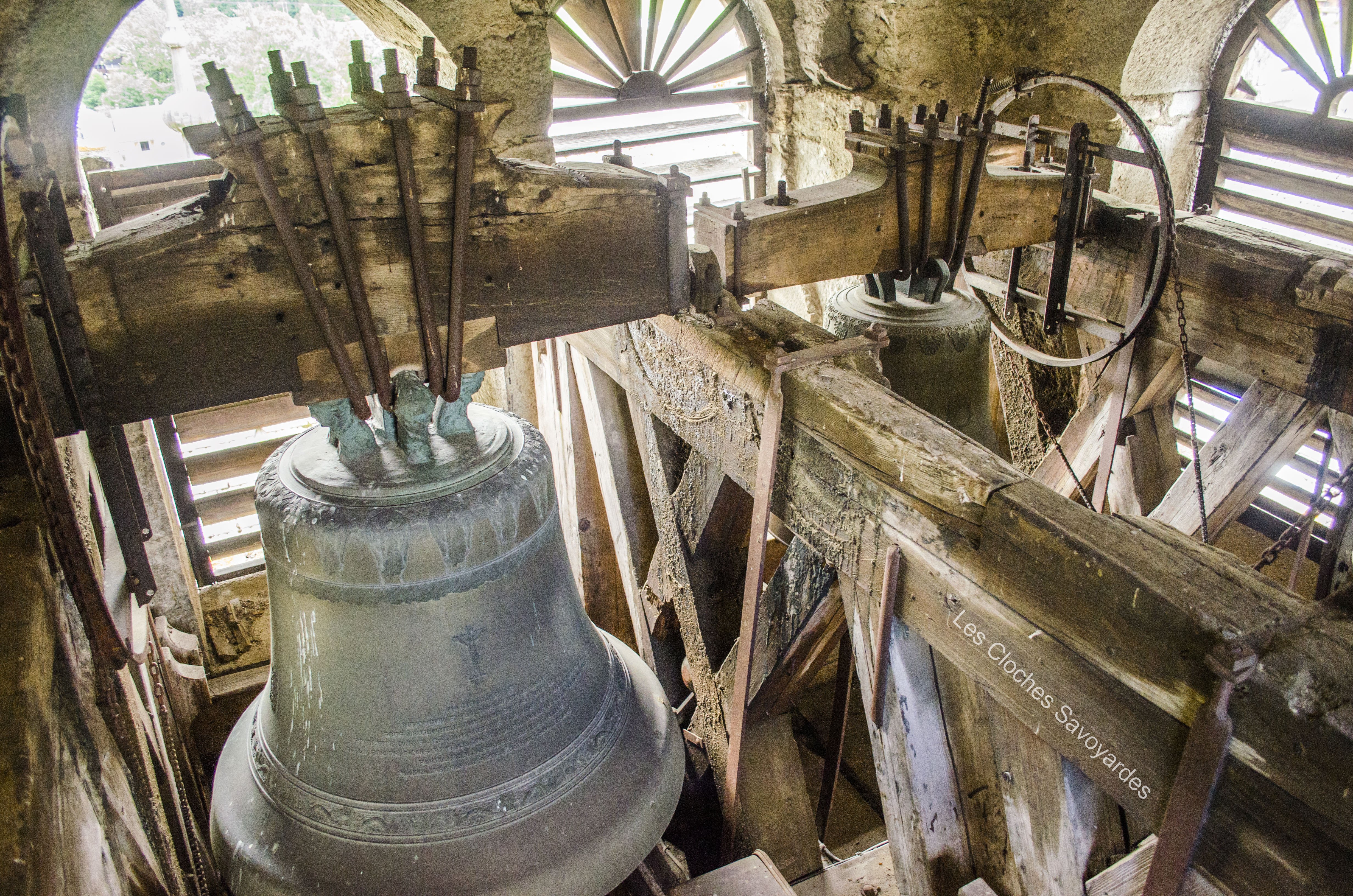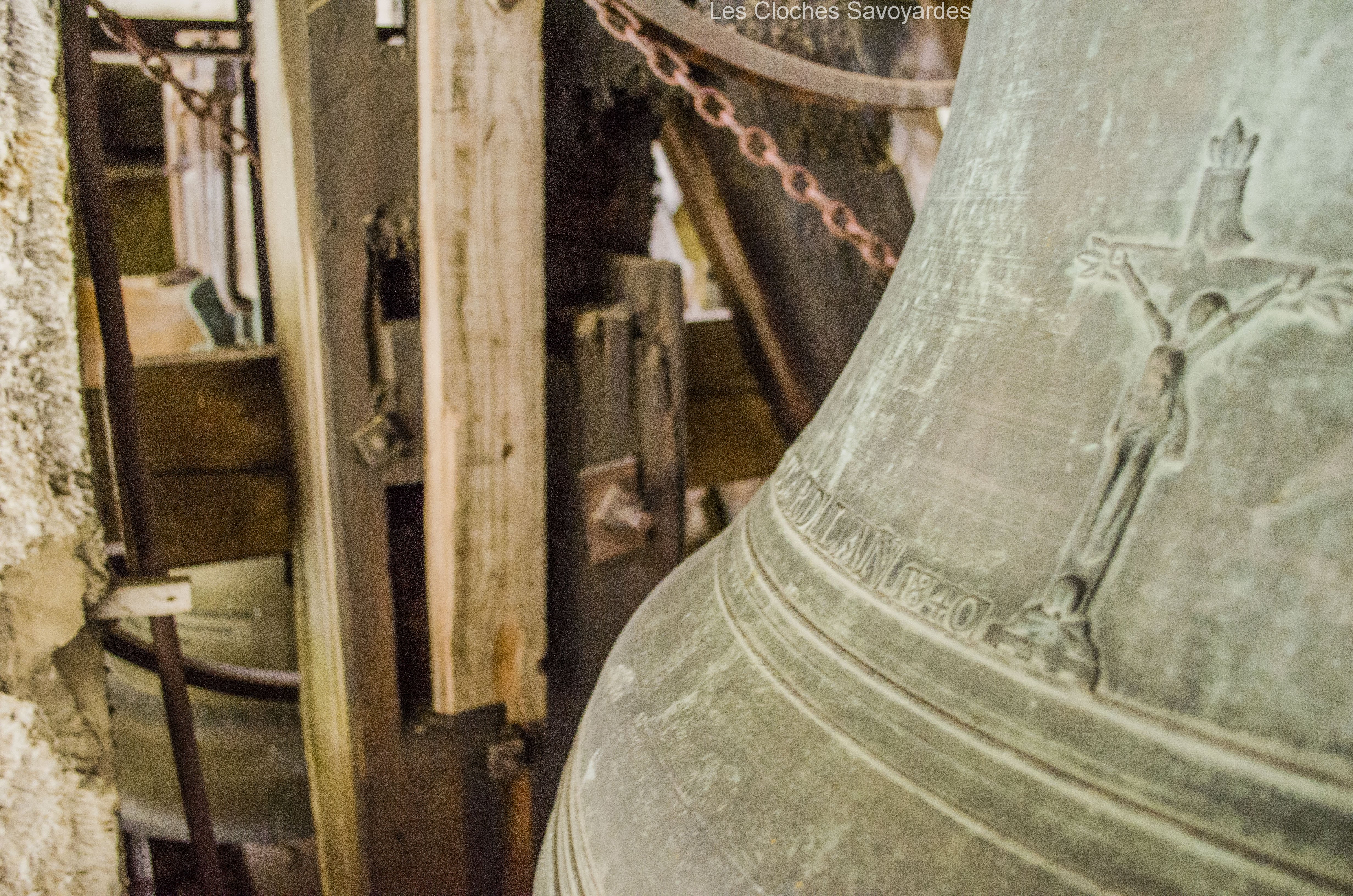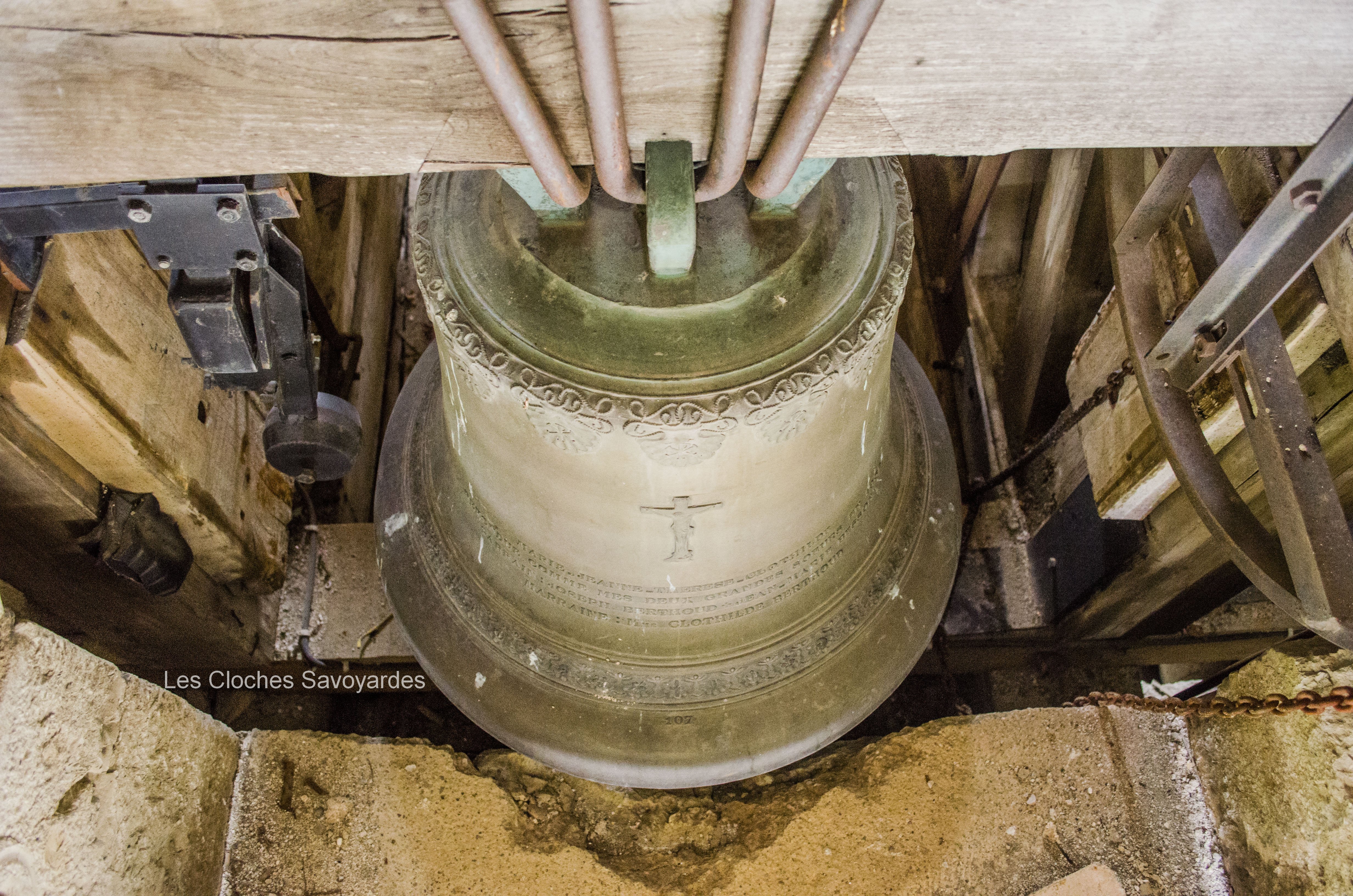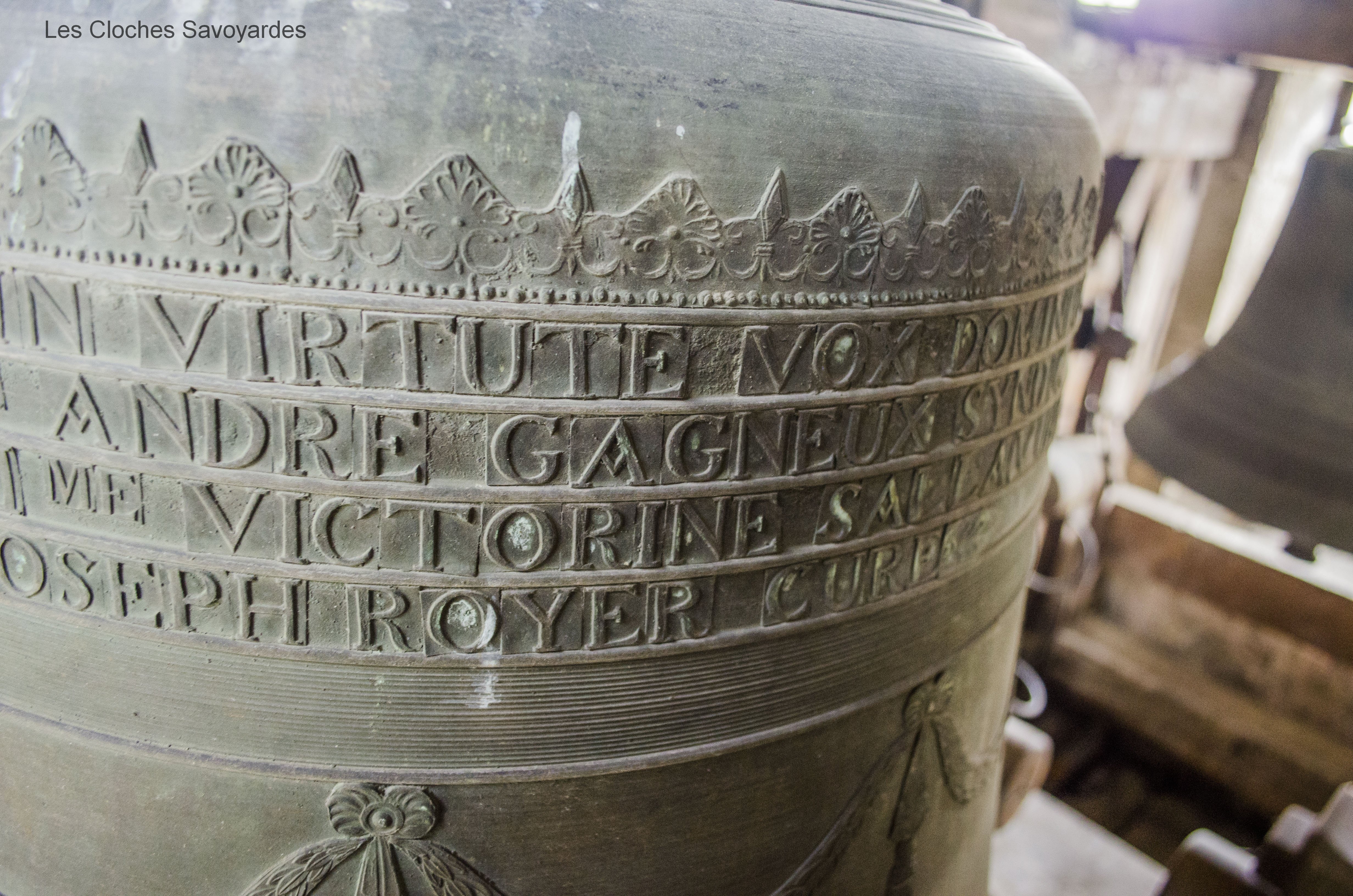 De la période sarde ne subsiste que la seconde cloche, fondue en 1840. Surnommée « Victorine » -du nom de sa marraine-, elle fut fondue sous le mandat du syndic (maire) -son parrain- M. André Gagneux. Le curé de l’époque était le Rd Pierre-Joseph Royer. Si cette cloche a pu survivre au remaniement de la sonnerie de 1952, contrairement à ses trois sœurs -dont nous ne savons rien-, elle n’a cependant pas été épargnée. Elle a été réaccordée afin de convenir aux exigences musicales de l’époque. A son retour, elle a été suivie par « Marie-Roberte », « Marie-Alice » et « Marie-Jeanne-Thérèse-Clothilde ». Ces trois cloches, qui portent la mention « refondue en 1952 », ont été bénies sous le pontificat de S.S. le Pape Pie XII, l’épiscopat de Mgr Auguste Cesbron, le mandat de l’Abbé François Veyrat, curé, et du maire Anselme Berthet, parrain de la grosse cloche. Les connaisseurs remarqueront que contrairement aux usages de l’époque, le beffroi et les jougs en bois n’ont pas été troqués contre de vulgaires poutrelles en acier. La fonderie Paccard, en charge de la restauration de l’ensemble campanaire, a même eu la délicatesse de réemployer les montures des anciennes cloches en adaptant les assises des anses. La décoration des nouvelles messagères est aussi de toute beauté. Si la doyenne possède un Crucifix et une Vierge à l’Enfant -typiques des cloches savoyardes de l’époque- les autres cloches arborent de multitudes de symboles chrétiens comme le Panis Angelicus ou l’Agneau Pascal. Elles citent également de nombreuses paroles de saints. Je me permets de notifier l’une d’entre elles, signée saint François de Sales « La charité est entre les vertus comme le soleil est entre les étoiles, elle leur distribue toute leur clarté et beauté ».