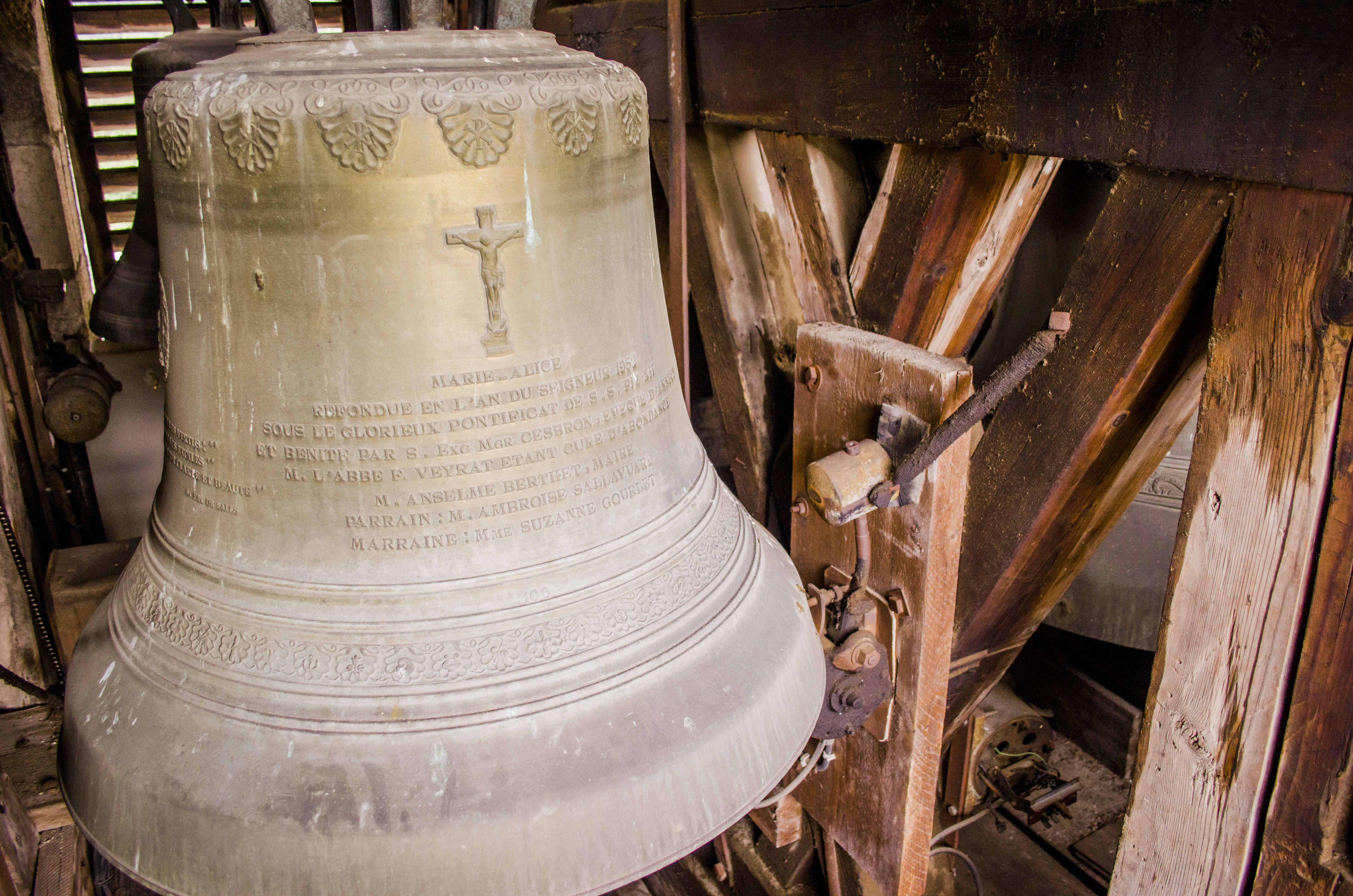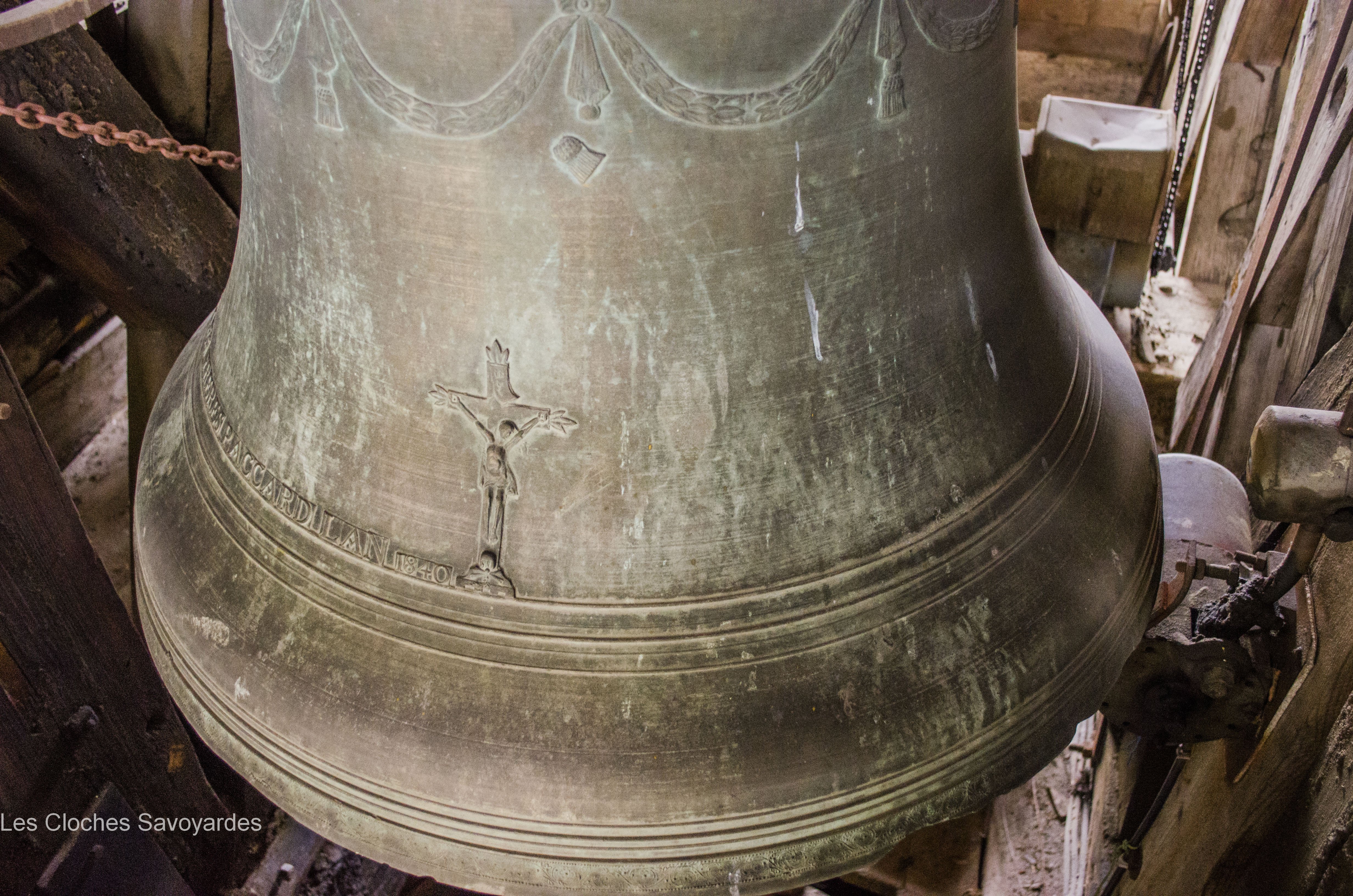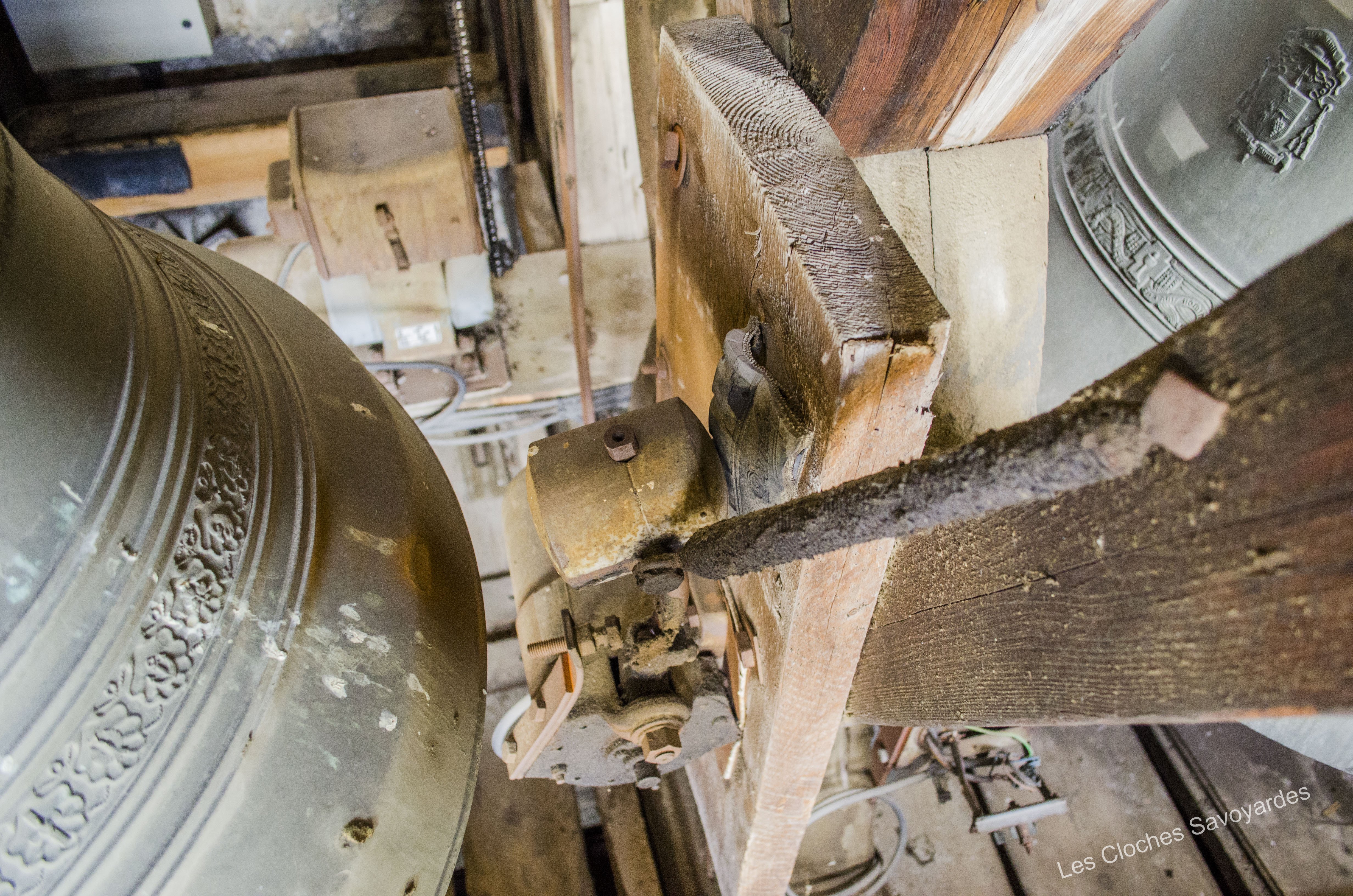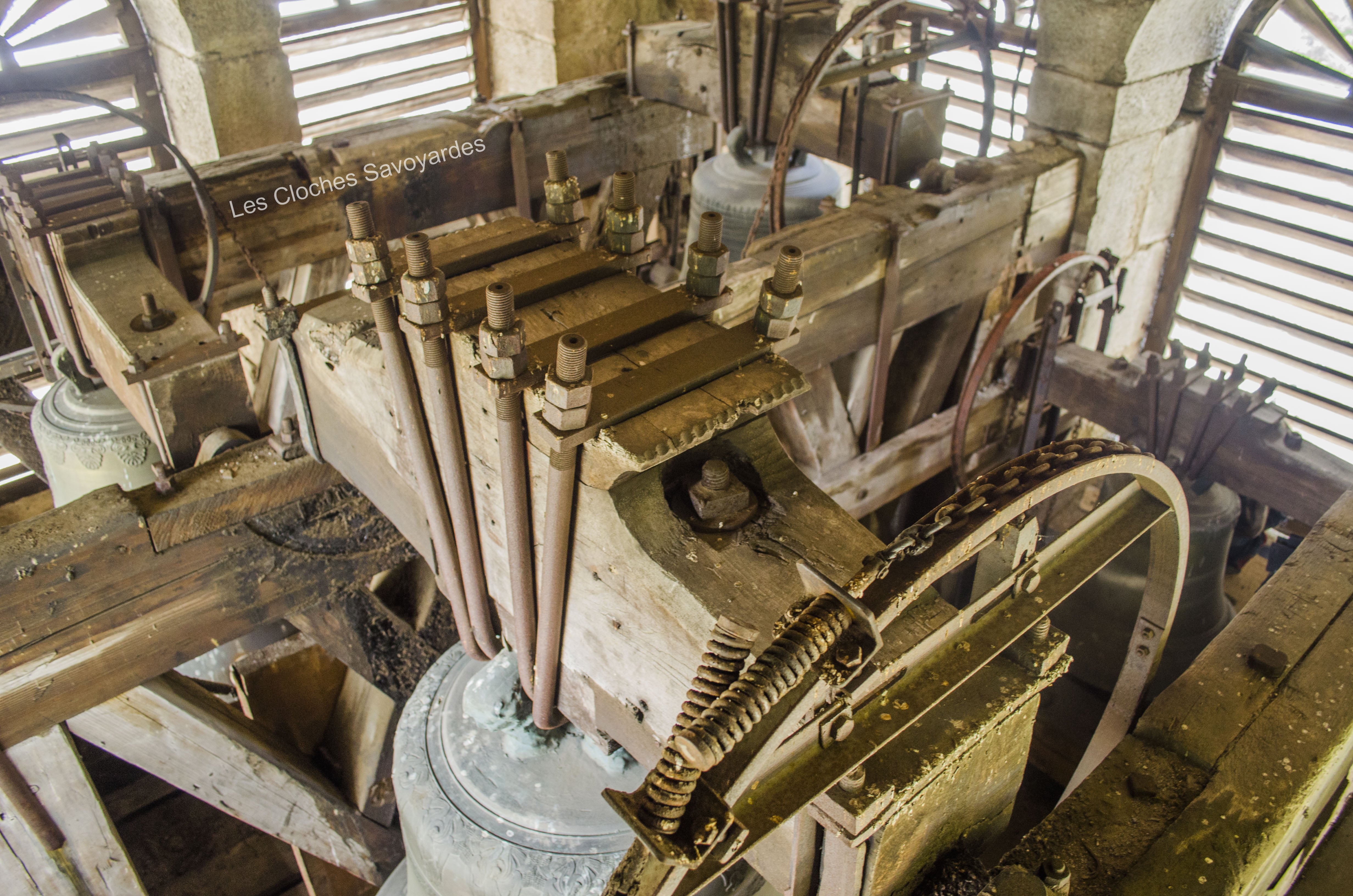 De la période sarde ne subsiste que la seconde cloche, fondue en 1840. Surnommée « Victorine » -du nom de sa marraine-, elle fut fondue sous le mandat du syndic (maire) -son parrain- M. André Gagneux. Le curé de l’époque était le Rd Pierre-Joseph Royer. Si cette cloche a pu survivre au remaniement de la sonnerie de 1952, contrairement à ses trois sœurs -dont nous ne savons rien-, elle n’a cependant pas été épargnée. Elle a été réaccordée afin de convenir aux exigences musicales de l’époque. A son retour, elle a été suivie par « Marie-Roberte », « Marie-Alice » et « Marie-Jeanne-Thérèse-Clothilde ». Ces trois cloches, qui portent la mention « refondue en 1952 », ont été bénies sous le pontificat de S.S. le Pape Pie XII, l’épiscopat de Mgr Auguste Cesbron, le mandat de l’Abbé François Veyrat, curé, et du maire Anselme Berthet, parrain de la grosse cloche. Les connaisseurs remarqueront que contrairement aux usages de l’époque, le beffroi et les jougs en bois n’ont pas été troqués contre de vulgaires poutrelles en acier. La fonderie Paccard, en charge de la restauration de l’ensemble campanaire, a même eu la délicatesse de réemployer les montures des anciennes cloches en adaptant les assises des anses. La décoration des nouvelles messagères est aussi de toute beauté. Si la doyenne possède un Crucifix et une Vierge à l’Enfant -typiques des cloches savoyardes de l’époque- les autres cloches arborent de multitudes de symboles chrétiens comme le Panis Angelicus ou l’Agneau Pascal. Elles citent également de nombreuses paroles de saints. Je me permets de notifier l’une d’entre elles, signée saint François de Sales « La charité est entre les vertus comme le soleil est entre les étoiles, elle leur distribue toute leur clarté et beauté ».