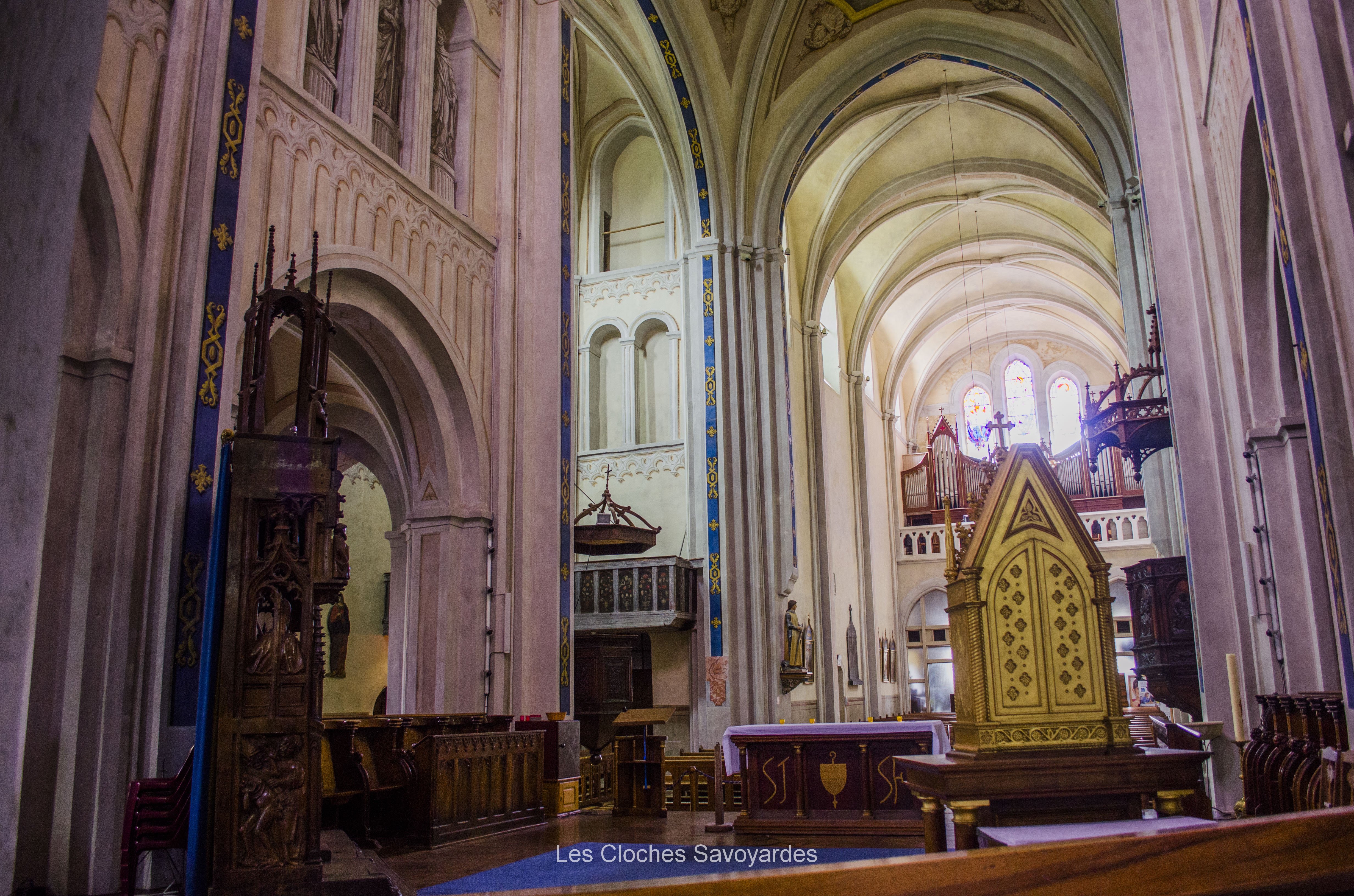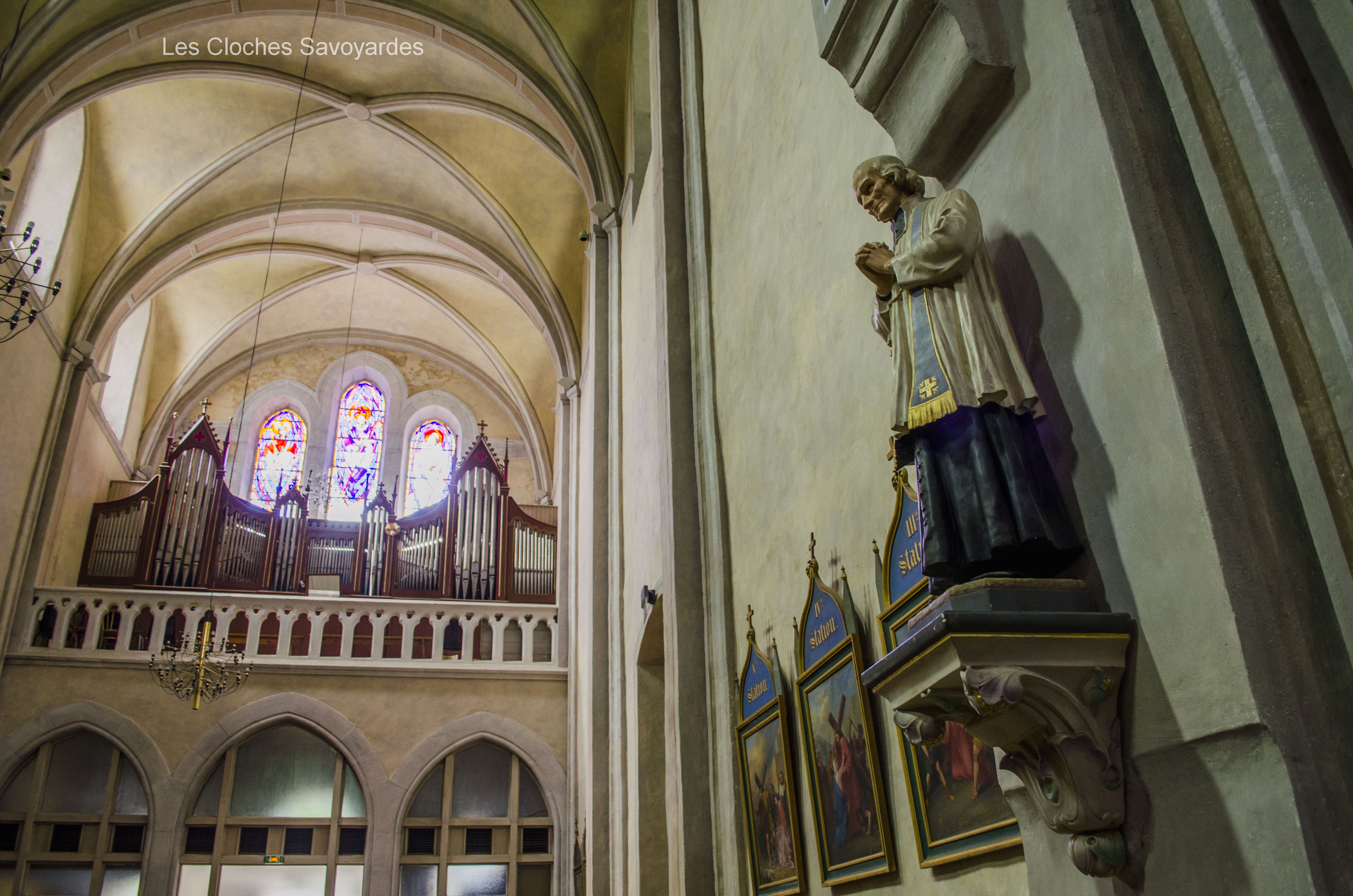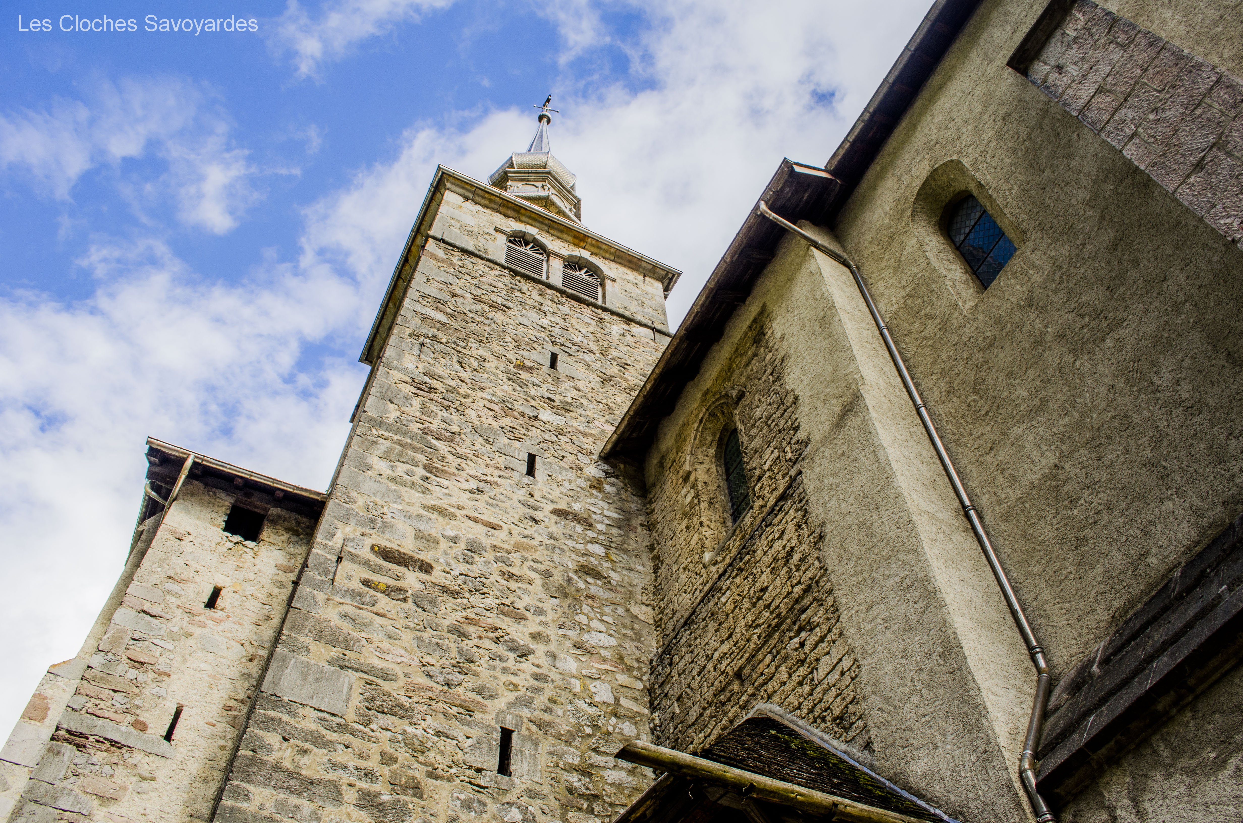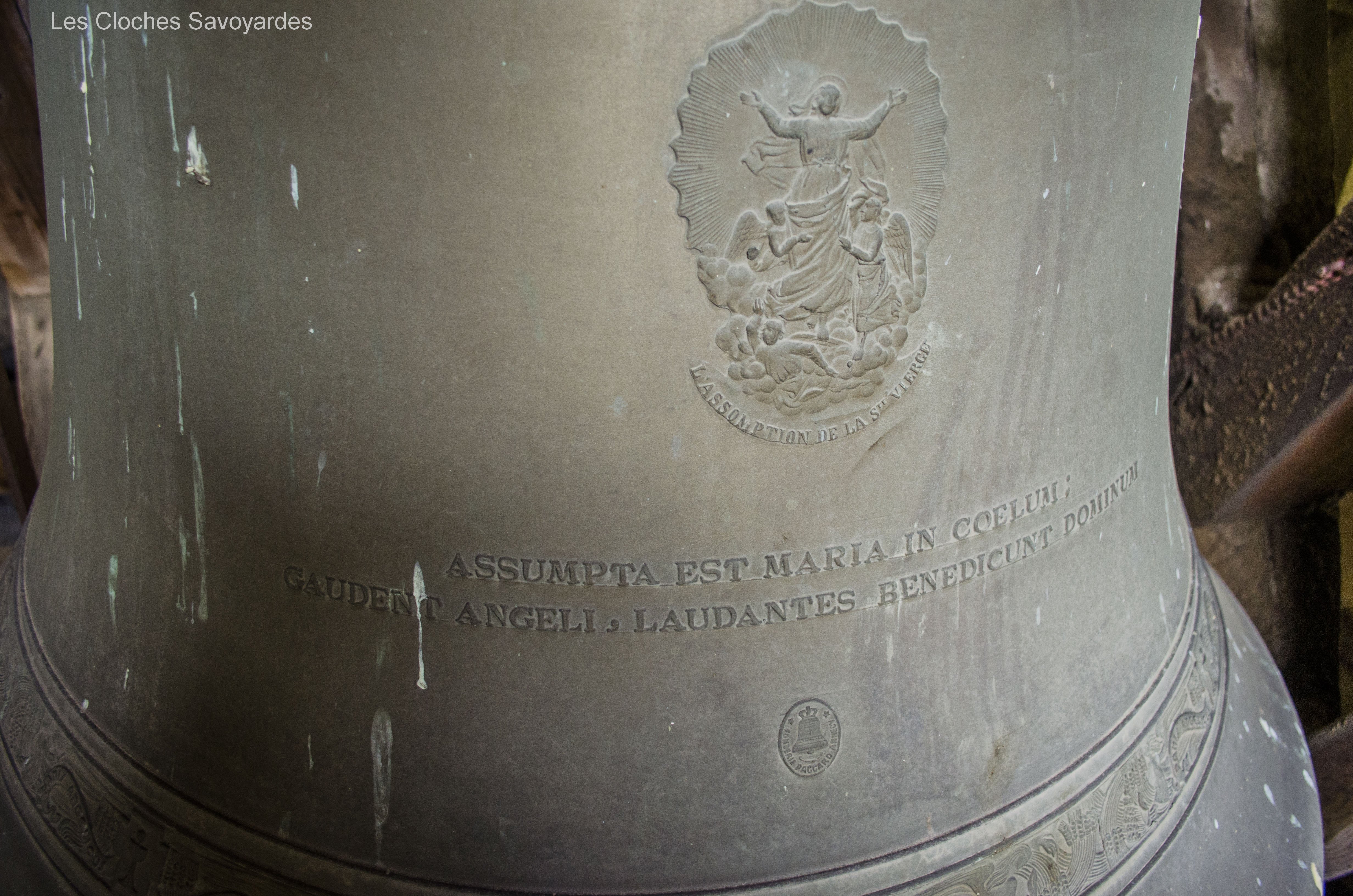 De la période sarde ne subsiste que la seconde cloche, fondue en 1840. Surnommée « Victorine » -du nom de sa marraine-, elle fut fondue sous le mandat du syndic (maire) -son parrain- M. André Gagneux. Le curé de l’époque était le Rd Pierre-Joseph Royer. Si cette cloche a pu survivre au remaniement de la sonnerie de 1952, contrairement à ses trois sœurs -dont nous ne savons rien-, elle n’a cependant pas été épargnée. Elle a été réaccordée afin de convenir aux exigences musicales de l’époque. A son retour, elle a été suivie par « Marie-Roberte », « Marie-Alice » et « Marie-Jeanne-Thérèse-Clothilde ». Ces trois cloches, qui portent la mention « refondue en 1952 », ont été bénies sous le pontificat de S.S. le Pape Pie XII, l’épiscopat de Mgr Auguste Cesbron, le mandat de l’Abbé François Veyrat, curé, et du maire Anselme Berthet, parrain de la grosse cloche. Les connaisseurs remarqueront que contrairement aux usages de l’époque, le beffroi et les jougs en bois n’ont pas été troqués contre de vulgaires poutrelles en acier. La fonderie Paccard, en charge de la restauration de l’ensemble campanaire, a même eu la délicatesse de réemployer les montures des anciennes cloches en adaptant les assises des anses. La décoration des nouvelles messagères est aussi de toute beauté. Si la doyenne possède un Crucifix et une Vierge à l’Enfant -typiques des cloches savoyardes de l’époque- les autres cloches arborent de multitudes de symboles chrétiens comme le Panis Angelicus ou l’Agneau Pascal. Elles citent également de nombreuses paroles de saints. Je me permets de notifier l’une d’entre elles, signée saint François de Sales « La charité est entre les vertus comme le soleil est entre les étoiles, elle leur distribue toute leur clarté et beauté ».