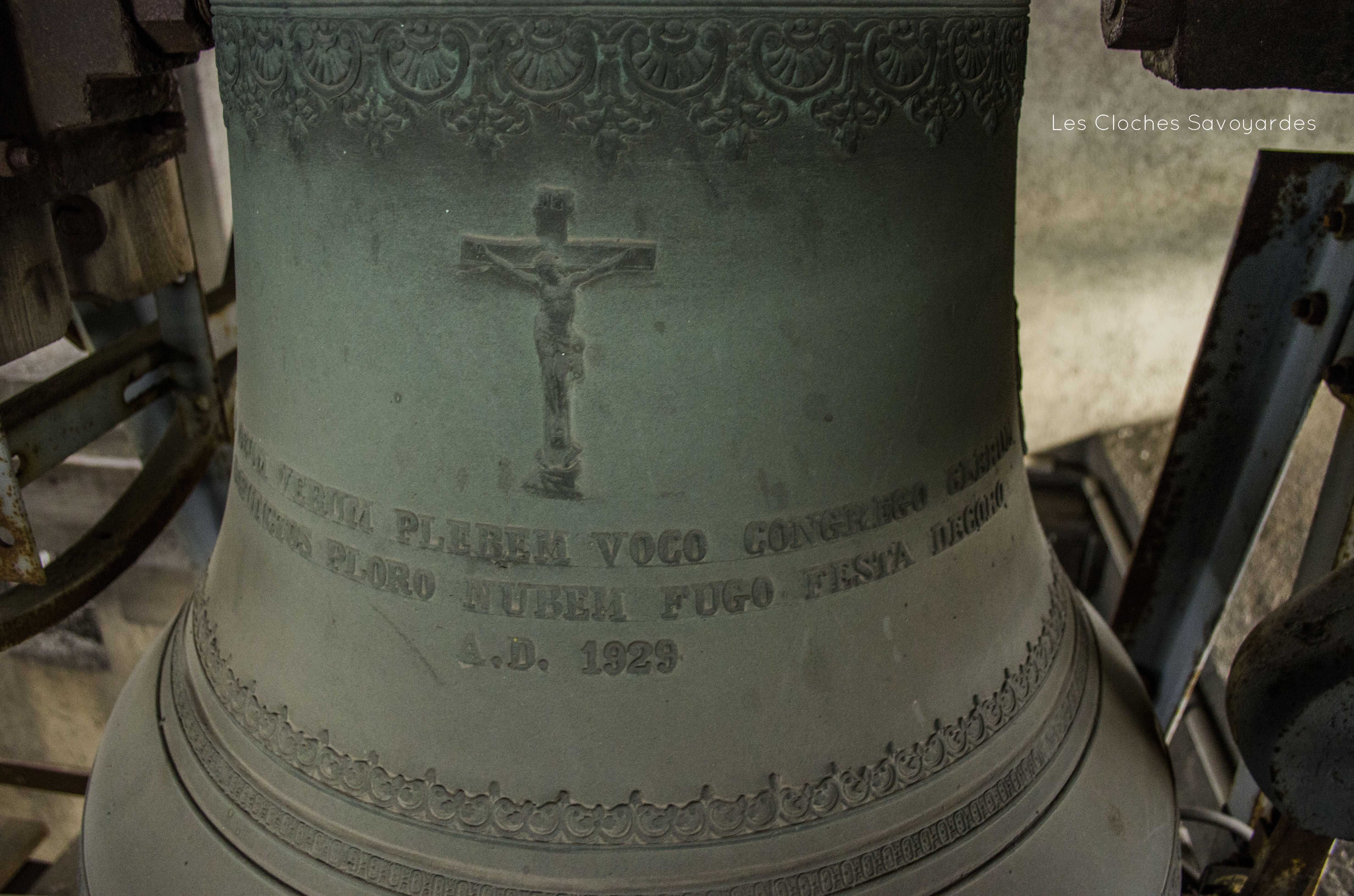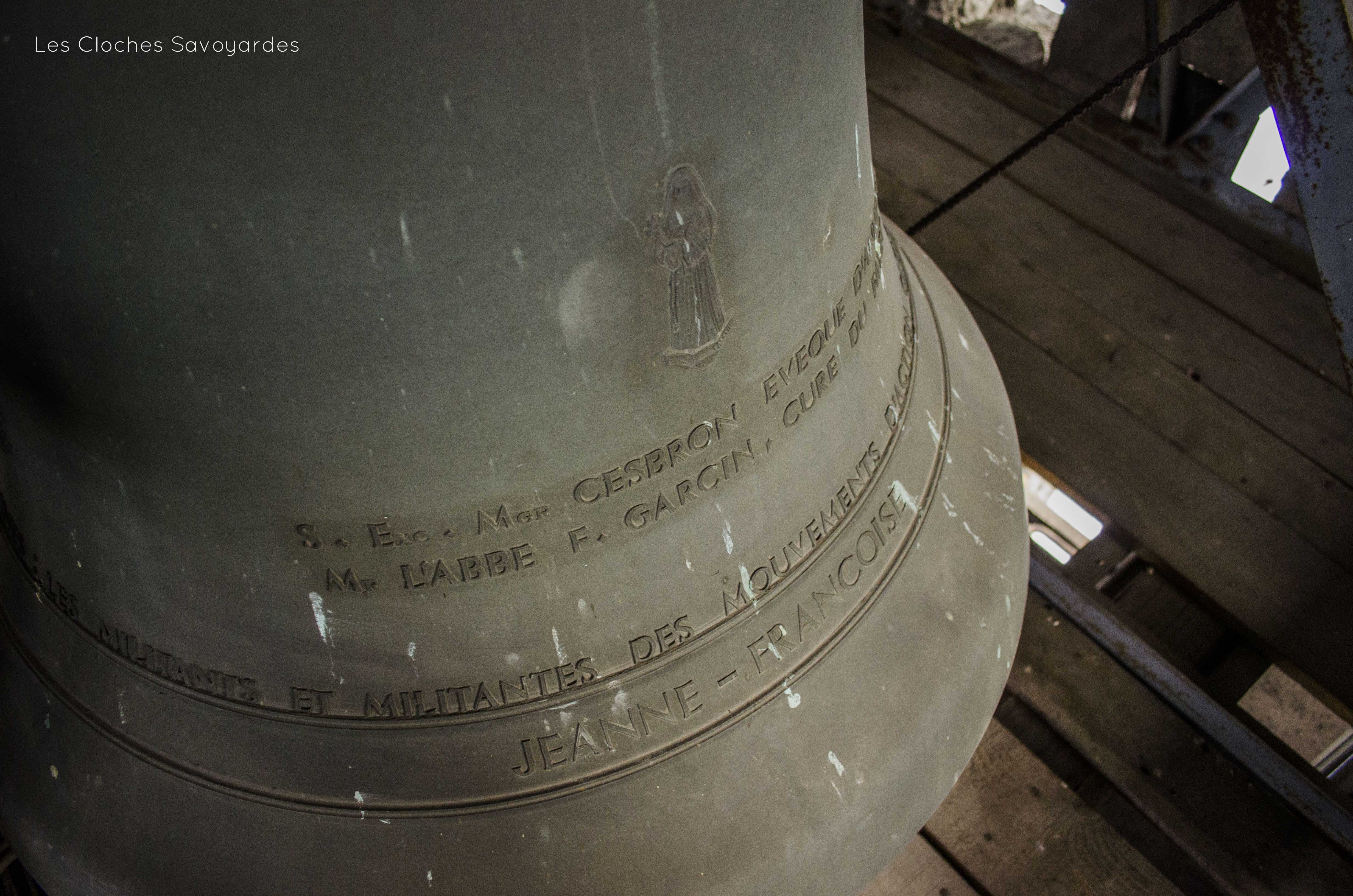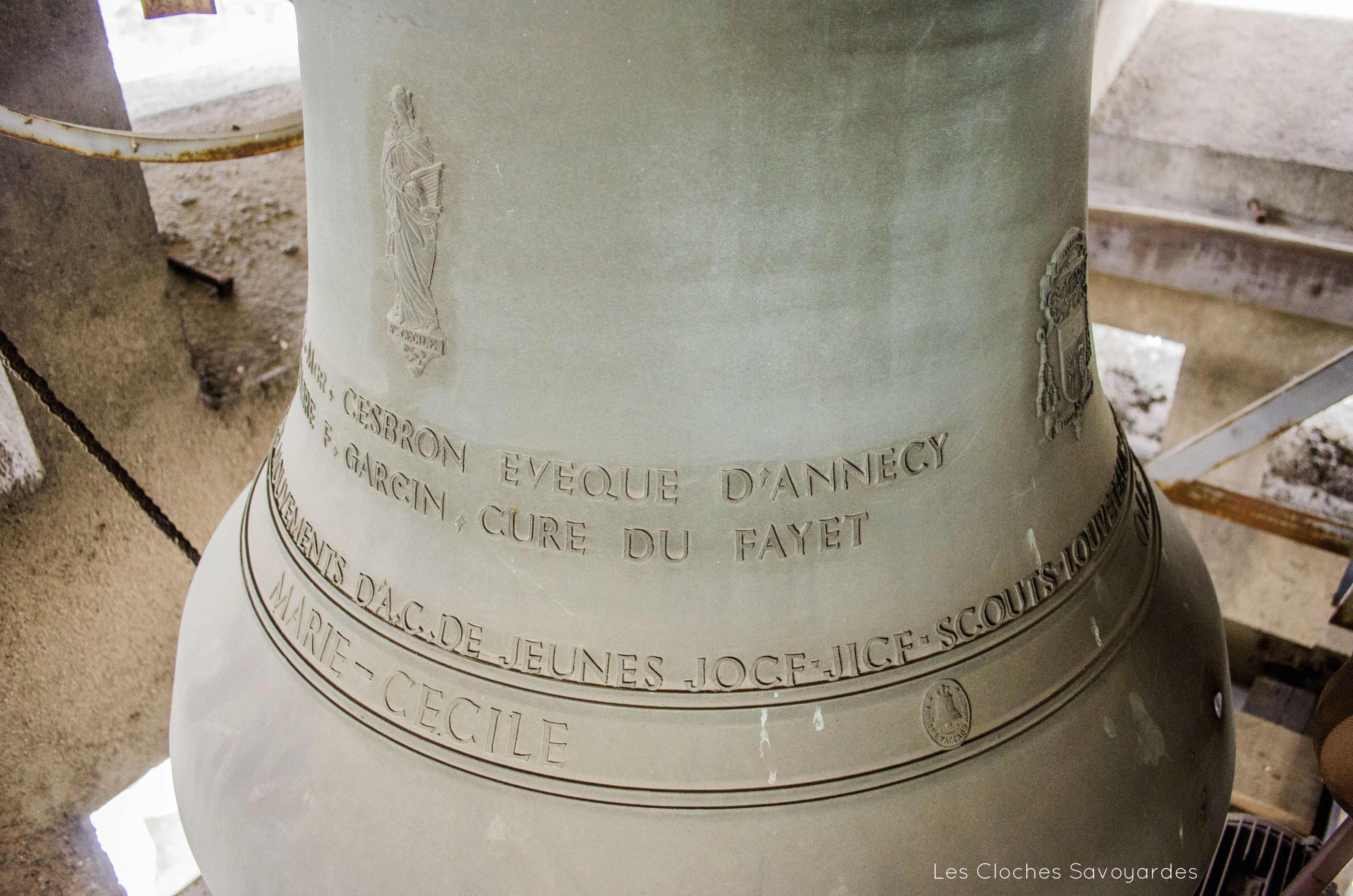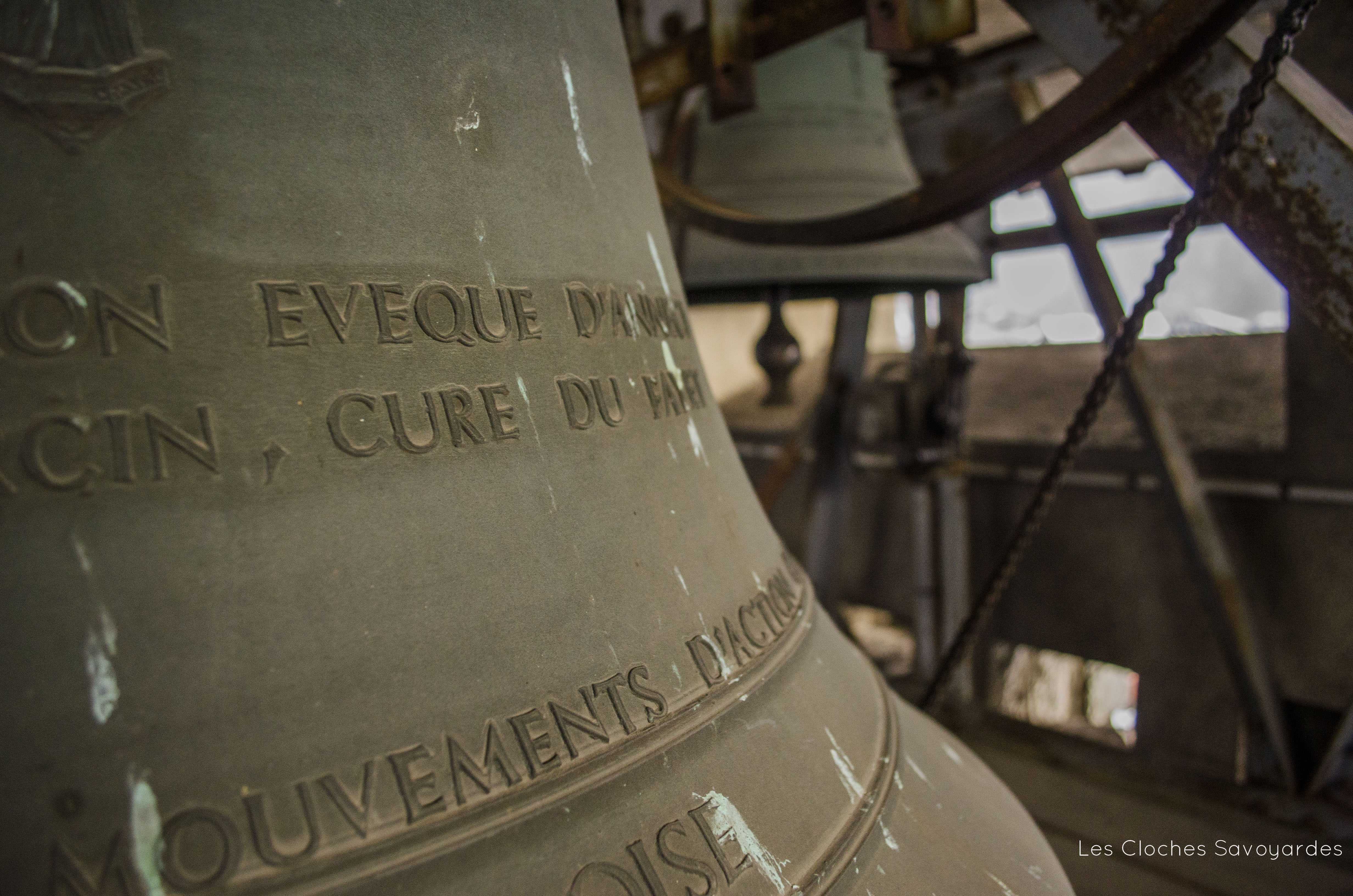 Le clocher abrite aujourd’hui trois cloches. Datée de 1929 et portant comme uniques inscriptions un psaume rappelant son usage, elle semblerait provenir du clocheton de l’église provisoire que remplace le lieu de culte actuel. Cependant, une histoire racontée par Jules Ancey indique que cette cloche était destinée à une chapelle édifiée par l’abbé Claret, probablement à Vallorcine. Déposée de son clocher qui était en ruine, cette cloche fut d’abord entreposée en gare de Vallorcine avant d’être acheminée au Fayet sur demande du chef de dépôt du lieu qui avait connaissance de cette cloche. Alors, il s’en servit d’abord comme vase. Puis, l’abbé Domenget -qui a eu connaissance de cette cloche- la racheta afin de l’installer au clocher du Fayet. L’histoire précise que la cloche, d’abord seule, a été rejointe par d’autres. C’est en effet le cas (nous y reviendrons). Cependant, il paraît plus probable que la cloche soit issue de l’église provisoire qui ne possédait qu’un maigre clocheton en bois. De plus, la date de 1929 coïncide avec l’érection de la paroisse par l’évêque d’Annecy. Entre 1959 et 1962, deux cloches plus grosses viennent tenir compagnie à la plus petite. Si la date de commande -ou de fonte- n’est pas mentionnée, deux religieux sont cités et aident a situer leur achat : l’abbé Garcin (installé vers 1959) et Mgr Cesbron, évêque d’Annecy, décédé en fonctions en 1962. C’est donc dans cet intervalle qu’est situé l’achat de « Jeanne-Françoise » et « Marie-Cécile ». Aujourd’hui, les trois cloches se font entendre pour des mariages ou baptêmes. Pour les offices, seules les deux grosses cloches sont sonnées alors que la petite chante les angélus quotidiens. Enfin, la grosse cloche, est actionnée lors des obsèques.