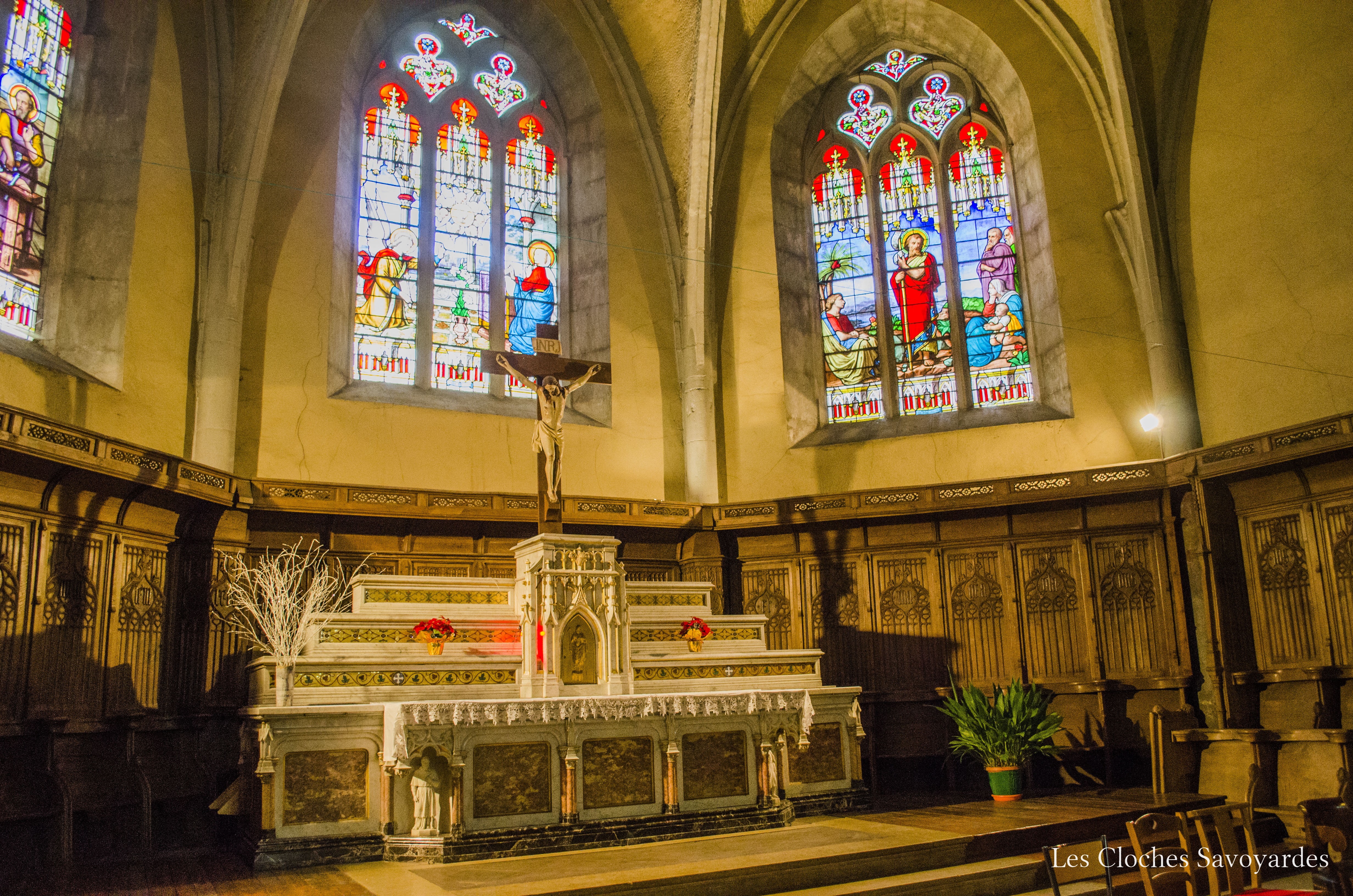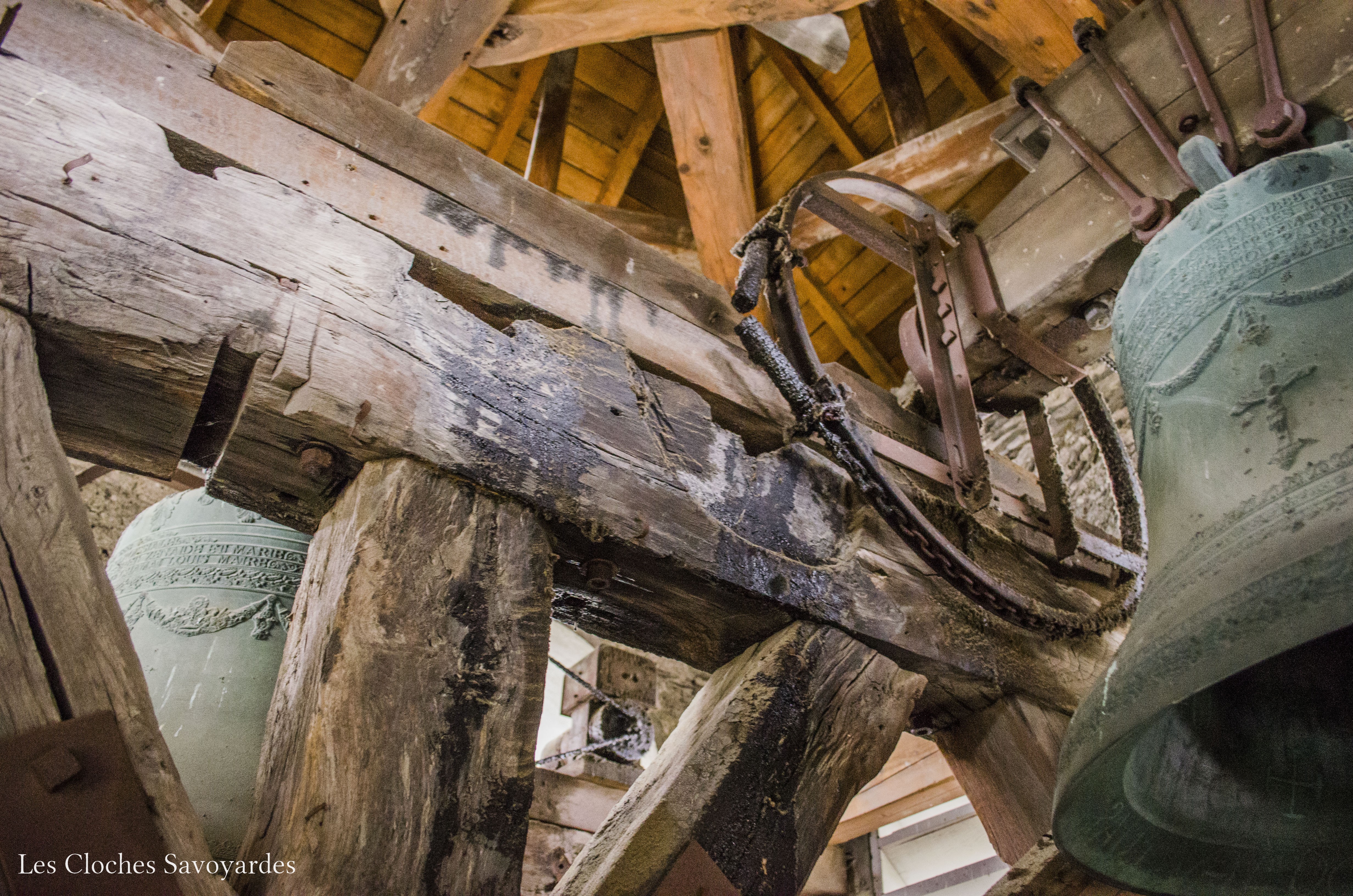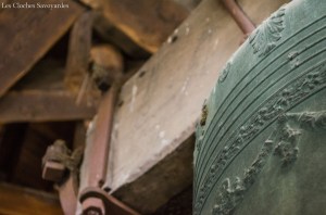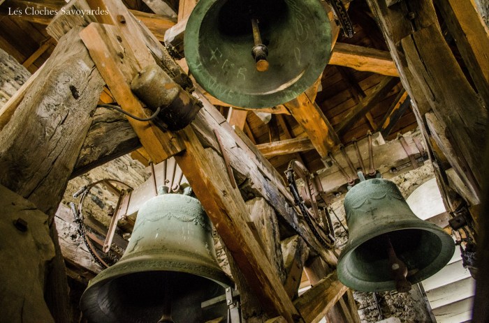 Trois cloches habitent le clocher. Elles ne sont en aucun cas historiques mais l’intérêt est toujours présent. La plus petite cloche a été fondue en 1852 par les frères Paccard alors installés à Quintal. Deux cloches plus grandes ont été ajoutées ou refondues en 1888 par la génération suivante : Georges & Francisque Paccard. Le beffroi en bois semble avoir traversé les âges. Il est volontiers plus bavard que les cloches. Il semblerait qu’il n’ait accueilli que deux cloches car la travée des deux petites montre un seul emplacement au centre. Il est aujourd’hui rendu inaccessible par des ajouts de poutres au dessus de celui-ci, sans doutes pour soutenir plus facilement les deux cloches actuelles.