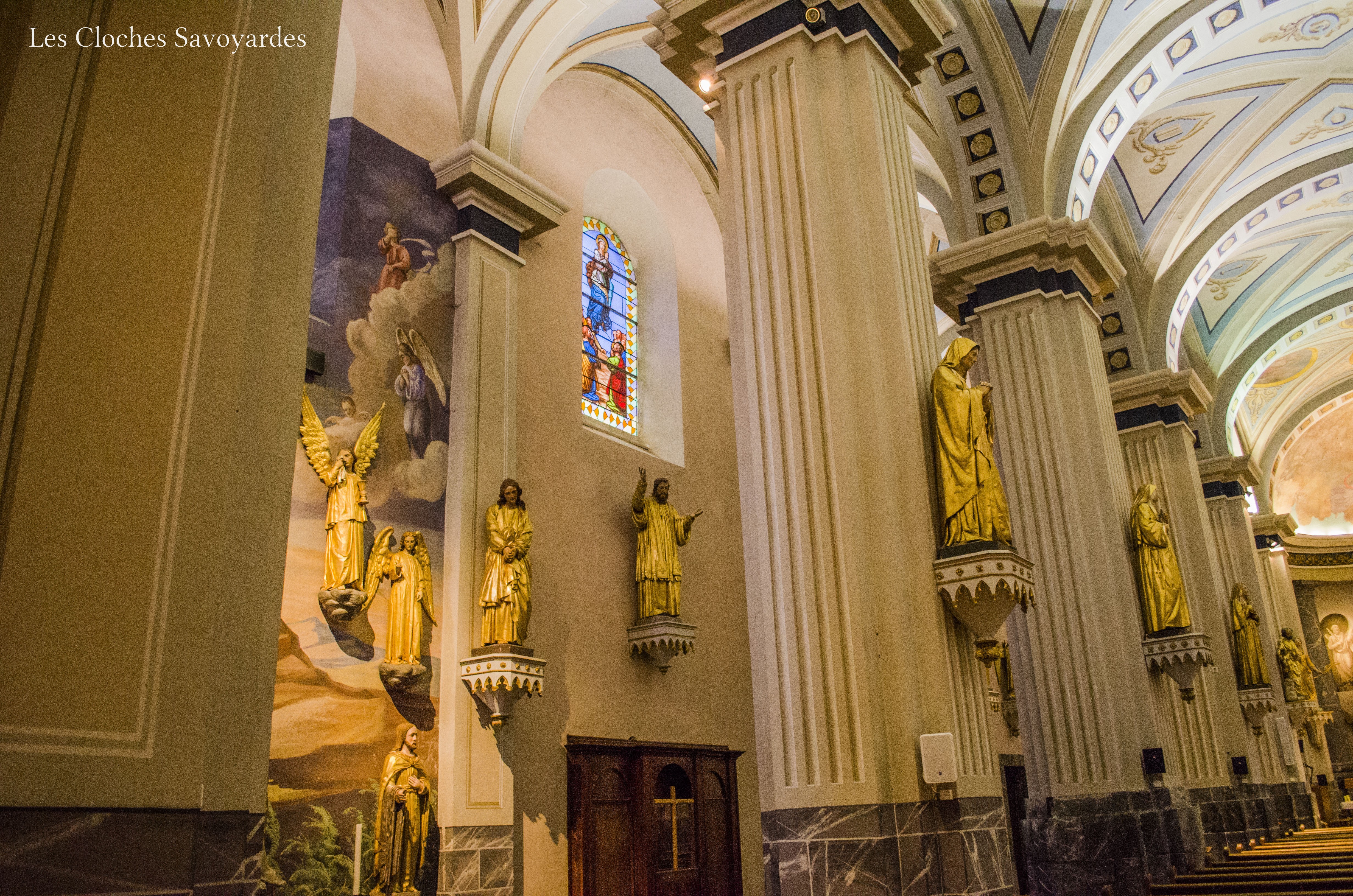 Après les cinq statues susmentionnées, intéressons-nous aux cinq cloches qui chantent quotidiennement au sommet du clocher de Mercury. Et c’est là une véritable affaire de famille qui attend l’amateur d’histoire campanaire. Si -bien entendu- des cloches étaient en place depuis longtemps, la première mention écrite à ce sujet ne remonte qu’à 1767. D’un poids de 1’900 kilos, cette cloche est signée Breton et Bonvie, fondeurs lorrains. Nous savons également par les archives qu’une cloche fut fondue en 1813. Son poids était un petit peu plus modeste : 750 kilos. En 1845, les frères Claude et Jean-Pierre Paccard ajoutent (ou refondent?) deux cloches : une plus grosse et une plus petite que la cloche de 1813. Après la reconstruction du clocher, la cloche de 1813 fut jugée désagréable sur le plan sonore. La famille Dunand, très pieuse, offrit sa refonte qui fut confiée aux frères Beauquis eux aussi établis à Quintal, comme les deux premières générations de la famille Paccard. Cette même fonderie -ouverte en 1854 et tenue par les deux beaux-frères de Jean-Pierre Paccard- allait célébrer là son apogée. Après la réalisation en 1861 du bourdon de l’église Notre-Dame-de-l’Assomption du Grand-Bornand qui pèse -rappelons le- 2’834 kilos, voilà que la paroisse de Mercury, avec l’abbé Marjollet en tête, lui confie la fonte de celui qui deviendra le bourdon de la Combe de Savoie : une cloche de 3’410 kilos, répondant au doux nom d’«Immaculée », faisant suite au dogme de l’Immaculée Conception proclamé 12 ans auparavant par le pape Pie IX.