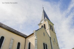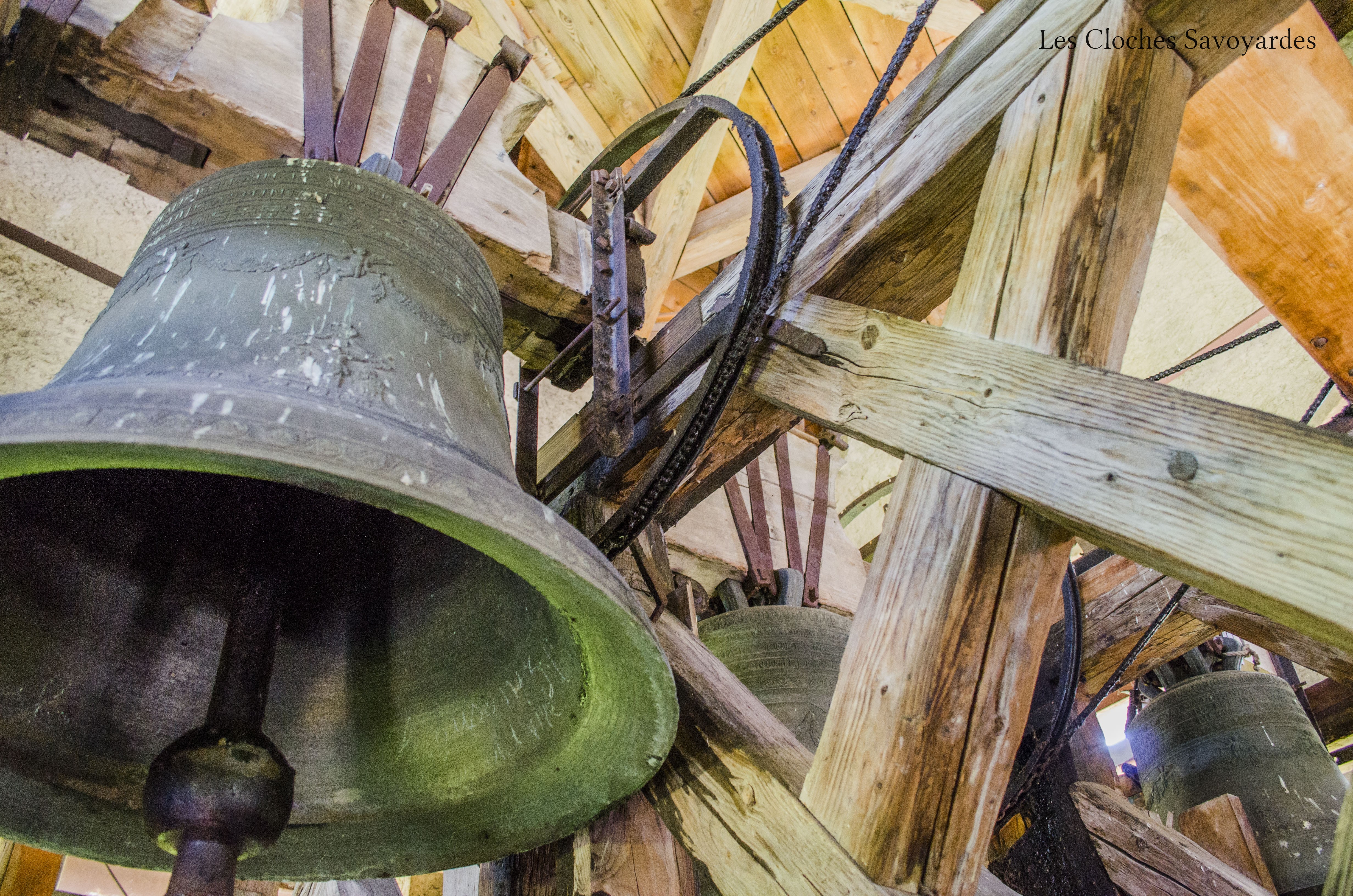 Les trois cloches sont sans doutes l’un des seuls témoins de l’ancienne église. Toutes trois datées de 1820, elles ont en effet connues l’ancien clocher avant d’être installé dans l’actuel, à la fin du XIXe siècle. Elles ont été réalisées par les familles Vallier & Gautier, fondeurs de la Vallée de la Clarée près de Briançon. Ces deux familles de fondeurs très liées au lendemain de la Révolution ont desservi tout l’arc alpin durant près de deux siècles. On retrouve également des cloches de l’une ou l’autre dynastie à Bramois ou Grimisuat en Valais et même en Italie, à la Cathédrale de Susa, près de Turin. Ces trois cloches aux dimensions modestes égrènent un motif dit du « Pater Noster ». Si elles n’arborent pas fièrement de noms de baptêmes, elles ont chacune une vocation : la plus grande « embellit les fêtes », puisqu’elle annonce chaque messe dominicale, qui se font rare de nos jours. La moyenne « pleure les défunts » et invoque « la bonté de notre Dieu ». C’est en effet celle la plus petite « appelle le peuple » puisqu’elle sonne chaque angélus : matin, midi et soir. Elles arborent les noms de leurs parrain et marraine respectif, du syndic Claude Charles et du vice-syndic François Mercier. Électrifiées pour le tintement et la volée en 1953, ces cloches présentent encore la motorisation d’origine, excepté le marteau de tintement de la grande, qui fait face à celui de l’horloge mécanique en place auparavant. Les jougs semblent d’origine, alors que les battant ont été remplacés lors de l’automatisation. Le beffroi, en bois, est probablement refait lors de l’édification de la nouvelle église.