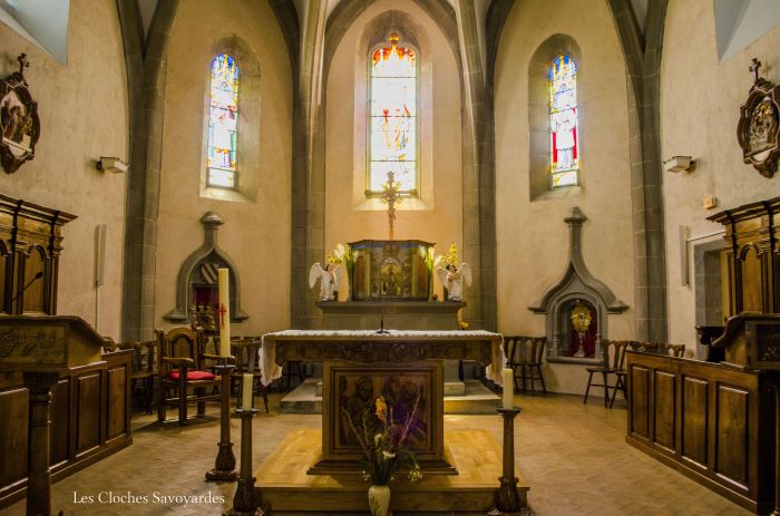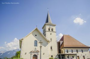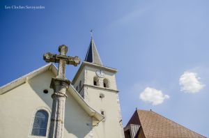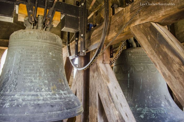 Les cloches, parlons-en. Si nous passons à Arenthon dans la journée, il est possible de les distinguer : les baies ne sont pas munies d’abat-son. En 1806, au lendemain de la Révolution, les clochers doivent être « repeuplés ». Alors les fondeurs s’activent. Jean-Daniel Dreffet et son fils Barthélémy signent alors la petite cloche. Comme les cloches de ce fondeur, elle est plutôt riche sur le plan iconographique. Ainsi, on peut voir frappé sur la cloche un ostensoir, un Christ ou une Vierge. Outre son parrain et sa marraine, elle cite tout le conseil municipal en fonction et le « recteur » (curé) en charge de la paroisse. Cette cloche est depuis peu munie d’un joug en acier et d’un battant neuf. Il y a quelques années encore, elle était pourvue de son mouton d’origine en bois. Sa grande sœur, elle, possède un joug massif en bois, avec des ferrures neuves. Elle a été réalisée en 1843 par les frères Paccard établis à Quintal. Ce « monument de la foi de la commune d’Arenthon » comme le raconte la cloche a été dimensionné pour ce clocher. Lors de la volée, son battant passe à quelques centimètres des murs !