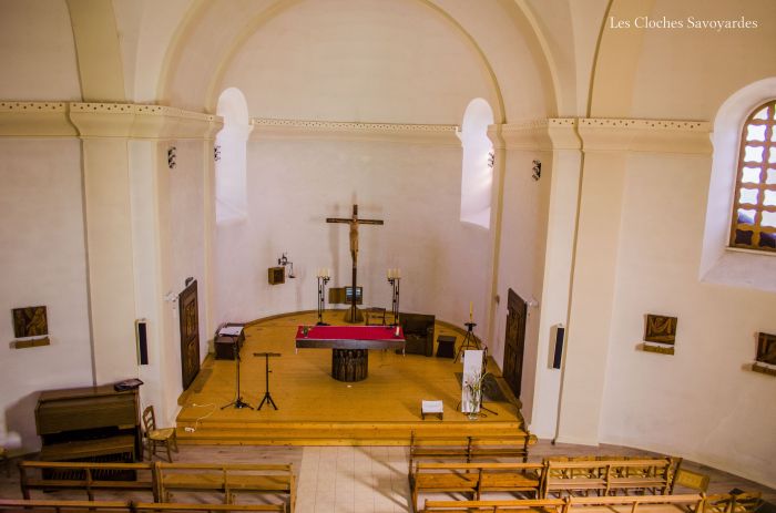 Les cloches actuelles ont été fondues par les frères Paccard, la même année que celles du Villard, et un an avant celles de Boëge, deux clochers voisins. Au début du XXe siècle, leur installation a été revue : un nouveau beffroi semble avoir été conçu et le mode de volée a été modifié pour du rétrolancé. Ce système, breveté fin XIXe siècle par la fonderie, permet moins d’efforts pour les sonneurs et sur le beffroi, malgré un qualité sonore moins optimale. Il y a quelques années, la petite cloche a été tournée d’un quart de tour et son mode de volée a été révisé pour du rétrograde. Le battant n’est plus propulsé contre la lèvre supérieure lors de la volée, mais tombe sur la lèvre inférieure. La grosse cloche a conservé ses équipements du XXe siècle. Elle entre en action moins régulièrement que sa petite sœur, qui l’est 3 fois par jour, pour l’angélus, et lors du glas, sonné sur les deux cloches.