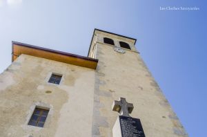 Au cœur du village, une haute silhouette couronnée d’un dôme s’élance : il s’agit de l’église Saint-Ours. Dans ce cas, ce n’est pas le clocher qui domine. D’ailleurs, il est plutôt discret. Nous y reviendrons. L’église, dédiée à saint Ours d’Aoste, a été bâtie entre 1847 et 1848 par Eugène Dénarié d’Annecy. Elle remplace des églises plus anciennes, dont on ne sait pas grand chose, si ce n’est qu’elle est mentionné pour la première fois entre 1078 et 1120, période où la moitié des revenus de la paroisse étaient donnés au prieuré Saint-Victor de Genève.