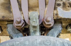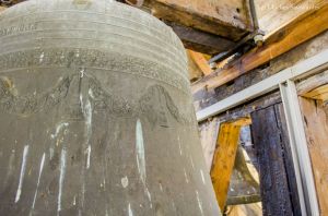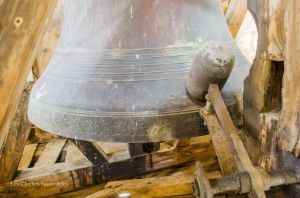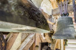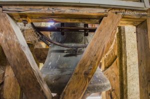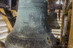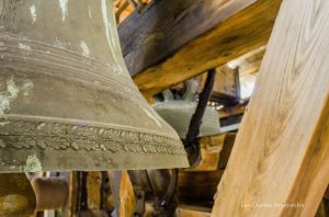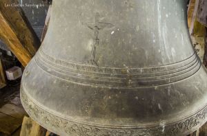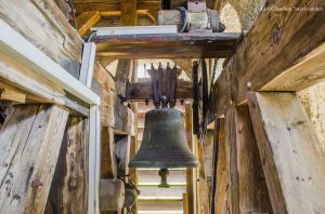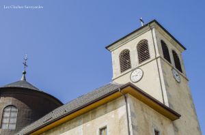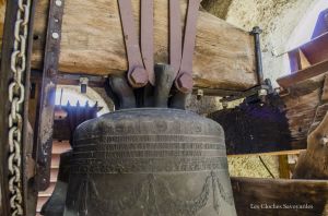Le clocher discret, accolé au cœur de l’édifice, abrite pourtant l’une des plus belles sonneries du chablais. Fondues d’un seul tenant par Georges & Francisque Paccard d’Annecy-le-Vieux, les quatre cloches se partagent un massif beffroi en bois. A en croire le clocher, on ne soupçonnerait pas une telle installation ! Les quatre cloches se répartissent en trois travées. Si la grande cloche se partage seule l’allée centrale, les deux cloches médianes sont face à face, dans une des deux travées latérales. La plus petite cloche, quant à elle, se partage une minuscule travée. Elle n’est pourtant pas au centre, comme si une place était prévue pour une cinquième cloche. On peut aussi admirer avec émerveillement, en plus de cette charpente de bois aux multiples croix de « saint André », que presque tous les équipements d’origines subsistent. On peut ainsi voir sur les trois petites cloches des beaux battants forgés à la main, sauf pour la grande cloche. Il a en effet été changé il y a quelques années. Les jougs en bois disposent encore de leurs ferrures forgées sobrement. Du côté de la motorisation, quelques changements ont été opérés depuis l’électrification en 1951 : on note un nouveau marteau de tintement pour la grande cloche, et de nouveaux moteurs de volée pour les cloches 2 & 3. Ils ont certainement été installés il y a environ une décennie, à la même période que l’automate, installé en 2008. Sous la deuxième cloche, se trouve un instrument de bois : il s’agit très simplement d’une crécelle, utilisée entre les Gloria des Jeudi-Saint et de la Vigile Pascale, en lieu et place des cloches, muettes en signe de deuil, ou à Rome, selon la tradition.
