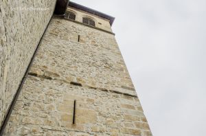 Le clocher, parlons-en, est plutôt trapu. Accroché au chœur de l’église, il ose à peine se démarquer de la toiture de la nef. Ses pierres laissent apparaître des vestiges de l’ancienne église. Sa porte arbore une inscription gothique, témoin clé de son âge ancien. La flèche, rasée à la Révolution, n’a jamais été reconstruite. D’ailleurs, il ne semble jamais avoir été surélevé : le dernier étage donne directement dans les combles de l’actuel sanctuaire, reconstruit au XIXe siècle.