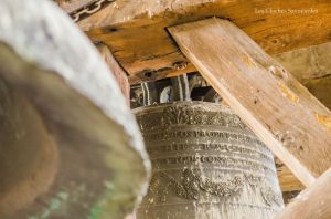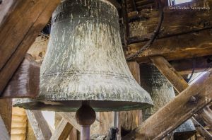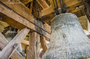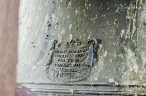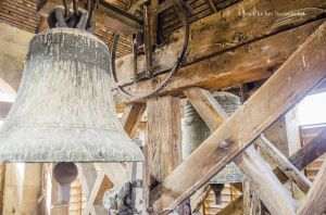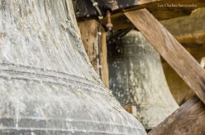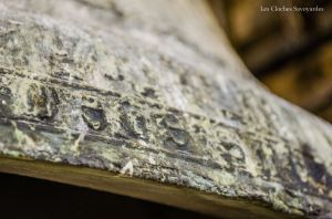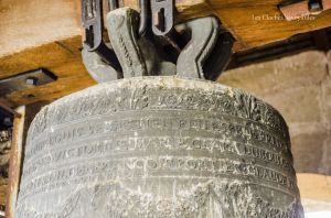 Le clocher abrite ici, comme chaque église « ordinaire », deux cloches. S’il convient en général de commencer par la plus grosse cloche, je tiens à présenter, âge oblige, la plus petite. Cette cloche, aux icônes mariaux, porte la date de 1456 et la mention de « Maître Clément Fribor de Genève m’a faite ». Si de cette période, ou l’on commence à faire des cloches signées et datées, on connait aisément Jean & Guillaume Fribor, natifs de la Tarentaise, il semble que Clément soit aussi de cette famille. Ils ont en effet tous le point commun d’avoir comme patronyme « Mercier ». Ce nom de famille est encore présent aujourd’hui. Sans doute un « pseudonyme » pour être plus facilement « accepté » à cette époque. Si cette signature est la seule mentionnée dans nos bases de données, l’œil averti du Dr Matthias Walter, campanologue à Berne, indique volontiers des similitudes dans la décoration avec -entre autres- la cloche numéro 3 de Lutry, fondue dans la première moitié du XVe siècle et de facture inconnue. Cette cloche possède un titre : c’est la plus ancienne cloche datée du département de la Haute-Savoie. La mention de date ici prend tout son sens car il existe une poignée de cloches du XVe siècle qui ne portent aucune date mais qui sont estimées à ce même siècle.