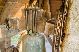 Le clocher mur est très spécial. Son architecture est déjà à souligner parce que rare dans notre région. Les deux baies n’abritent en réalité aucune cloche, même si les yeux les plus fins voient dans la maçonnerie des trous rectangulaires, comme si prêts à abriter des suspensions pour deux cloches, une par baie. L’interrogation demeure sur le passé campanaire. Aucun indice peut nous susurrer à l’oreille une date du clocher, et s’il a bien connu dans ses fenêtres une ou deux cloches pré-révolutionnaires, ou s’il était prévu pour en recevoir. Quoi qu’il en soit, sa seule cloche actuelle est installée à l’arrière de celui-ci. Et elle ne loge pas dans les baies. Un petit toit a même été construit pour l’abriter. Prenant le nom de « Péronne » par sa marraine, cette cloche était autrefois actionnée à la corde matin, midi et soir, et au gré des offices, par un sonneur. Aujourd’hui électrifiée, elle est utilisée uniquement chaque midi, pour rappeler la présence de cette chapelle. Son accès est périlleux. Il faut en effet rejoindre les combles du sanctuaire avant d’emprunter un velux qui nous permet de la rejoindre. Mais le toit, trop raide, n’offre pas de bons appuis : il faut aller se loger dans une des deux baies du clocher.