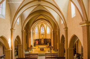 Revenons au clocher, que nous allons gravir. Il abrite aujourd’hui deux cloches, entourées de murs épais. Ses meurtrières entre ciel et terres peuvent surprendre. En effet, le clocher aurait été jadis une tour défensive avant de prendre sa vocation actuelle. Sa porte d’accès, en tribune, demeure très « médiévale » : il faut bien se baisser pour la franchir ! Des escaliers nous emmènent ensuite au sommet. Au dernier étage, avec les cloches, la cabane de l’horloge est vide. Le mouvement a été installé en 1840 et remplacé à électrification par un système moderne. Le beffroi, qui semble âgé, soutient avec vigueur les deux cloches. Ce nombre ne semble avoir guère évolué durant l’histoire de cette charpente, marquée des chiffres romains pour faciliter son assemblage. A la Révolution, la petite cloche est descendue pour être cassée. Elle sera finalement laissée intacte. La grande cloche, elle n’a pas bougé pour sonner les rassemblements civils. En 1811, une nouvelle petite cloche est bénie. On ne sait pas ce qu’il est advenu des anciennes cloches. En 1844, la petite cloche est refondue et augmentée à environ 800 kilos. Il en sera de même en 1869 pour la grosse cloche : fêlée, elle sera portée à 1800 kilos, devenant ainsi une des plus grosses cloches du Chablais français. Révisée au début du XXe siècle, son installation a également été revue il y a quelques années. Il en fut de même pour la petite cloche.
