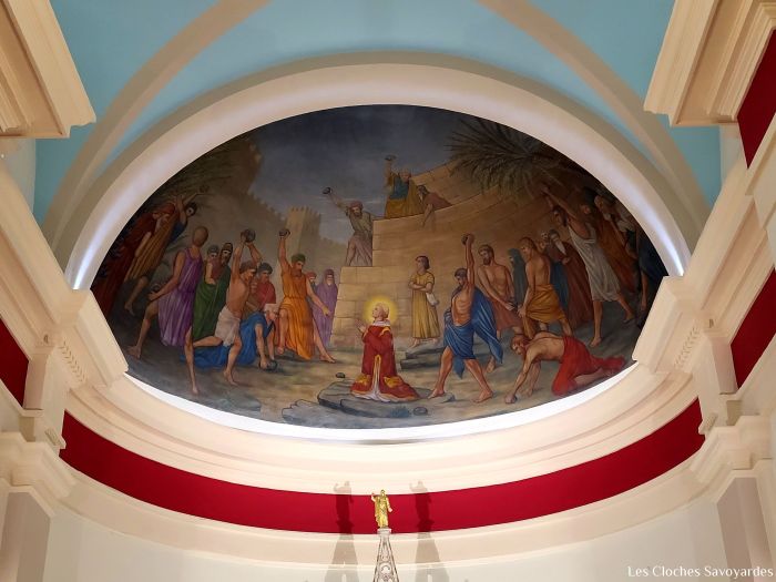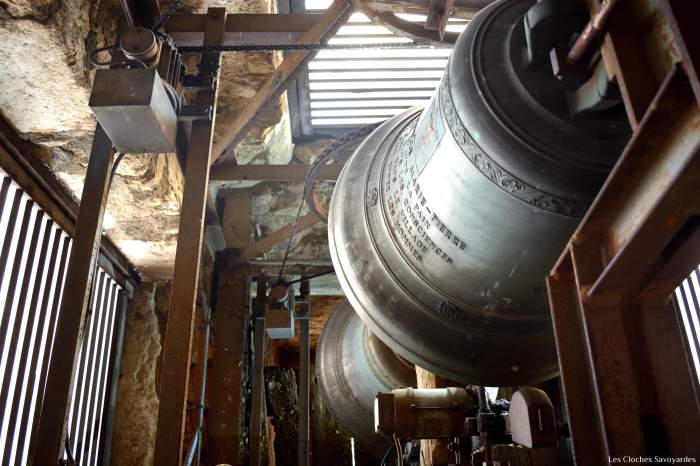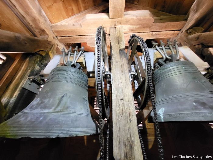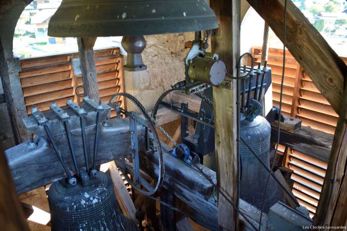 En 1870, la cloche de 1767 étant fendue et la Pitton de 1802 se retrouvant bien seule, la commune prit l’initiative de refondre et d’ajouter une troisième cloche, afin de redonner au clocher sa pleine voix prérévolutionnaire. Ainsi, Marie et Étiennette vinrent rejoindre la grande cloche placée sous la protection de saint Étienne. Mais cette compagnie ne dura que quelques années : la cloche Pitton finit par se fendre à son tour. Une nouvelle cloche de 1 508 kilos fut bénie le 30 octobre 1904, nommée Georgine Alexandrine par son parrain Georges Dufournet et sa marraine Alexandrine Tessier. De nombreux prêtres natifs de la commune, ainsi que le curé et quelques laïcs, contribuèrent à sa fonte. La cloche implore encore saint Étienne de « protéger [son] peuple ». Cette même grosse cloche, jadis en rétrolancé, a été transformée il y a quelques décennies en rétromitigé. Elle a également perdu son majestueux joug en fonte typique de la maison Paccard, remplacé par un joug arqué métallique. Les deux petites cloches ont quant à elles conservé leurs équipements d’origine, quoique renforcés de nouvelles ferrures. La plus petite, accrochée bien en hauteur, ne donne malheureusement que rarement de la voix, notamment lors de rares carillons. Électrifiée, elle laisse toutefois aux deux grandes cloches le soin de sonner angélus, messes et enterrements.