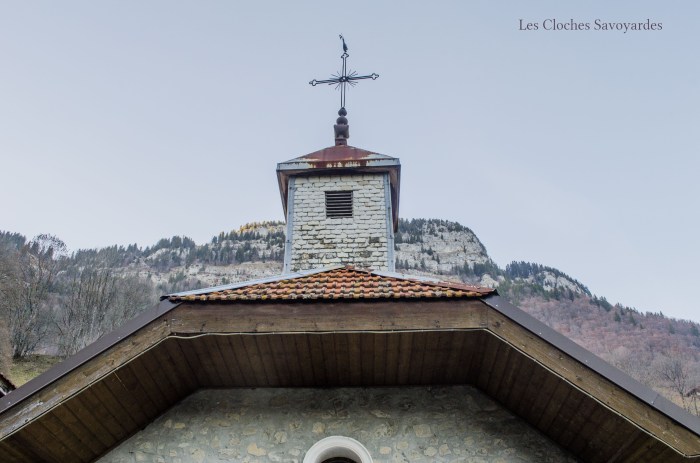 Le petit clocheton permet aujourd’hui de voir sa cloche car il est dénudé de tout abats-son depuis quelques années. Celle ci a été fondue en 1828 par Louis Gautier, fondeur de Briançon maintes fois présenté ici. Elle possède encore tous ses équipements d’origine et elle est actionnée encore aujourd’hui à la corde depuis là chapelle. Elle pèse environ 100 kilos pour 60,4cm de diamètre. Elle porte le doux nom de « Marie Josèphe Geneviève » et tinte un « Mi aigu » (Mi4). Elle a été financée aux dépends des habitants du lieu-dit, parrainée par le Rd Chernier, curé des Houches et Geneviève Choupin. Elle cite également MM. Michel Garny et Nicolas Simond comme procureurs de la chapelle, probablement les gardiens.