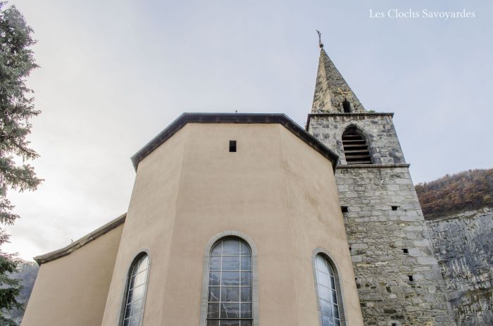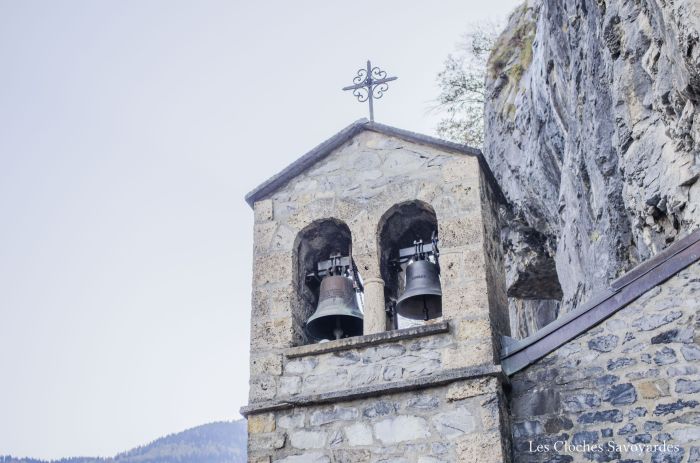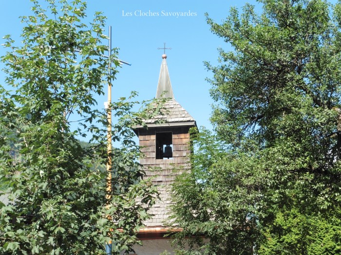 Les trois cloches sont sans doutes l’un des seuls témoins de l’ancienne église. Toutes trois datées de 1820, elles ont en effet connues l’ancien clocher avant d’être installé dans l’actuel, à la fin du XIXe siècle. Elles ont été réalisées par les familles Vallier & Gautier, fondeurs de la Vallée de la Clarée près de Briançon. Ces deux familles de fondeurs très liées au lendemain de la Révolution ont desservi tout l’arc alpin durant près de deux siècles. On retrouve également des cloches de l’une ou l’autre dynastie à Bramois ou Grimisuat en Valais et même en Italie, à la Cathédrale de Susa, près de Turin. Ces trois cloches aux dimensions modestes égrènent un motif dit du « Pater Noster ». Si elles n’arborent pas fièrement de noms de baptêmes, elles ont chacune une vocation : la plus grande « embellit les fêtes », puisqu’elle annonce chaque messe dominicale, qui se font rare de nos jours. La moyenne « pleure les défunts » et invoque « la bonté de notre Dieu ». C’est en effet celle la plus petite « appelle le peuple » puisqu’elle sonne chaque angélus : matin, midi et soir. Elles arborent les noms de leurs parrain et marraine respectif, du syndic Claude Charles et du vice-syndic François Mercier. Électrifiées pour le tintement et la volée en 1953, ces cloches présentent encore la motorisation d’origine, excepté le marteau de tintement de la grande, qui fait face à celui de l’horloge mécanique en place auparavant. Les jougs semblent d’origine, alors que les battant ont été remplacés lors de l’automatisation. Le beffroi, en bois, est probablement refait lors de l’édification de la nouvelle église.