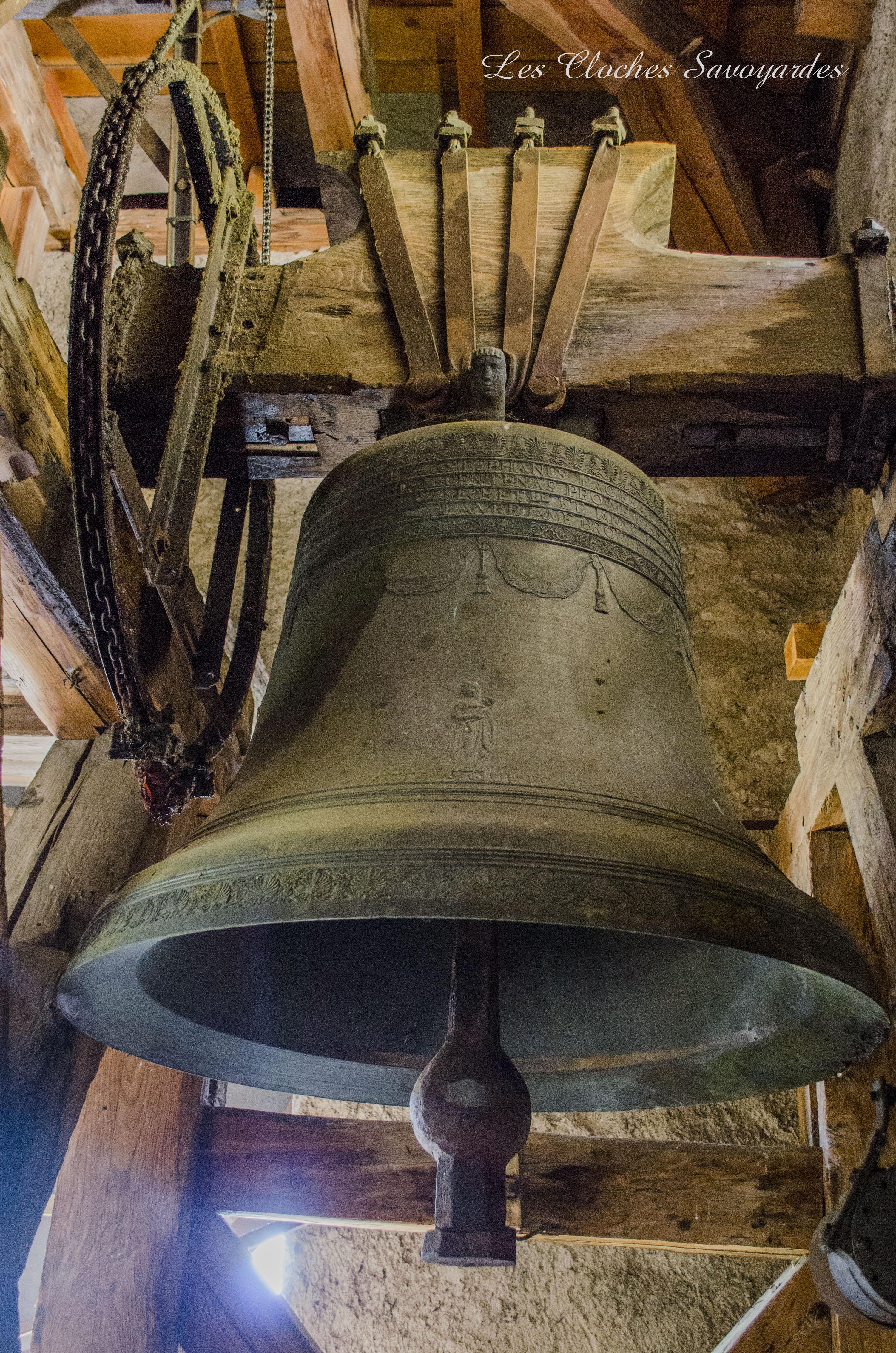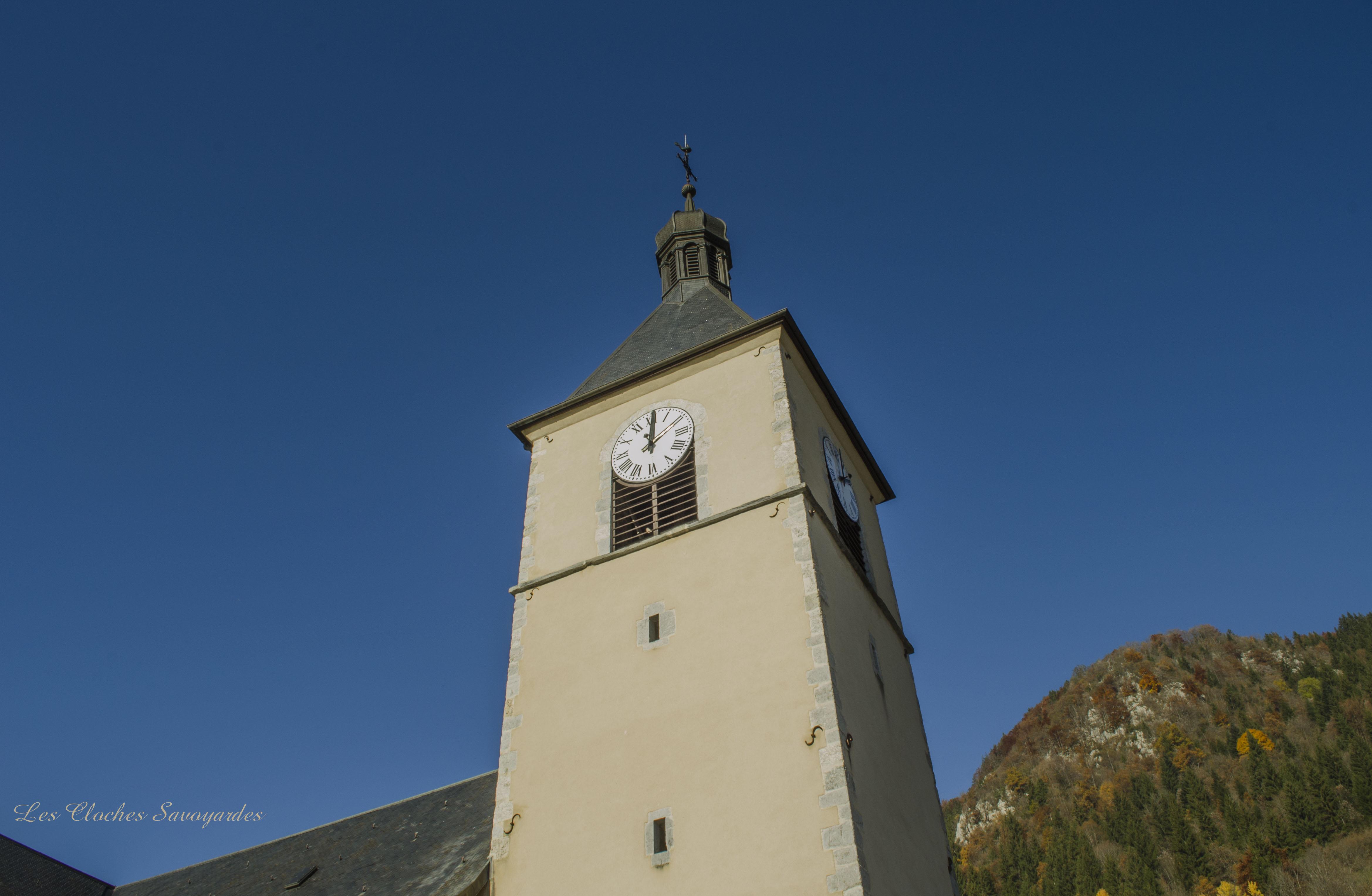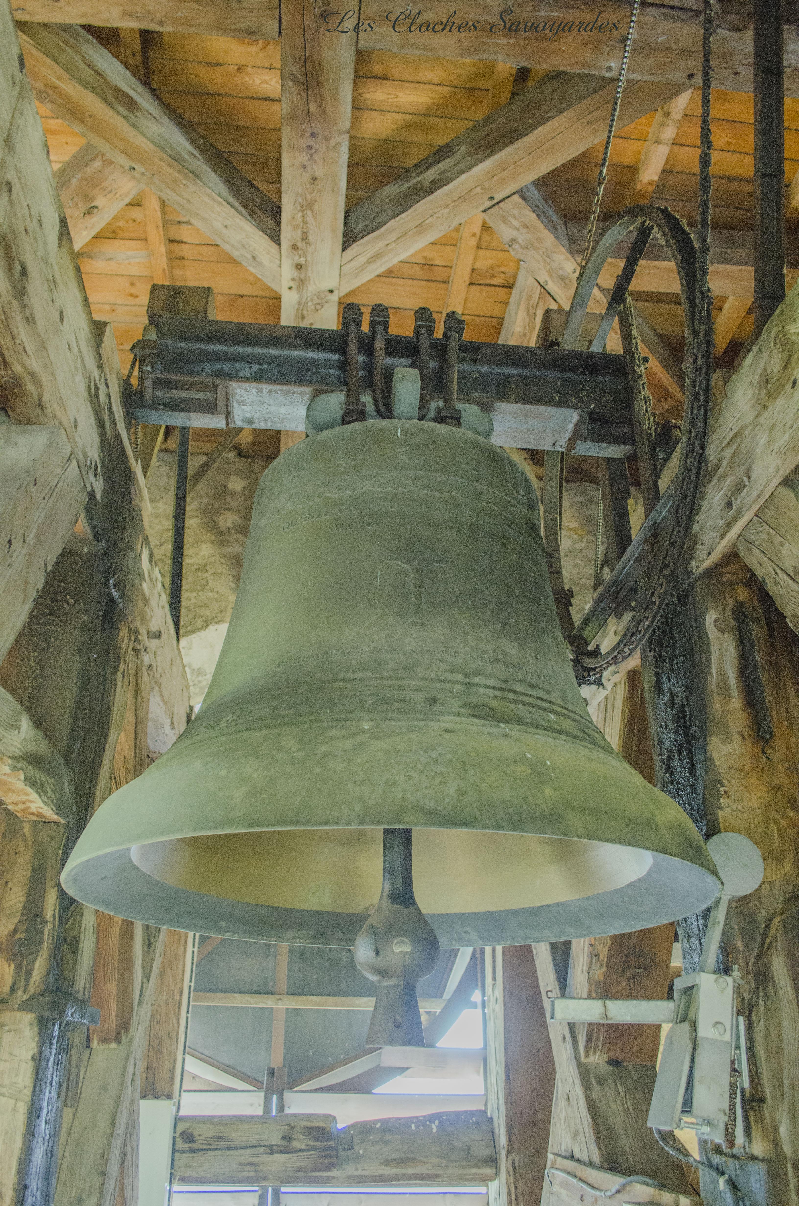 Les plus anciennes archives que nous possédons font état de quatre cloches en place dans le clocher de l’église sous l’Ancien Régime. En 1793 trois d’entre elles, les plus petites, prirent le chemin de Chambéry pour être cassées et fondues. Elles pesaient au total 830 kilos. La plus grande (880 kilos) était restée au clocher pour donner de la voix pour le tocsin ou autre événement civil. Dérobée en avril 1794 puis retrouvée quelques jours après, elle sera contrainte de subir le même sort que ses petites sœurs. En 1802, soit peu de temps après que le Concordat soit signé, une cloche pesant environ une tonne est fondue par un Carougeois et son fils : Jean-Baptiste Pitton. Ce n’est pas la première fois que nous relatons le savoir-faire de ce fondeur né en Isère. Cette cloche sans nom, installée en rétrograde, est accompagnée de trois autres cloches. La plus grande d’entre elles – la deuxième – porte la date de 1860 et la griffe des frères Paccard, fondeurs à Annecy-le-Vieux, en Haute-Savoie. Cette cloche en remplace une autre d’un seul quintal. Son acquisition reste une zone d’ombre. Deux petites cloches permettent au quadrillon de s’exprimer pleinement. Nommées respectivement « Françoise-Marguerite du Sacré-Coeur » et « Marie-Jeanne-Angéline-Philomène », elles ont été fondues toujours par la célèbre fonderie savoyarde Paccard en 1891. Leurs dédicaces rendent hommage à leur parrains et marraines respectifs, et citent le curé qui les « donne à la fabrique ». On trouve enfin l’inscription « L’année de fonte de la Savoyarde 1891 » ! En effet, c’est cette même année qu’est fondue la célèbre Savoyarde sur l’initiative de l’archevêque de Chambéry. Depuis l’installation des nouvelles cloches en juillet 1892, ce carillon entonne joyeusement un « accord majeur » en « mi » audible lors des funérailles.