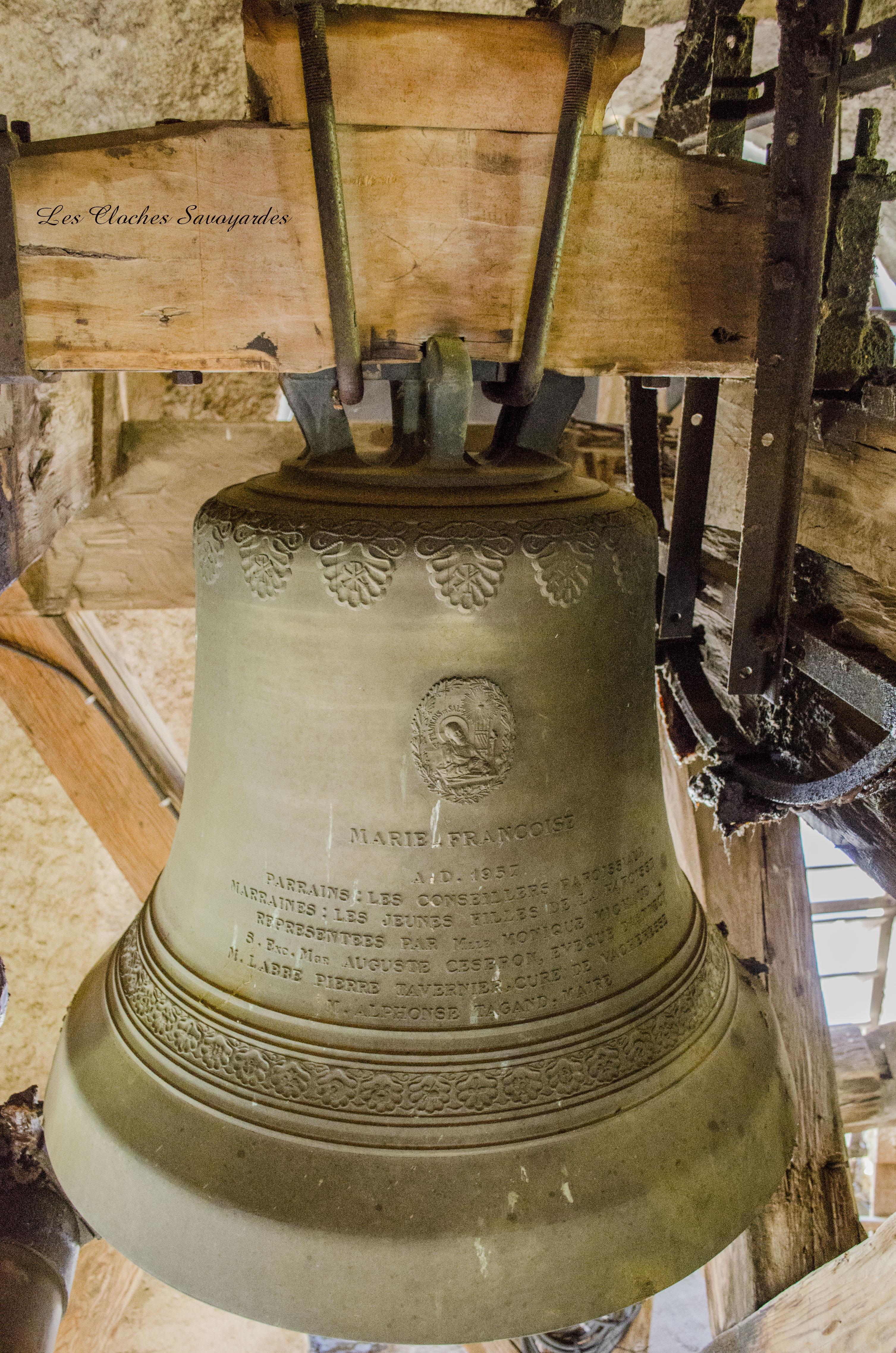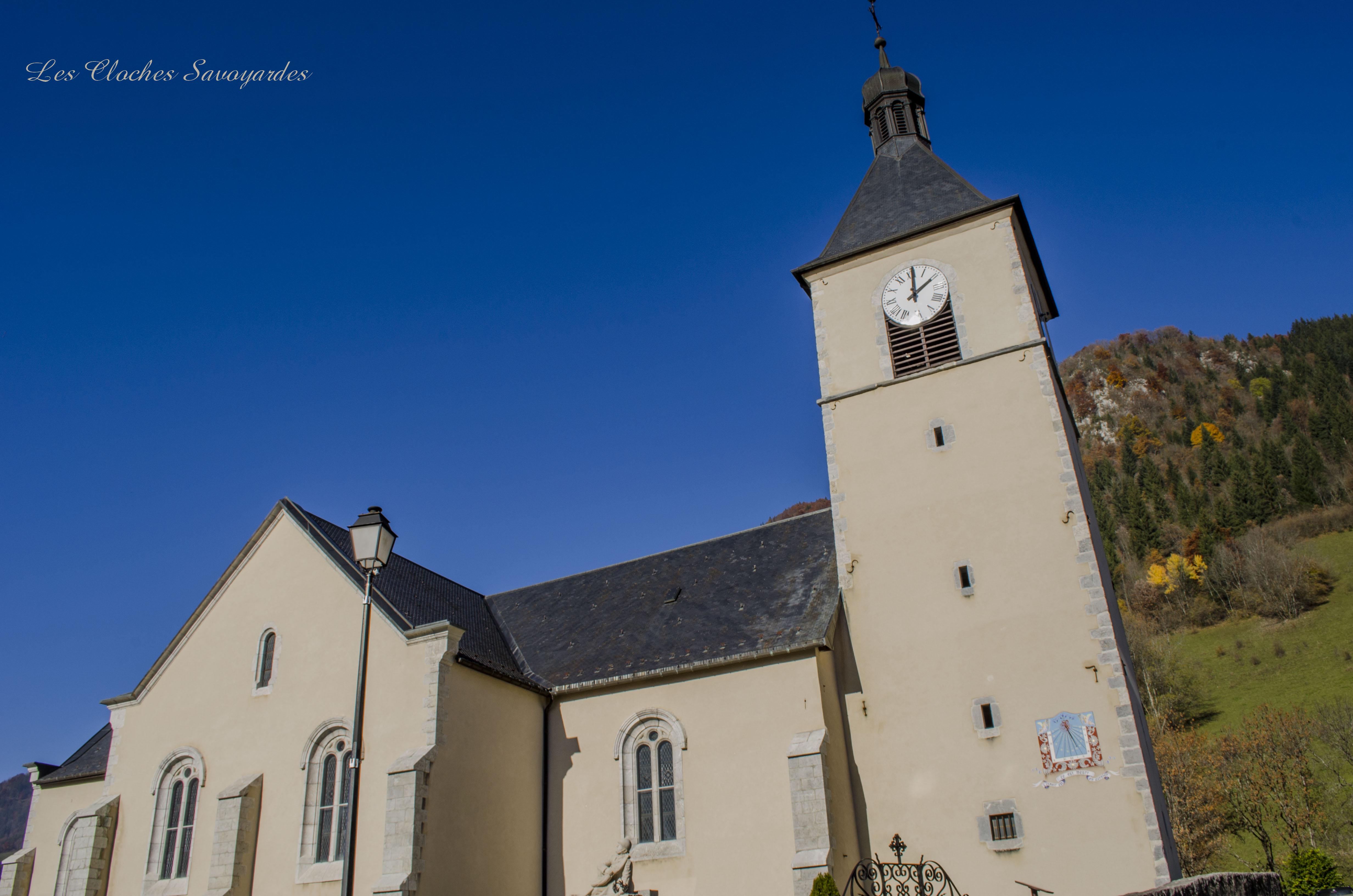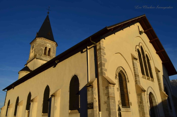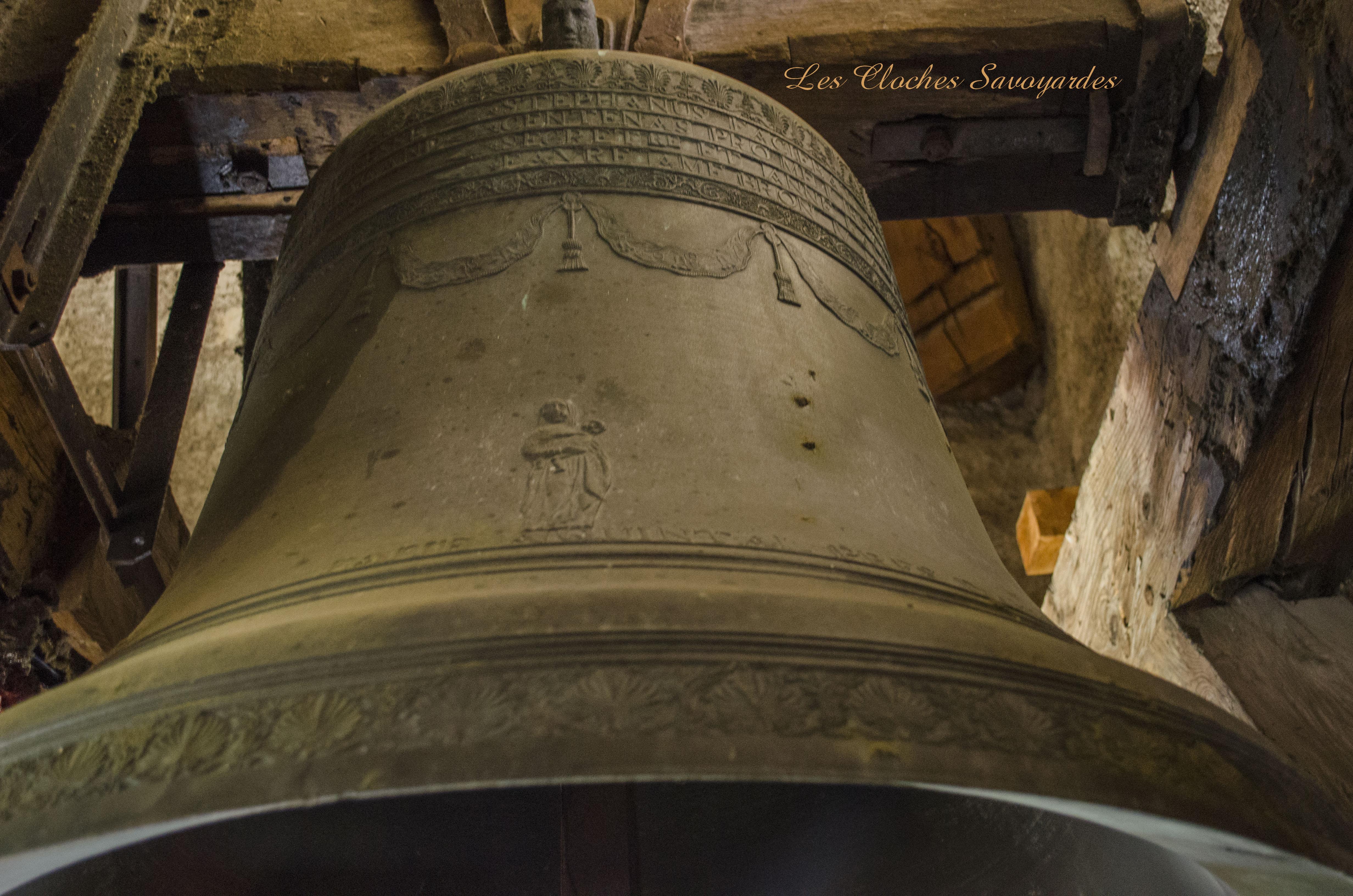 Les plus anciennes archives que nous possédons font état de quatre cloches en place dans le clocher de l’église sous l’Ancien Régime. En 1793 trois d’entre elles, les plus petites, prirent le chemin de Chambéry pour être cassées et fondues. Elles pesaient au total 830 kilos. La plus grande (880 kilos) était restée au clocher pour donner de la voix pour le tocsin ou autre événement civil. Dérobée en avril 1794 puis retrouvée quelques jours après, elle sera contrainte de subir le même sort que ses petites sœurs. En 1802, soit peu de temps après que le Concordat soit signé, une cloche pesant environ une tonne est fondue par un Carougeois et son fils : Jean-Baptiste Pitton. Ce n’est pas la première fois que nous relatons le savoir-faire de ce fondeur né en Isère. Cette cloche sans nom, installée en rétrograde, est accompagnée de trois autres cloches. La plus grande d’entre elles – la deuxième – porte la date de 1860 et la griffe des frères Paccard, fondeurs à Annecy-le-Vieux, en Haute-Savoie. Cette cloche en remplace une autre d’un seul quintal. Son acquisition reste une zone d’ombre. Deux petites cloches permettent au quadrillon de s’exprimer pleinement. Nommées respectivement « Françoise-Marguerite du Sacré-Coeur » et « Marie-Jeanne-Angéline-Philomène », elles ont été fondues toujours par la célèbre fonderie savoyarde Paccard en 1891. Leurs dédicaces rendent hommage à leur parrains et marraines respectifs, et citent le curé qui les « donne à la fabrique ». On trouve enfin l’inscription « L’année de fonte de la Savoyarde 1891 » ! En effet, c’est cette même année qu’est fondue la célèbre Savoyarde sur l’initiative de l’archevêque de Chambéry. Depuis l’installation des nouvelles cloches en juillet 1892, ce carillon entonne joyeusement un « accord majeur » en « mi » audible lors des funérailles.