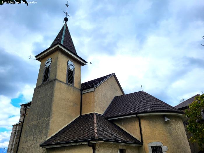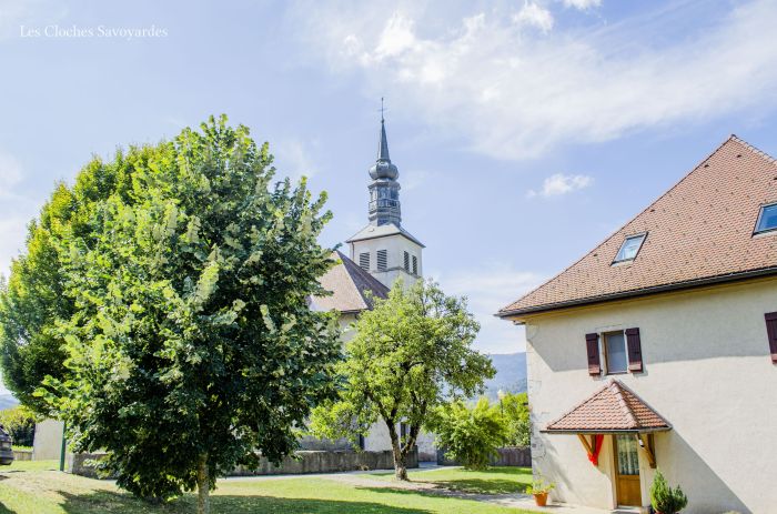 La plus grande cloche est également la doyenne. Elle a été parrainée par le comte Ange Etienne Alexy de la Fléchère. Sa marraine était « Madame Veuve J.C. Enriette de Chaillou Comtesse de Montailleur ». Cette cloche possède comme unique décor une Vierge à l’Enfant et une croix. Elle cite également le recteur (curé) François Marie Nachon et le syndic (maire) Joseph Marie Dumont. La cloche numéro deux remonte à 1808. Une petite cloche estimée à trois quintaux et demi occupait déjà le clocher. Elle était parrainée par Georgine et Alexis de la Fléchère. En 1889 elle est augmentée de moitié par Marie et Charles de la Fléchère. Elle est dédiée à Saint Georges de par sa première marraine, comme en témoigne une effigie du saint patron de la paroisse, en complément d’un Christ. La troisième cloche, celle qui sonne les angélus quotidiens, est dédiée à Saint François de Sales, patron du diocèse. Elle a été offerte par Louise et François de la Fléchère. La plus petite est vouée à Sainte Anne. Elle a été financée par Anne et Henry de la Fléchère. Une effigie sur la cloche le rappelle.