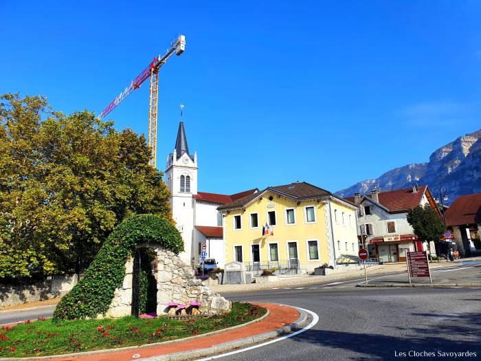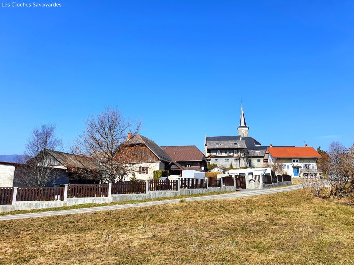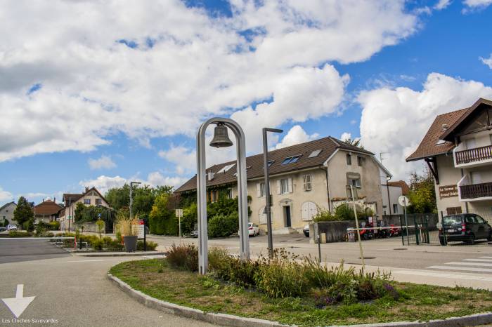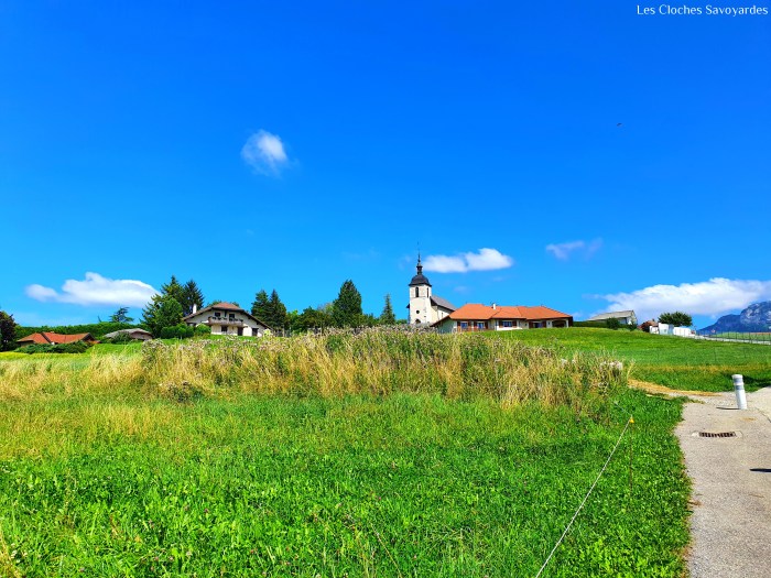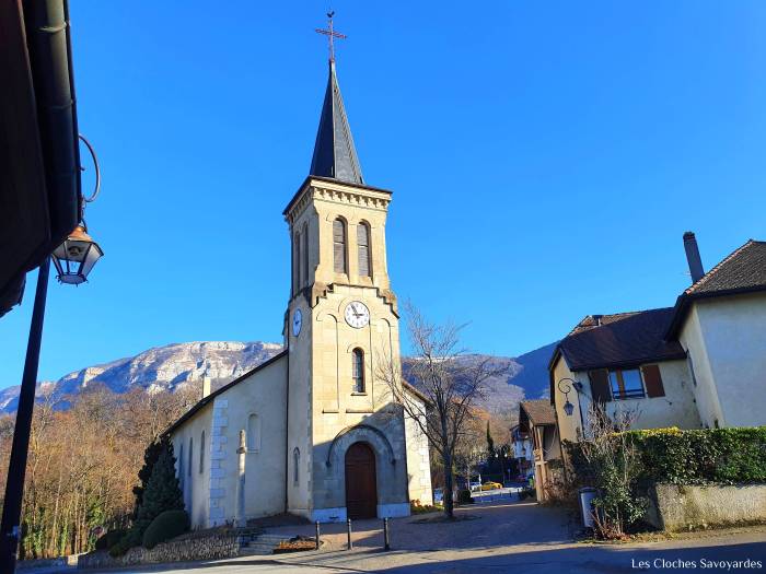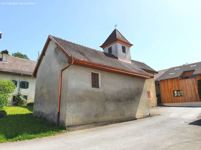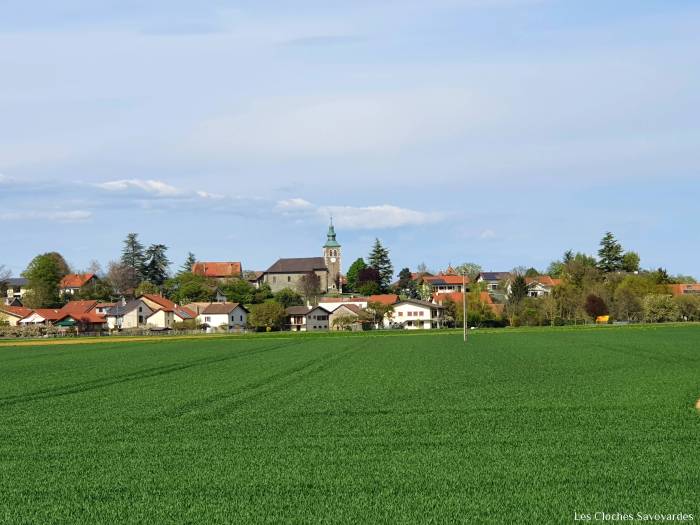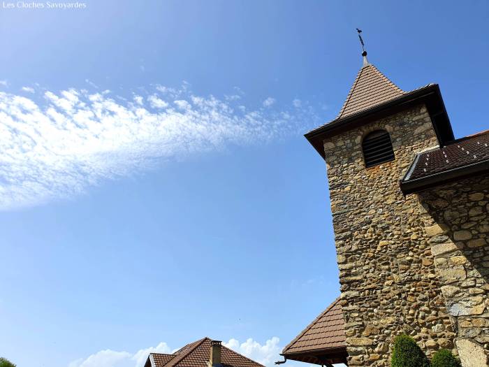 La belle flèche du clocher dissimule en son sein, trois cloches. « Barbara » est la plus ancienne. Elle porte la date de 1582. A ce moment-là, le village était en pleine reconstruction. On accorde à cette cloche le don d’éloigner les orages et sonne, encore aujourd’hui, à l’approche de nuages menaçants pour les détourner de la commune. D’autres disent qu’on la sonne pour préserver les récoltes. On raconte aussi que lors de la fonte de la cloche, la baronne du Turchet est venue avec son tablier rempli d’argent pour lui donner un son argentin et pur. La cloche a également été dédiée à sainte Barbe et porte l’inscription « la parole de Dieu demeure pour l’Eternité […] Dieu nous te louons » et les noms de Pingod et Bochet. Cette cloche, l’une des plus anciennes du département, est classée Monument Historique depuis 1943. Lors de la Révolution, elle a été enterrée dans un champ car les villageois ne voulaient pas qu’elle soit saisie pour être fondue. Sans doute qu’une autre cloche qui lui tenait compagnie a été envoyé à sa place car en 1796, Jean Sublet récupère à Bonneville une cloche d’occasion pour le clocher. Il est toutefois curieux qu’un villageois d’une commune du Genevois se rende à Bonneville, chef-lieu du Faucigny, une autre province savoyarde, pour récupérer une cloche alors que les communes alentours avaient déposés -puis récupérés- des cloches à Annecy, chef-lieu du Genevois. Mais en 1833 déjà, la cloche récupérée à Bonneville se fêle. Les autorités considèrent qu’ils est donc urgent de la remplacer mais aussi de l’augmenter car la « Barbara » ne suffit pas aux besoins de la paroisse. Le 7 septembre 1834, la commune passe donc une convention avec Claude Paccard pour refondre et augmenter la cloche cassée. Mais très vite, cette nouvelle cloche se trouve être au centre d’une importante discorde : MM. André Falconnet, conseiller municipal, et Maurice Sublet ont critiqués son arrivée, indiquant qu’elle n’est pas de qualité, qu’elle mettrait en péril le clocher et que le conseil pillent les modestes ressources de la commune. Les élus ont donc écrit à l’Intendant du Genevois (équivalent actuel du préfet) pour lui expliquer les faits, suppliant sa médiation. On apprend en fait que ces messieurs étaient les plus éloignés du clocher et voulaient, tout simplement, une cloche encore plus grosse pour l’entendre, mais sans sortir le moins centime de leur poche ! Presque deux siècles plus tard, on se rend compte que la cloche n’a pas été reprise : elle sonne même les angélus matin, midi et soir ! Enfin, en 1899, les frères François et Félix Bouchet offrent une troisième cloche pour équiper le nouveau clocher, en mémoire de leurs parents. Nommée « Françoise Félicienne Julie », elle pèse 834 kilos et marque, aujourd’hui encore, les heures. Outre les noms des élus et du conseil de fabrique, elle indique en latin qu’elle loue Dieu, convoque les fidèles, rassemble le clergé, embellit les fêtes et pleure les morts. Pour l’occasion, on installe sur la tour des cadrans d’horloge pilotés par un mouvement signé Mayet, horloger à Grenoble. Il est encore en place aujourd’hui, dans son jus, mais mis à la retraite car les cloches ont été par la suite électrifiées et des marteaux électriques marquent désormais le temps qui passe.