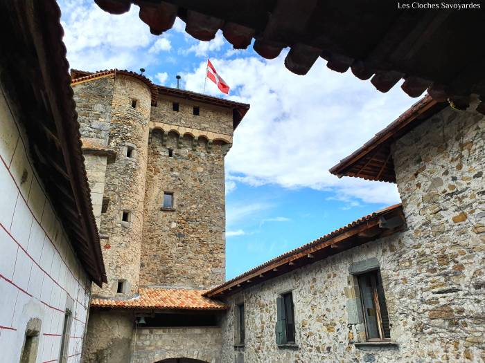 Au sommet du donjon, qui sert aussi de clocher à l’ensemble, se trouvent huit cloches d’un poids total d’environ 440 kilos. Fondues en 1999 par la fonderie Paccard, elles permettent de rythmer le quotidien des lieux et de ponctuer les évènements qui s’y déroulent. Il a été installé et financé par Jean et Yvonne Guyon pour leur 55 ans de mariage, cinq ans après un premier don campanaire pour l’église Saint-Symphorien d’Excenevex. Sur leur flancs sont gravés de multiples prénoms et noms : il s’agit de la descendance des Guyon et des hommages à des personnes qui leur étaient chères. Muet assez rapidement après son installation, il a été remis en fonction il y a quelques mois. Ce travail a pu être réalisé avec le concours et l’aide d’un électricien, Laurent Nicolet, et des Chevaliers d’Avalon de Genève. Pour la petite anecdote, les genevois ont souhaité détruire le château d’Avully en 1603, en réponse à l’Escalade qui eut lieu à Genève quelques mois plus tôt. Mais les habitants d’Avully s’y sont opposés, protégeant le château en dépit de leurs biens personnels, souvent confisqués par l’ennemi. C’est aujourd’hui en toute amitié qu’ils viennent chaque année depuis 2013, -leur président Laurent Farinelli en tête- pour aider les propriétaires de multiples manières : soutien financier, conseils, logistique ou encore entretien divers et variés. Une belle manière d’enterrer la hache de guerre et de préserver un patrimoine séculaire !