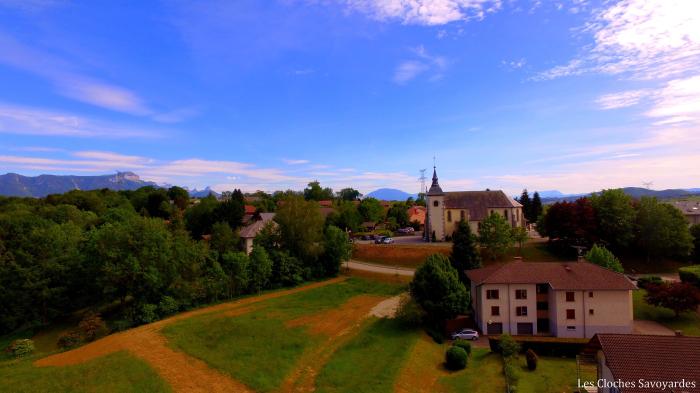 Le clocher, installé près du chœur, est surmonté d’une timide flèche, qui remplace depuis 1952 un toit demi-bulbe. Au dernier niveau, un beffroi en bois permet à quatre cloches de sonner : elles sont disposées chacune dans une fenêtre de la tour. Côté nord, une cloche va retenir notre attention : elle porte sur son flanc la date suivante : M V LX. Il faut très certainement comprendre 1560, eu égards aux caractères gothiques. Elle semble avoir survécu à l’occupation de la Maurienne qui eut lieu quelques années après. Quoi qu’il arrive, elle a certainement été fondue pour cette paroisse : elle est vouée à saint Etienne, patron, tout en portant les effigies de saint Antoine (aussi présent dans l’église), saint Jean-Baptiste, les saints Pierre et Paul, sans oublier la Vierge et le Christ. Elle porte aussi une inscription « Salvaterre », comme beaucoup de cloches de la même époque. Ses trois sœurs sont plus récentes et leur fonte s’étale sur presque deux siècles : en 1805, les Gautier et Vallier, originaire de Briançon, réalisent la petite cloche dédiée à saint Joseph. Peut-être qu’au lendemain de la Révolution, ce n’était pas la seule venue aux côtés de la cloche historique. En 1872, les frères Paccard confectionnent la plus grosse cloche, caractérisés par ses décors soignés. Elle est vouée à la Vierge Immaculée, saint Etienne et saint Joseph. Enfin, en 1988, la fonderie Paccard réalise la cloche numéro deux, également dédiée à saint Etienne. Il est presque évident qu’elle en remplace une plus ancienne, en témoignent l’ancienneté du beffroi et les traces d’anciens paliers dans sa travée. Les oreilles les plus sensibles pourront peut-être s’étonner de la ligne nominale atypique : on remarque volontiers que la cloche historique hésite entre le do dièse et le ré, hésitation amplifiée par ses harmoniques caractéristiques des anciennes cloches. Il convient aussi de préciser que l’ajout de nouvelles cloches au compte goutte n’a pas arrangé la situation.