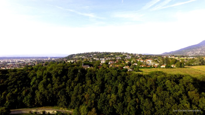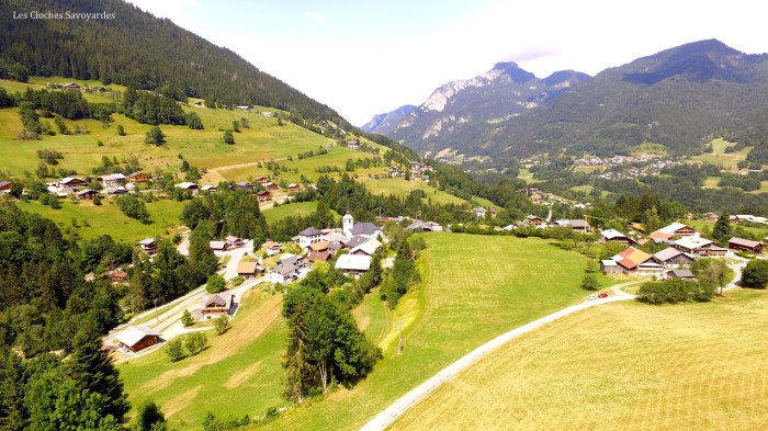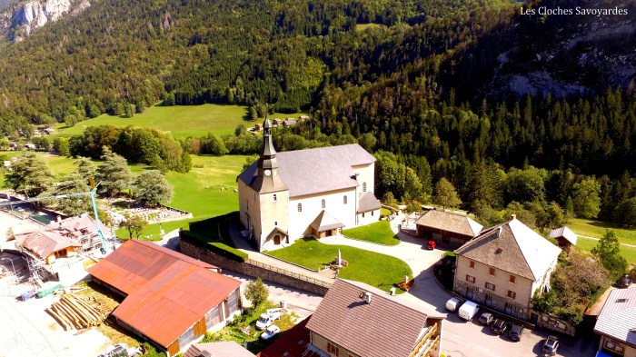 Le clocher, haut de vingt-mètres, reprend des caractéristiques des tours romanes. Ses différents étages sont élégamment décorés d’arcades. Au dernier, ses lourds murs de pierres laissent apparaître quatre cloches : une dans chaque baie. Elles sont soutenues par un beffroi en bois, lui-même doublé par une structure métallique. Ces quatre cloches sont l’oeuvre de la fonderie Paccard. On peut parler là d’une véritable histoire de famille : la plus grosse, également la plus ancienne, porte la date du 30 octobre 1827 et le nom de Claude Paccard, représentant de la seconde génération de fondeurs. Sa petite sœur, la cloche numéro 2, a été fondue en 1862 par la génération suivante, et dans un lieu différent : Annecy-le-Vieux, contre Quintal pour la première. Les deux plus petites sont bien plus récentes : elles portent la date de 1957. Leurs décoration tranche avec le style classique des deux grandes. Malgré ces trois fontes, l’harmonie ne se trouve pas altéré : la sonnerie égrène un bel accord complété, audible pour les funérailles. La grande cloche sonne les angélus, alors que les deux cloches médianes tintent les quarts et les heures.