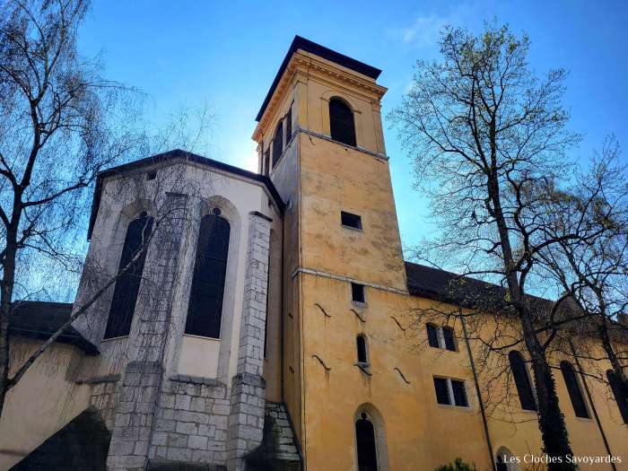 Le clocher de la cathédrale peine à rivaliser avec ses voisins, notamment la grande flèche de Notre-Dame et le beau dôme de Saint-Maurice. Là encore, l’église mère du diocèse semble avoir du mal à affirmer sa préséance sur les autres églises d’Annecy. Partiellement rasé à la Révolution, le clocher actuel fut reconstruit en 1828 avec les deniers de toutes les communes du diocèse et particulièrement de la ville d’Annecy. On remarquera, contrairement à ses voisins, que sa toiture est fort discrète : un simple toit à quatre pans l’achève, quand ses voisins sont dotés de puissantes flèches ou de dômes.